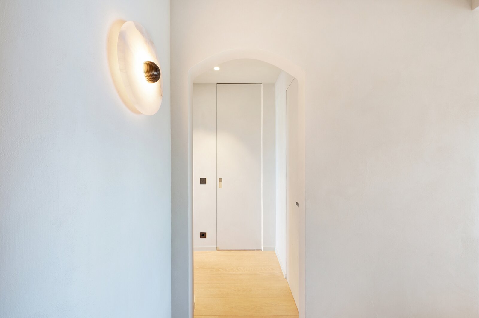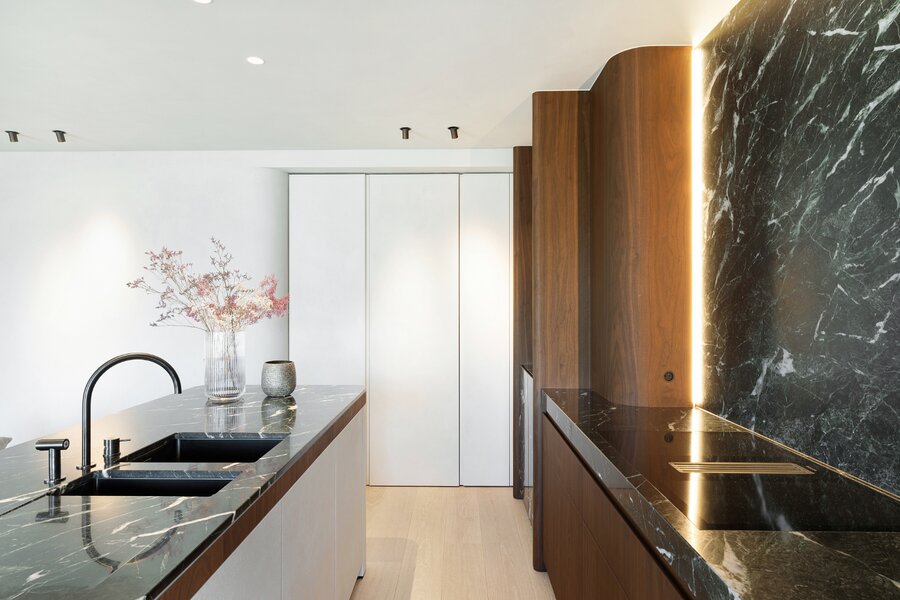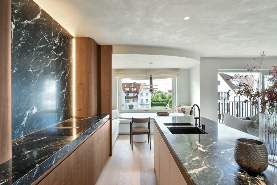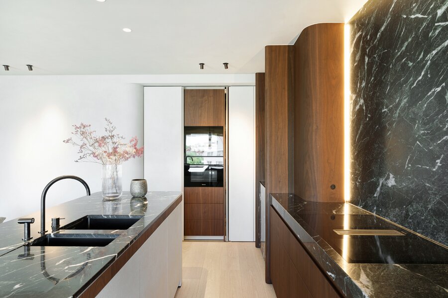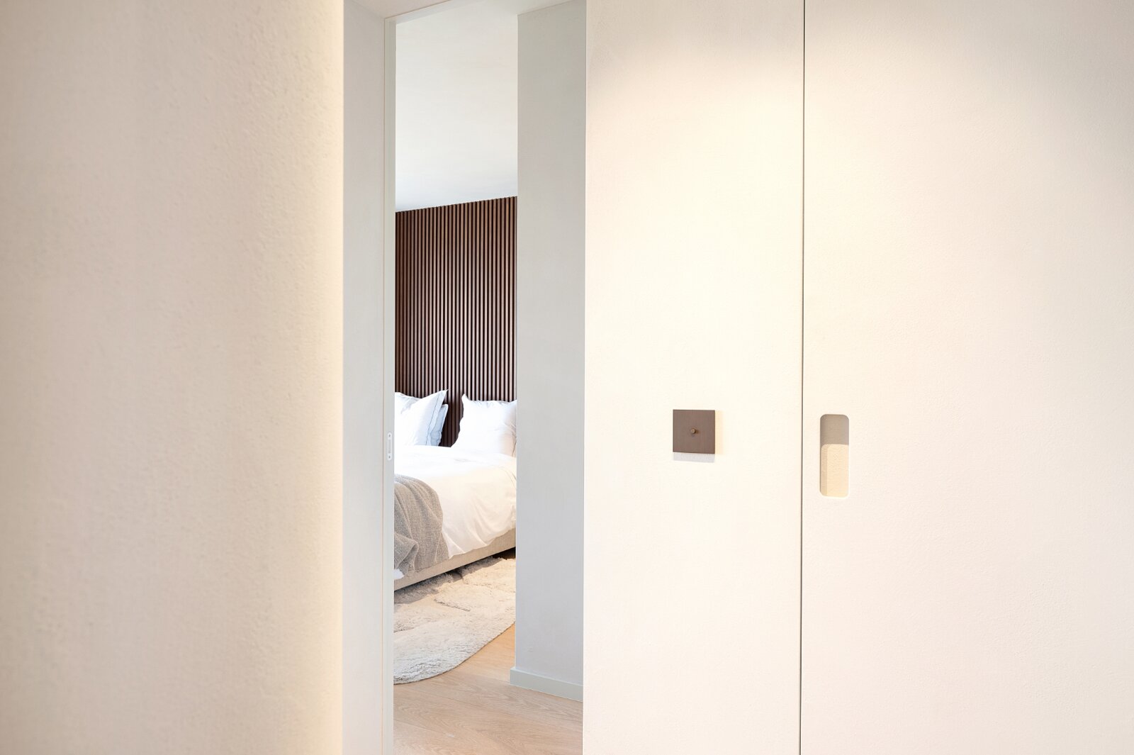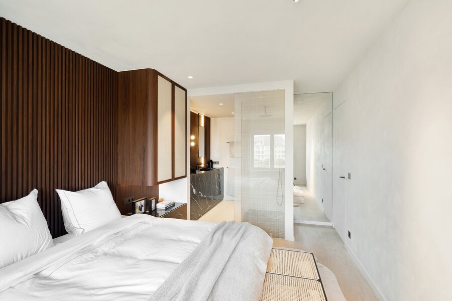 Bij binnenkomst een ruime inkomhal met vestiaire en gastentoilet. De indrukwekkende leefruimte van meer dan 7 meter breed beschikt over een elegant salon met gashaard en opent naar een zonneterras met middag- tot ondergaande zon. De volledig in marmer uitgevoerde leefkeuken (Miele-toestellen) biedt een gezellige eethoek met geïntegreerde zitbank – perfect voor intieme diners of ontvangst van gasten.