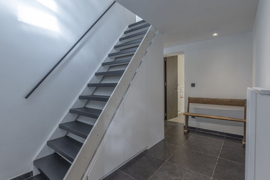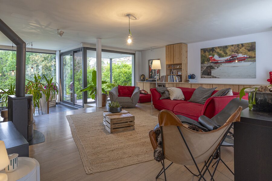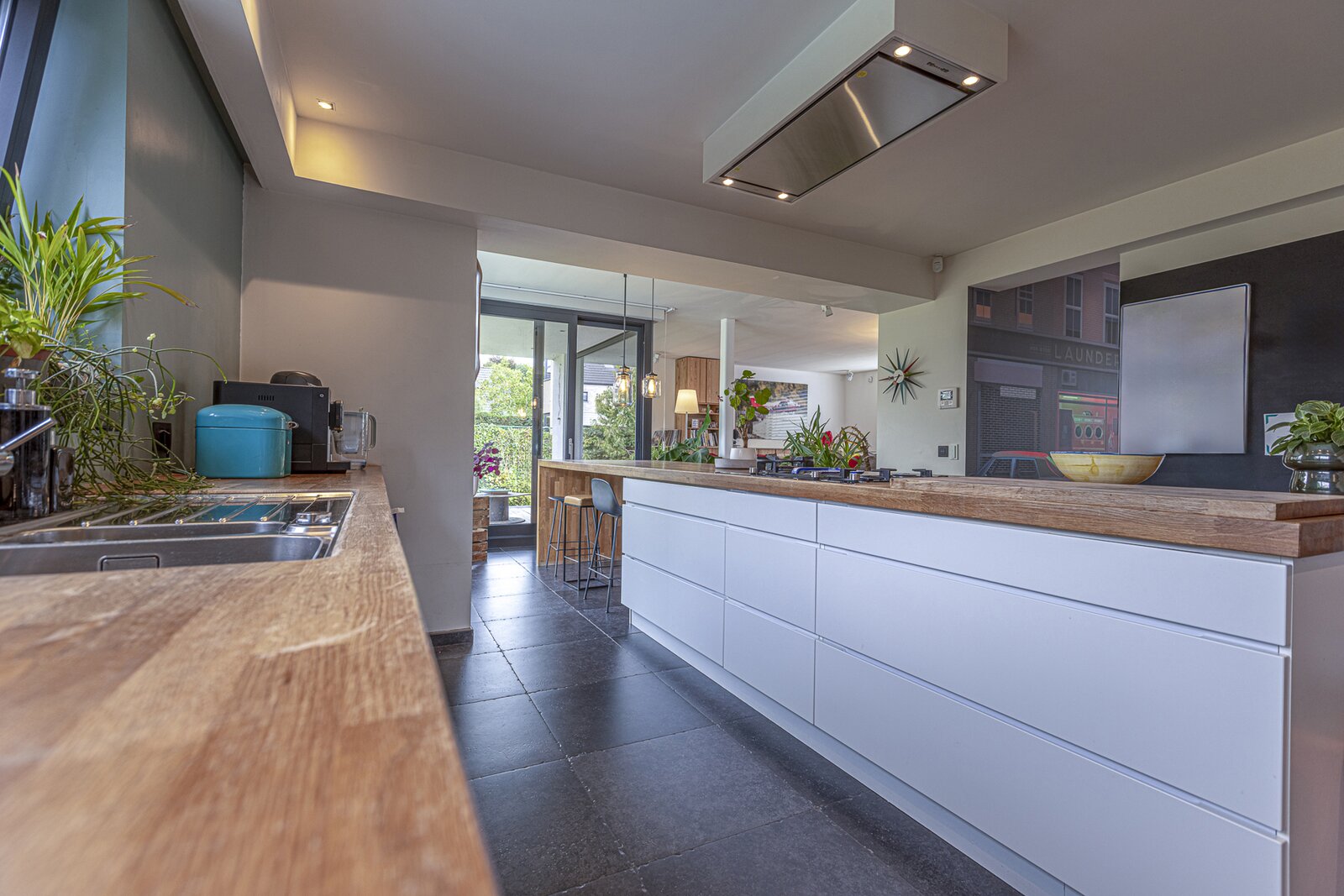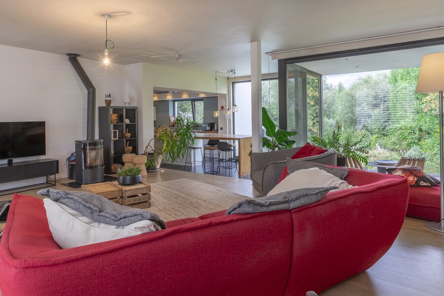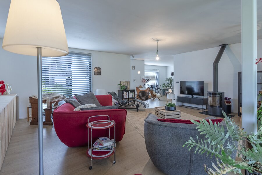 De leefruimte is voorzien van grote eetplaats, een gezellige en toch ruim salon met houtkachel, prachtig zicht op tuin en de achtergelegen groenzone. Deze plaatsen geven elk uit op een leuk terrasje en de grote volledig geinstalleerde keuken met ontbijt-eethoek.