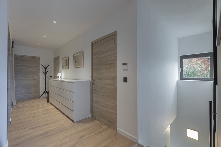 De verdieping voorziet in een ruime hall met uitzicht, 3 ruime slaapkamers (op te splitsen tot 4 slaapkamers) waarbij master-bedroom met terras, plek voor dressing en eigen badkamer voorzien van wasmeubel en ligbad. Een aparte douchekamer en toilet is ook terug te vinden op deze etage.