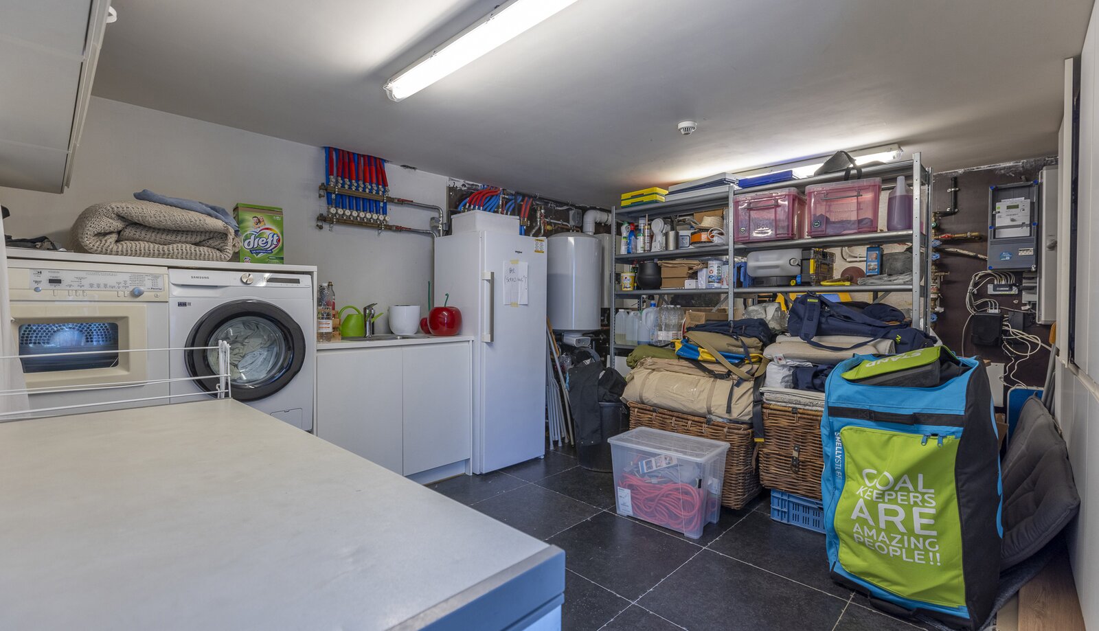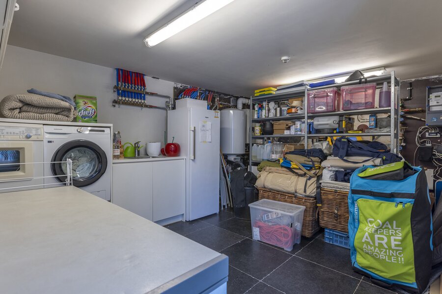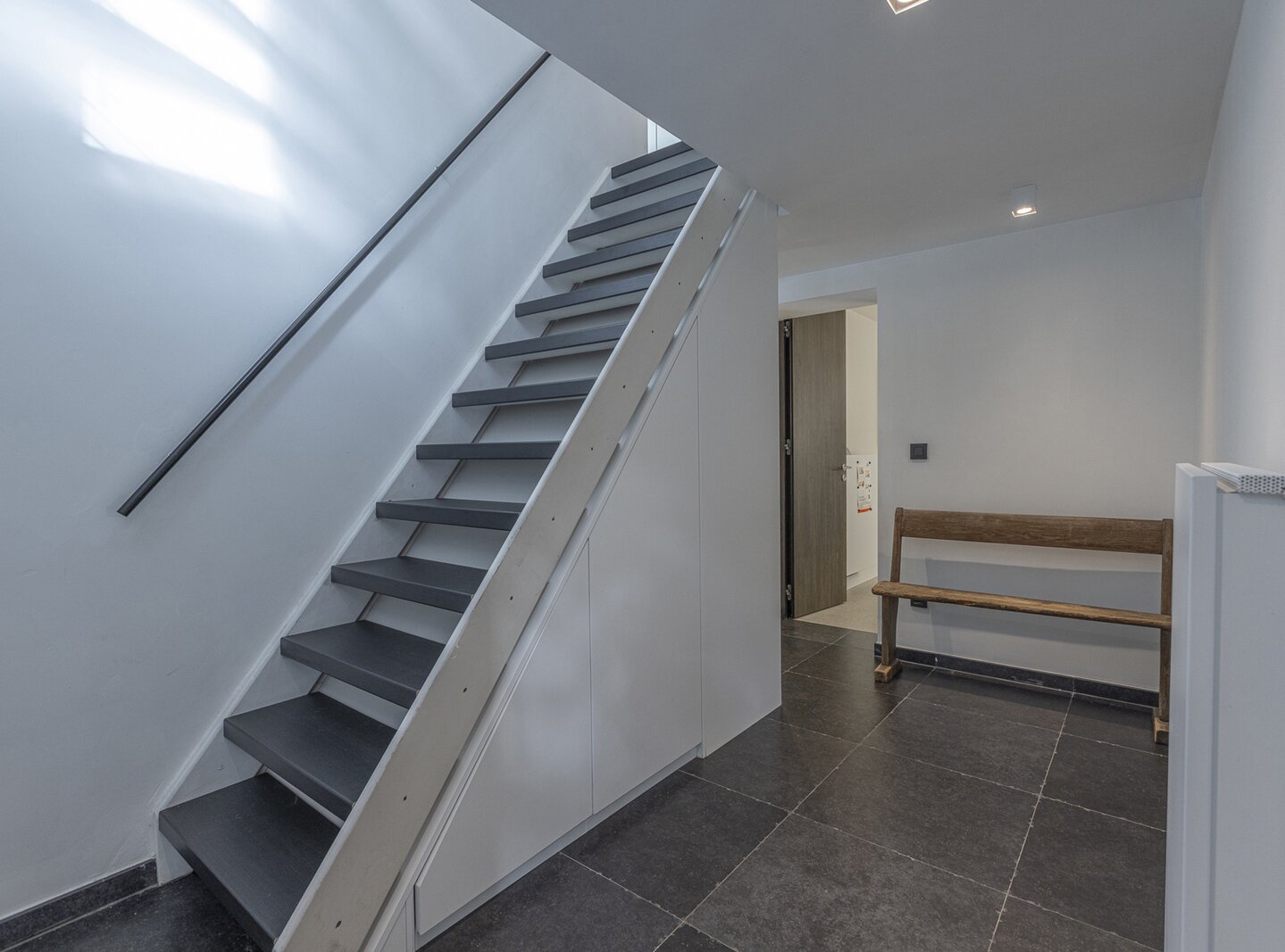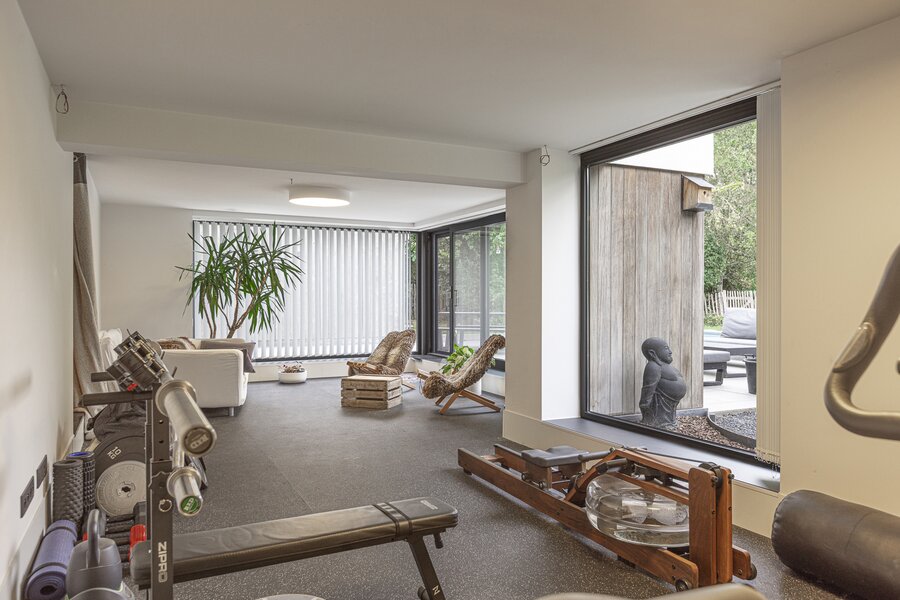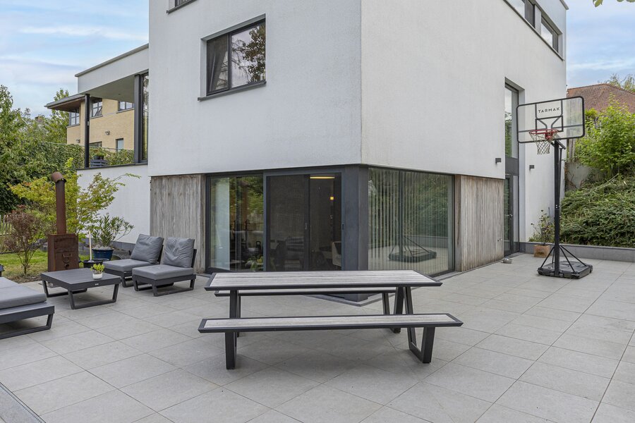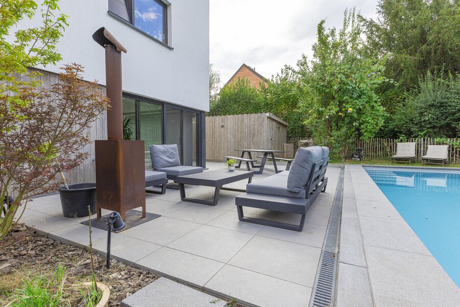 Verder is op tuinniveau een grote technische berging terug te vinden en een polyvalente ruimte (sport-hobby-studio-atelier-andere) met douchehoek. Langs hier is er met schuiframen toegang tot het prachtige terras met zwembad (11 x 4.5m en vol-automatisch gestuurd).