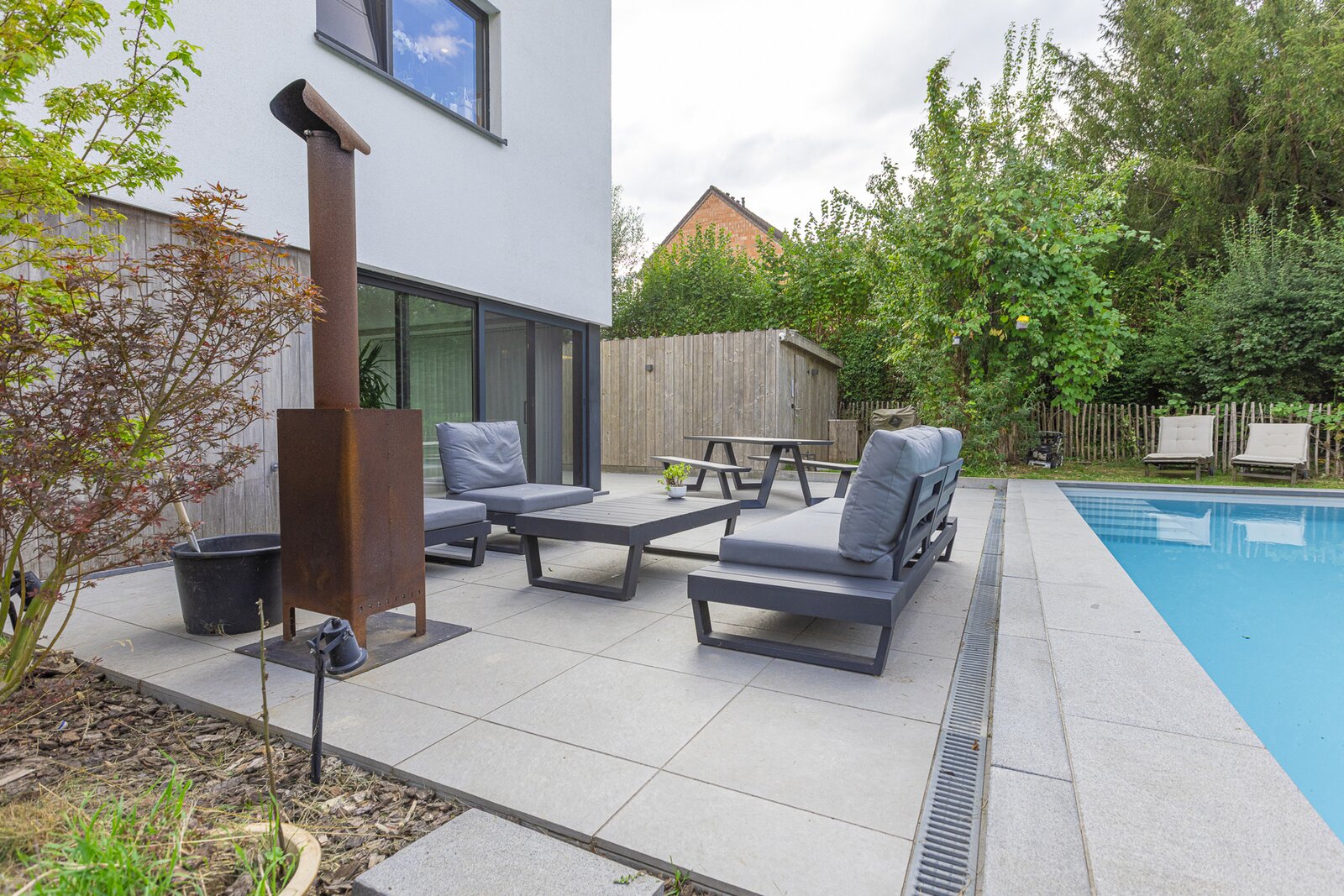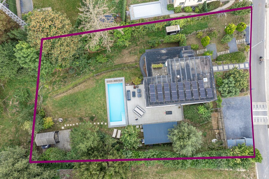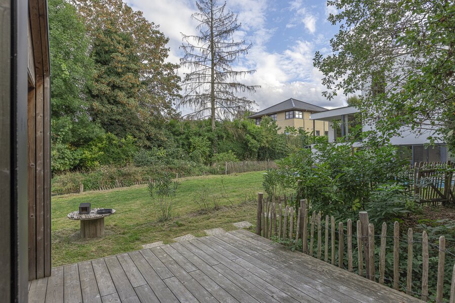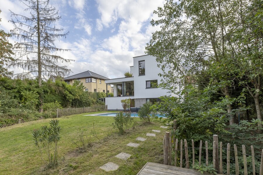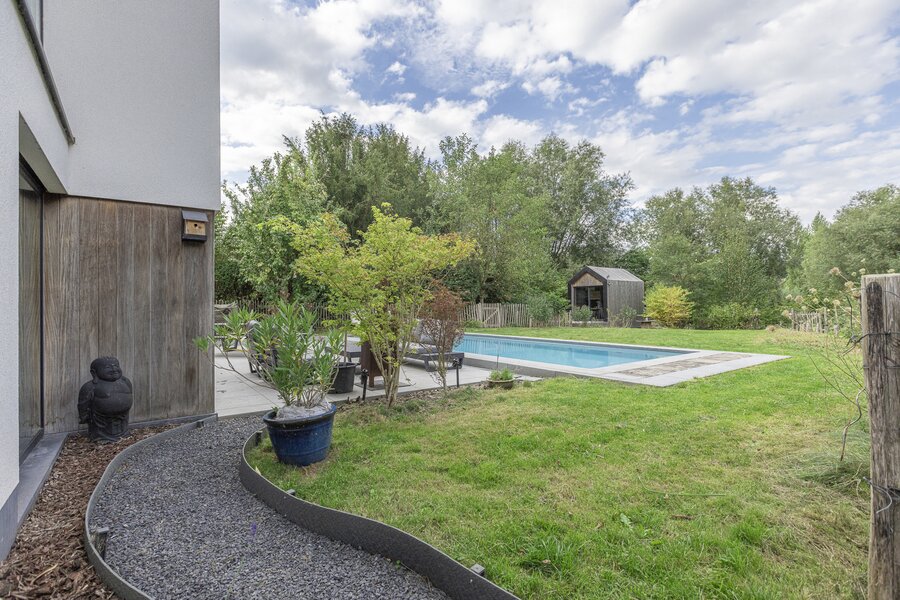 De statige woning staat op een perceel van 14a 20ca dat werd aangelegd met aandacht voor natuurlijke vormen, flora en planten.