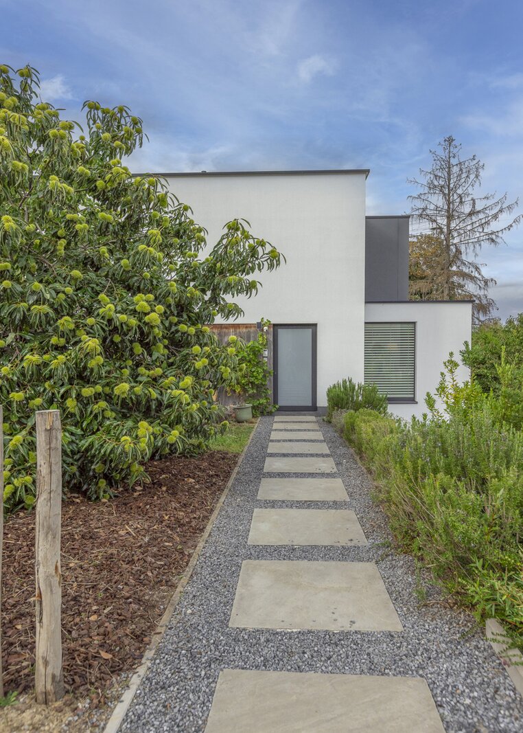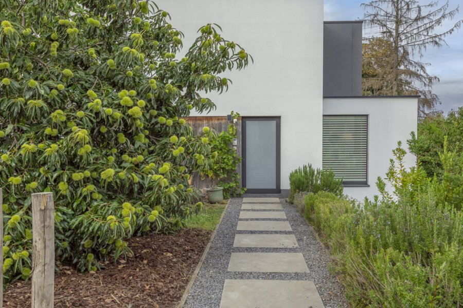 Langs de straatzijde is de woning te bereiken via de voordeur, anderzijds is de praktijkruimte/burelen ook bereikbaar met extra toegangsdeur langs een mooi paadje.