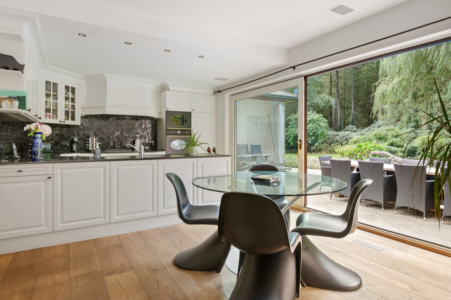 De inkomhal, afgewerkt met Bourgondische dals en voorzien van ingemaakte kasten, straalt klasse uit. De smeedijzeren trap geeft extra charme en leidt naar een lichtrijke leefruimte met grote raampartijen en zicht op het terras en zwembad. De gezellige inbouwcassette zorgt voor warmte in de winter, terwijl de schuiframen in de zomer buiten en binnen verbinden. De hyper uitgeruste keuken vormt het hart van de woning en sluit aan bij een praktische bijkeuken/wasplaats.
