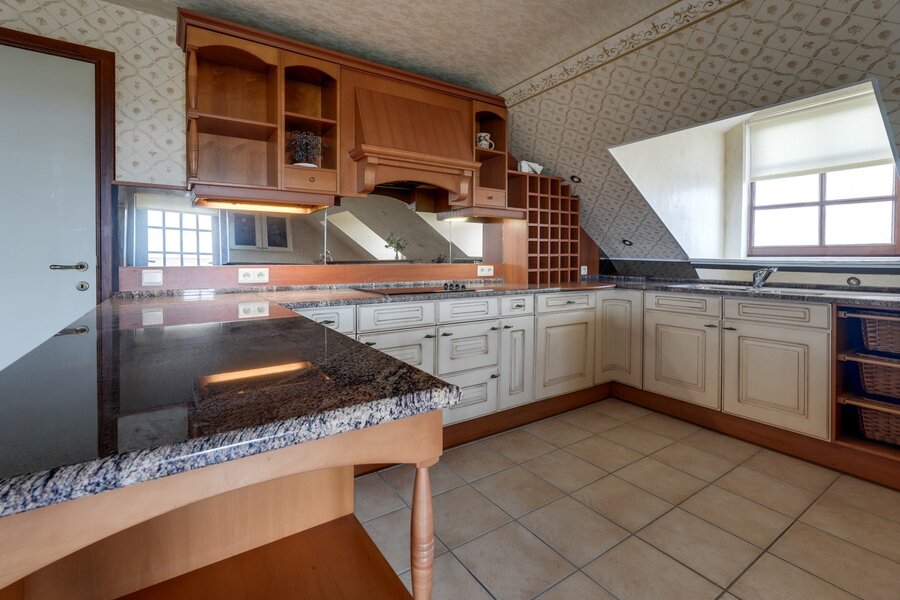 De inkomhal met natuurstenen trap geeft toegang tot royale, lichtrijke ruimtes met verfijnde afwerking. De ruime ontvangstruimtes bieden een aangename en serene sfeer. De recent ingerichte keuken is ruim, volledig uitgerust en beschikt over een gezellige eethoek.