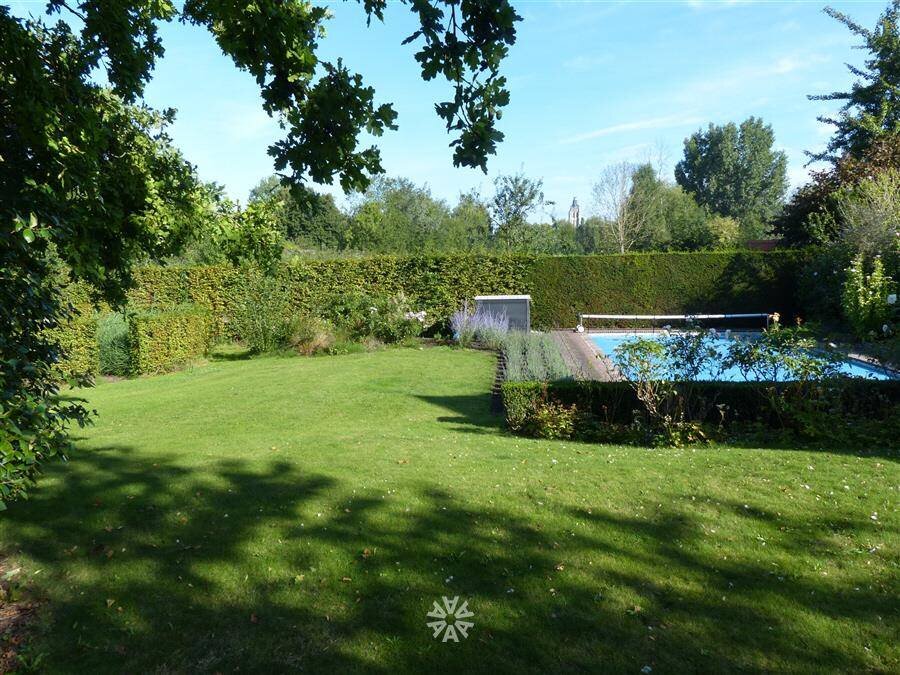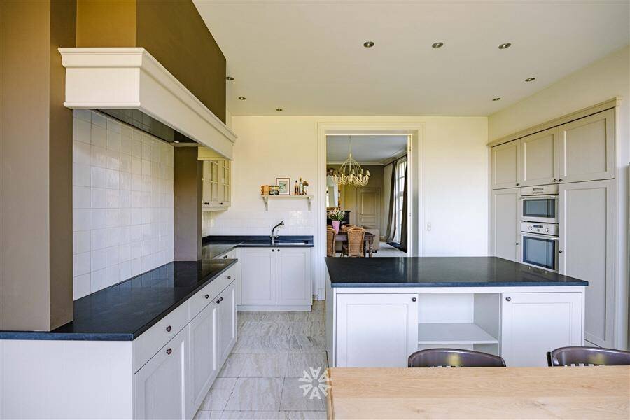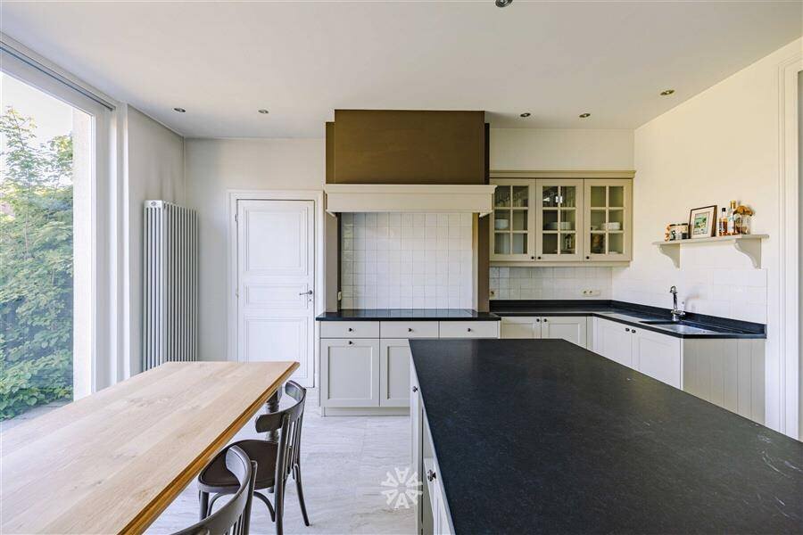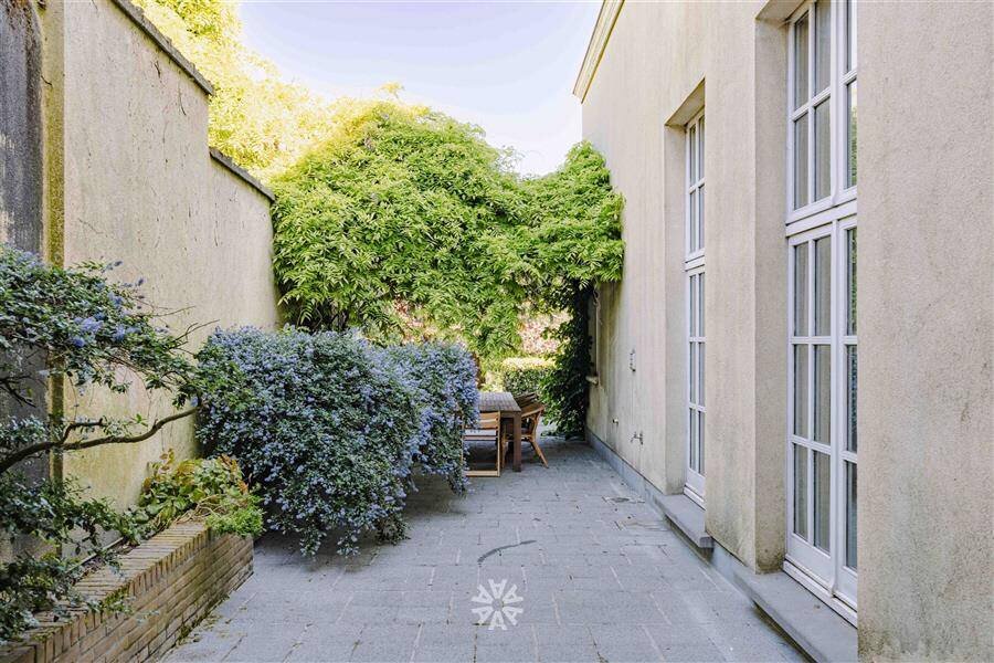 Via de koetsingang betreden we de woning langs de imposante inkomhal. De riante leef- en eetruimte en de volledig ingerichte kwaliteitskeuken (Frank Tack) met eiland, granieten werkblad, toestellen van ATAG en Miele. De keuken biedt directe toegang tot het terras en de tuin die volledig is afgeschermd en zo een ongezien privacy en luxe biedt in het centrum van de stad. Het zwembad en het koetshuis liggen middenin deze groene oase.