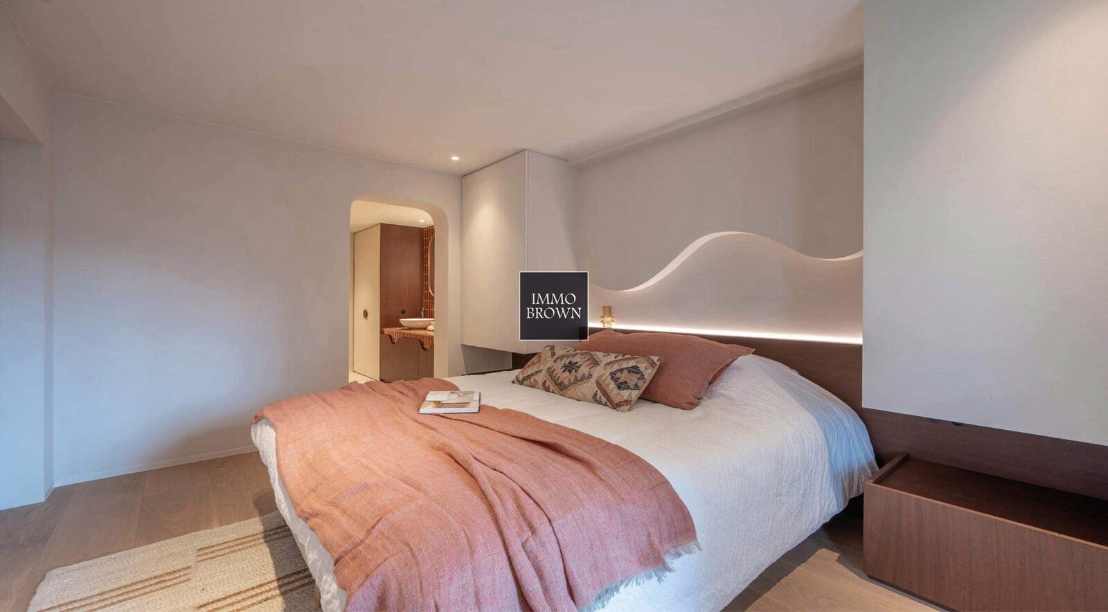 De master bedroom beschikt over maatwerk-inbouwkasten en een luxueuze ensuite badkamer met dubbele wastafel, vrijstaand bad, inloopdouche en toilet.