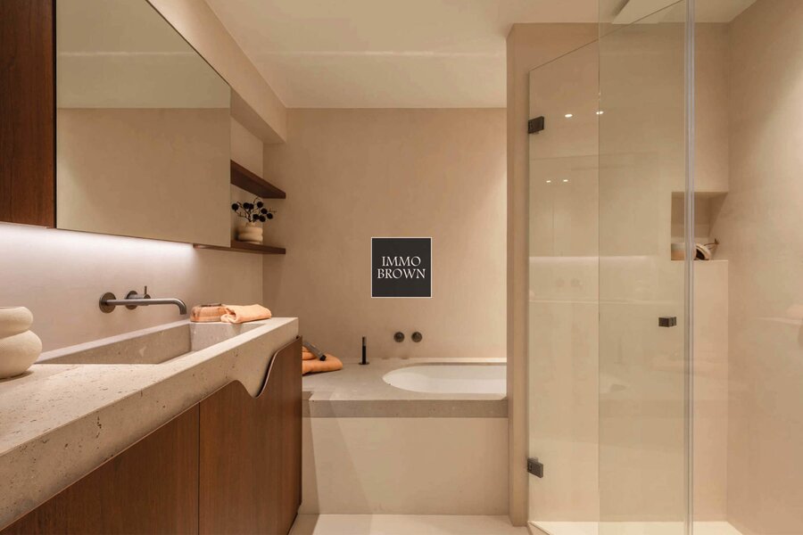 De open keuken is uitgerust met hoogwaardige Miele-toestellen en afgewerkt met een verfijnd werkblad in Italiaanse natuursteen (Pietra Bicci). Aansluitend bevindt zich een praktische berging/wasplaats.