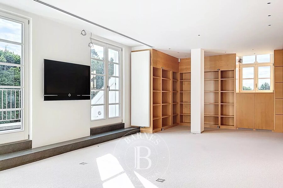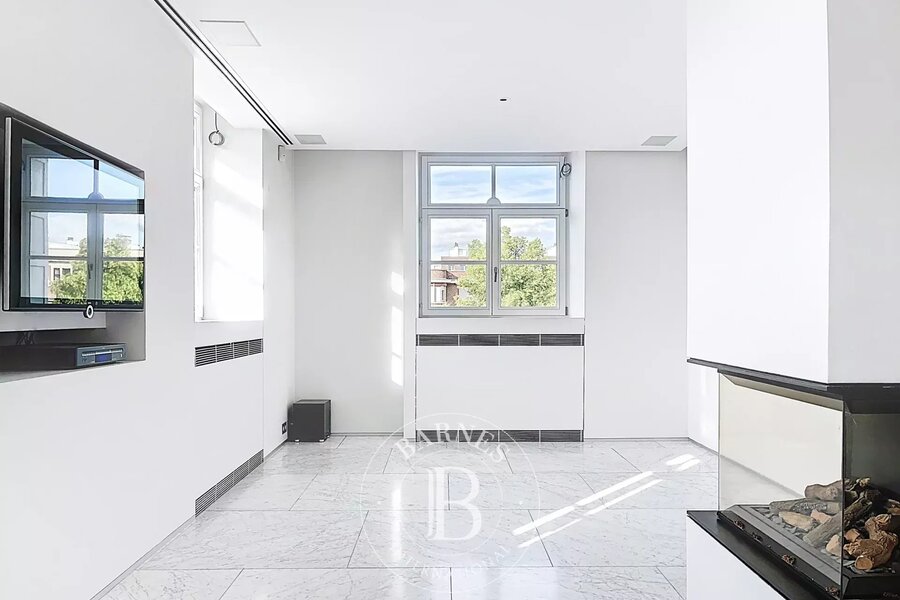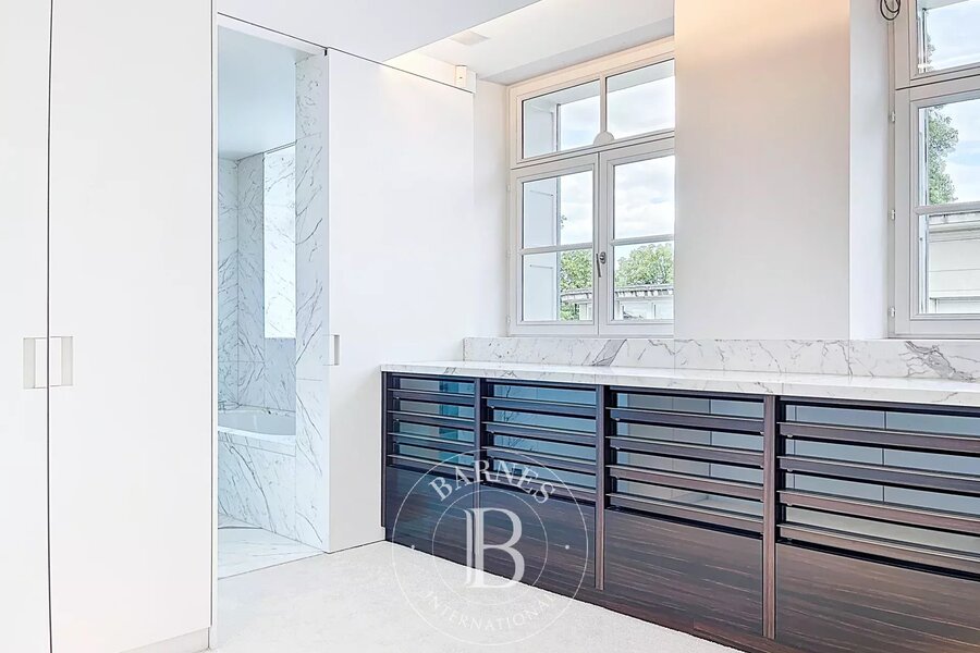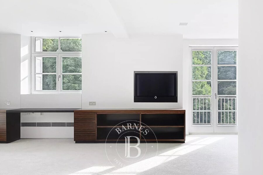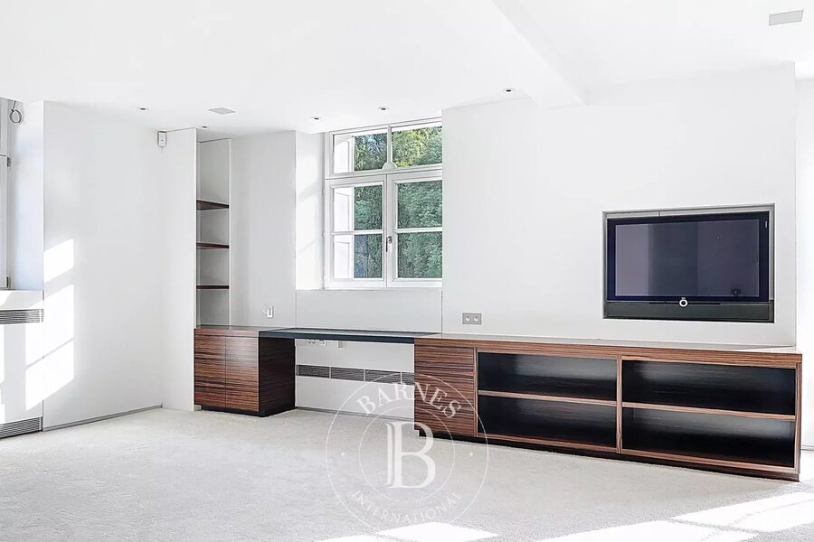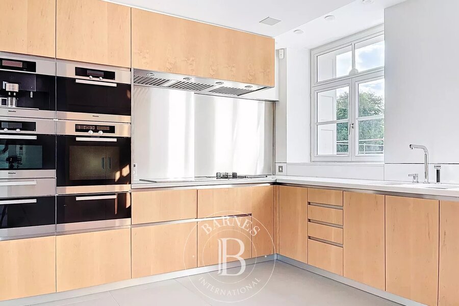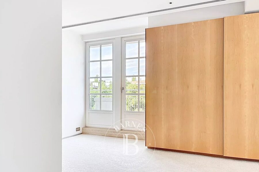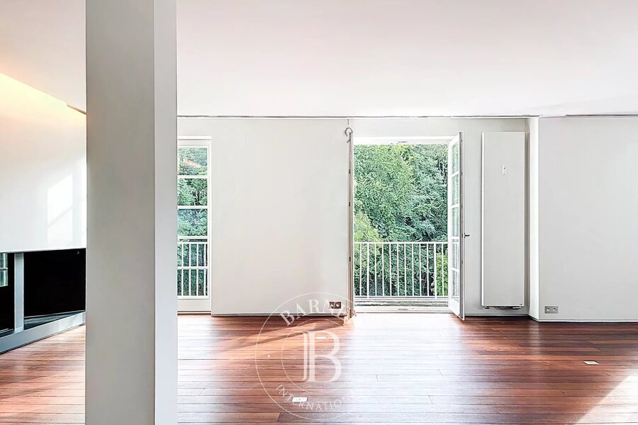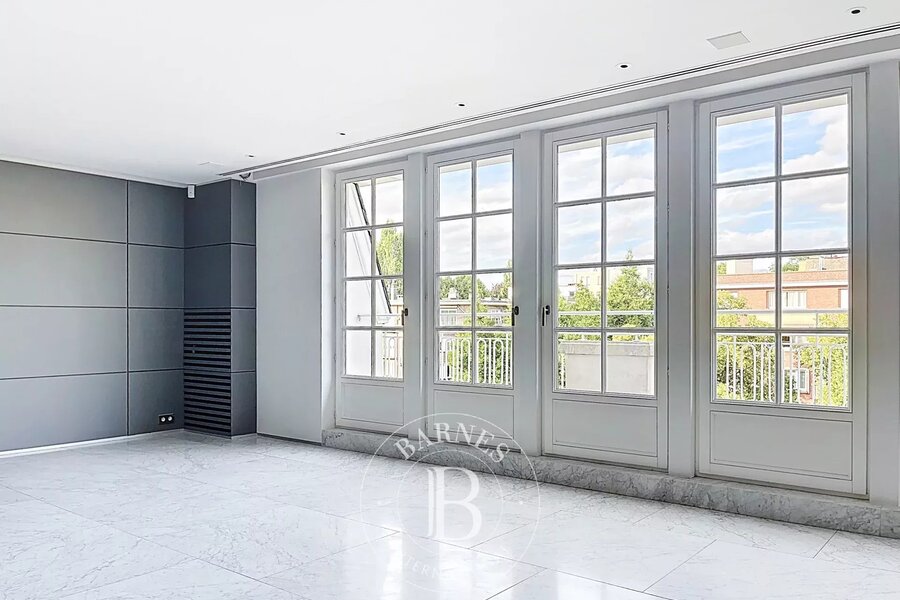 Op de bovenverdieping geeft een tweede woonkamer met aparte kitchenette toegang tot het tweede terras, dat een nog vrijer uitzicht biedt op de bomen in het Bois.