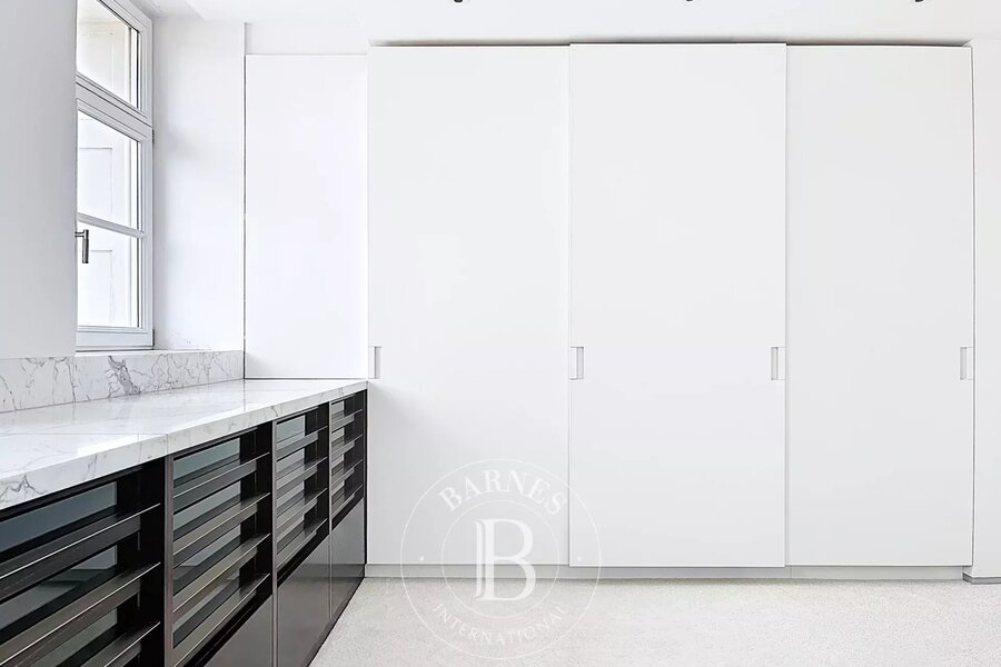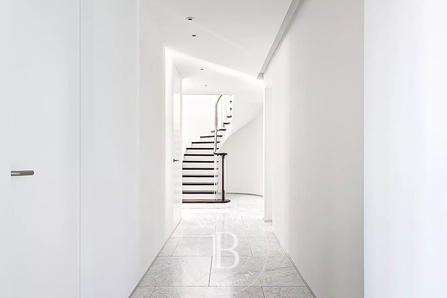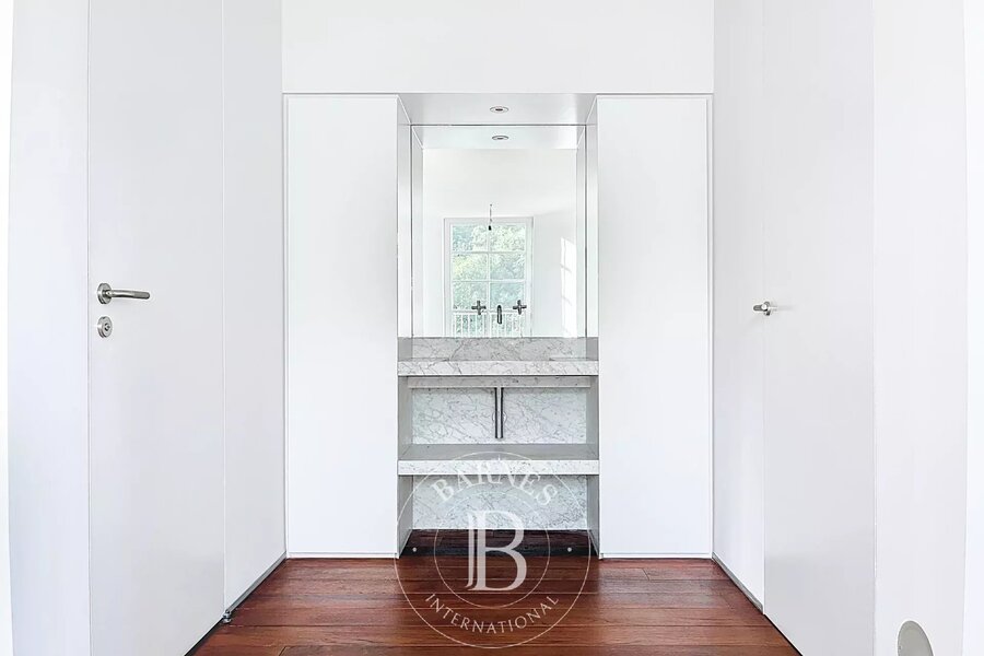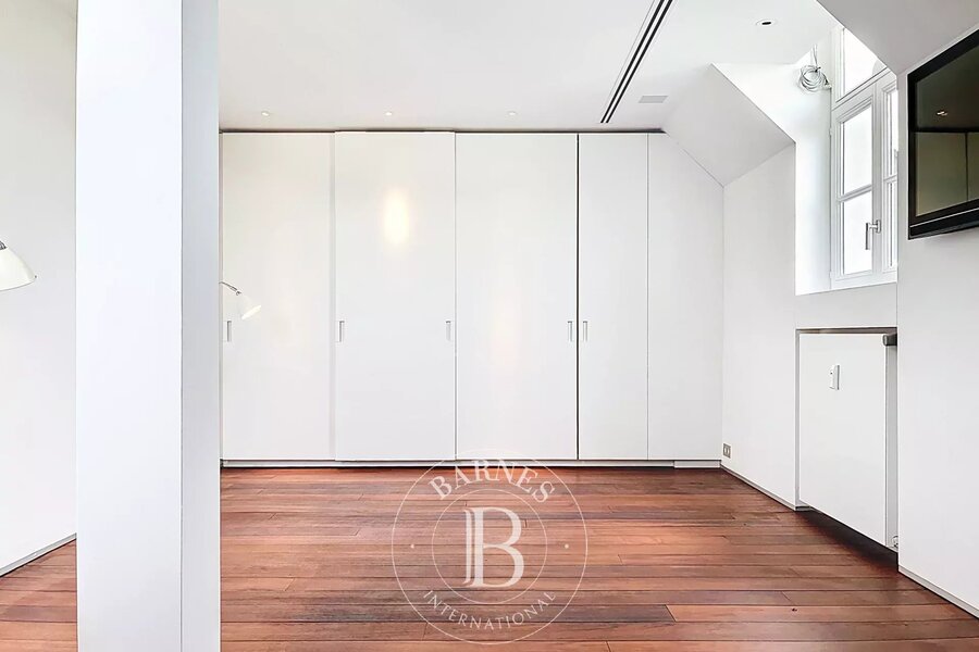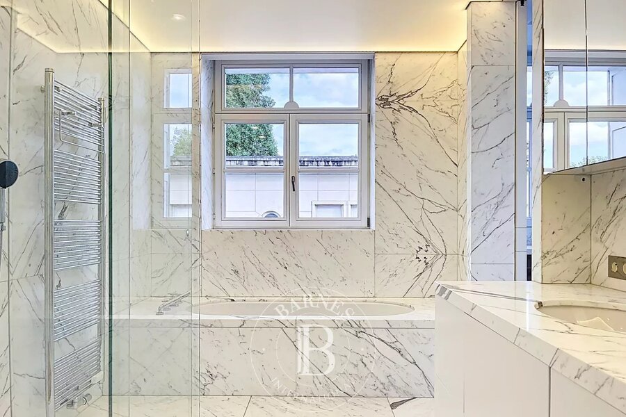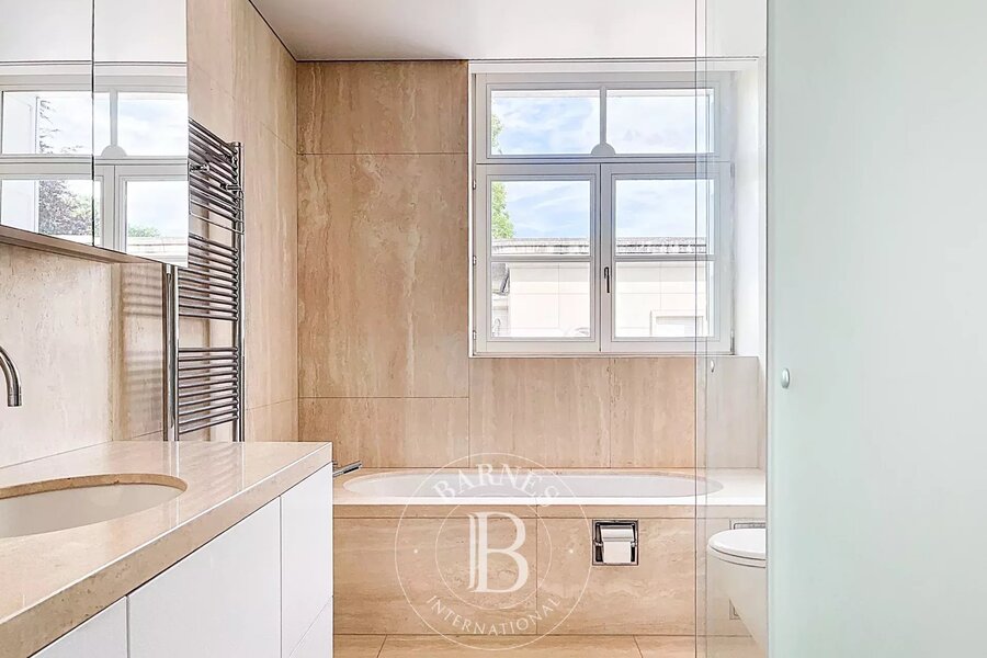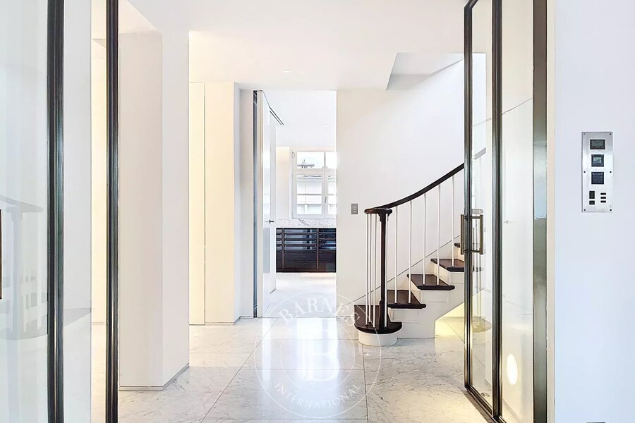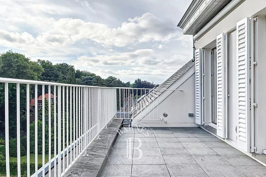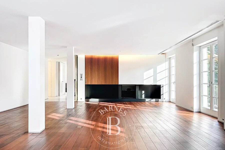 Op de bovenverdieping geeft een tweede woonkamer met aparte kitchenette toegang tot het tweede terras, dat een nog vrijer uitzicht biedt op de bomen in het Bois.