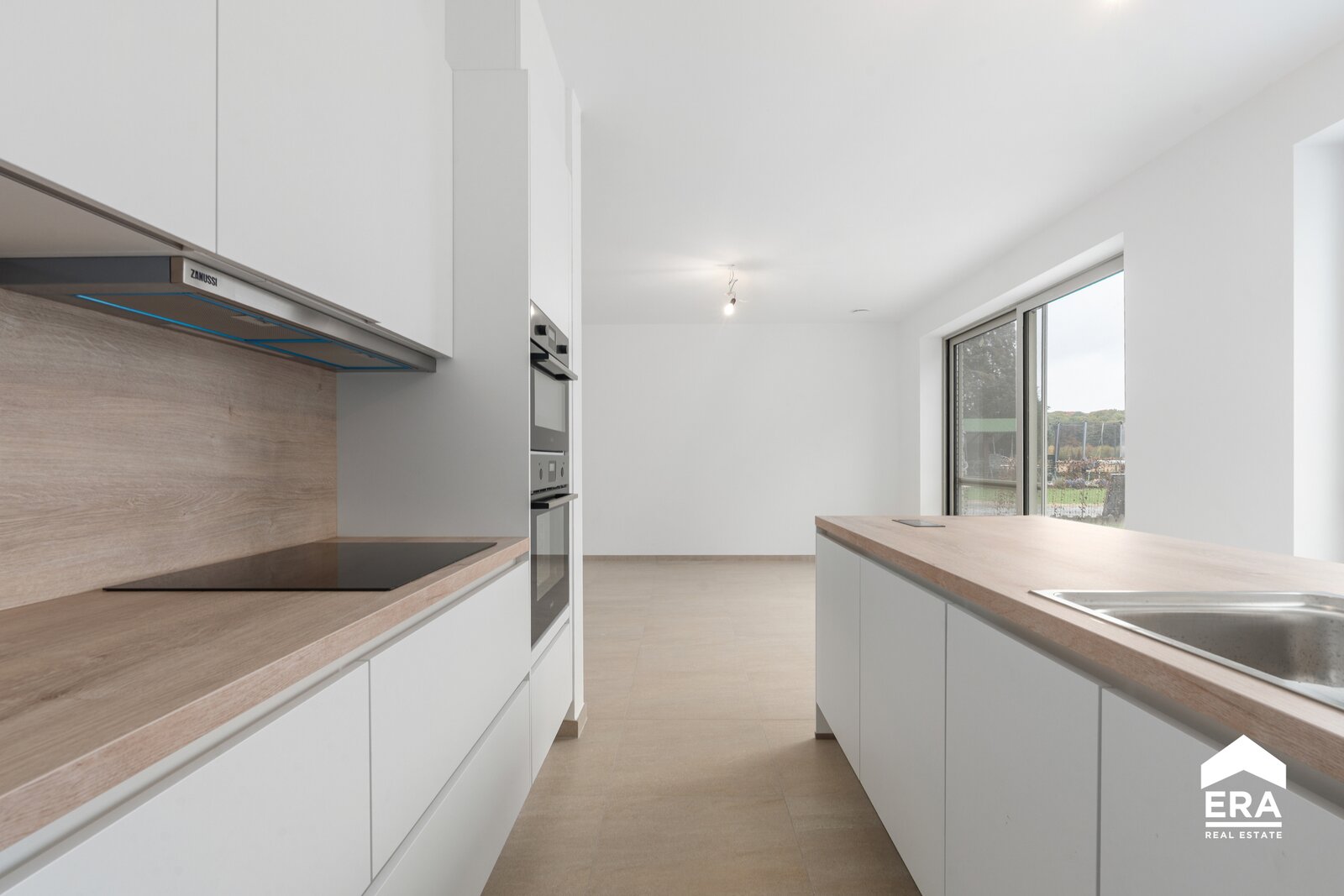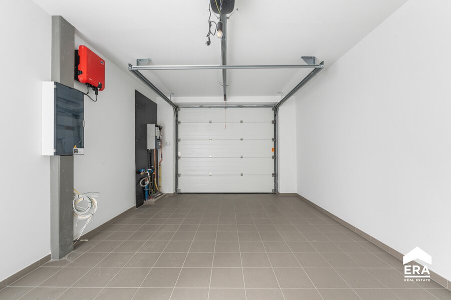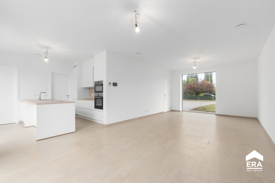 Een ruime inkomhal met gastentoilet verwelkomt je in de woning. De lichte woonkamer, eetruimte en open keuken (uitgerust met inductiekookplaat, koelkast, oven, …) bieden een prachtig uitzicht op de noordelijk georiënteerde tuin.