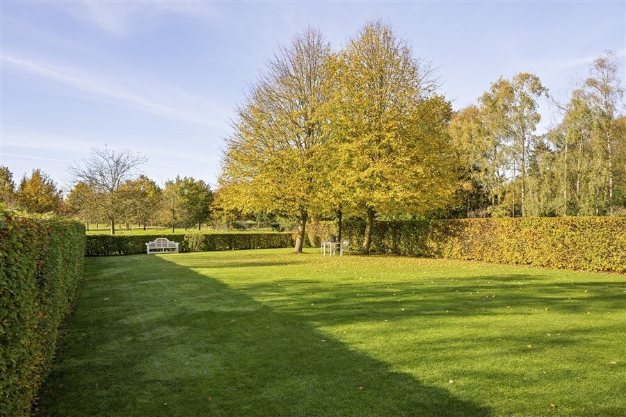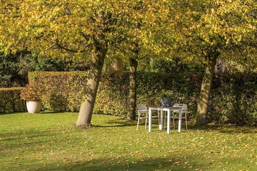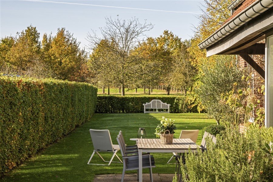 De tuin is een echte troef: een groen gazon, volwassen bomen, gezellige zithoeken en hoge hagen zorgen voor maximale privacy.