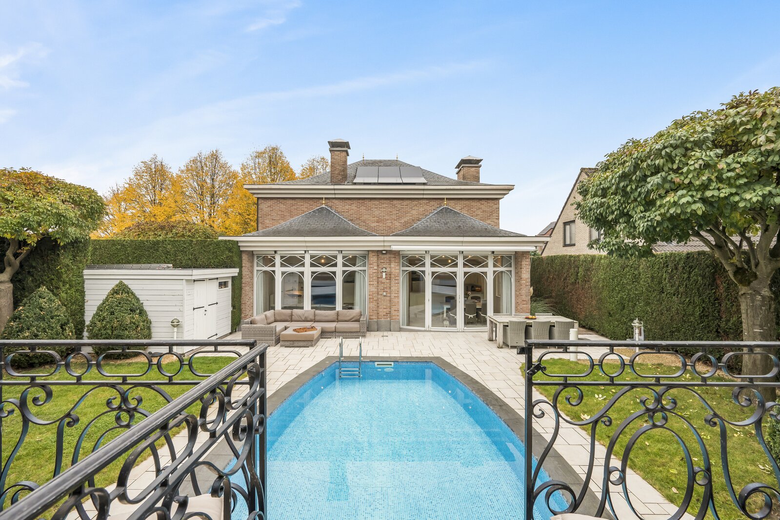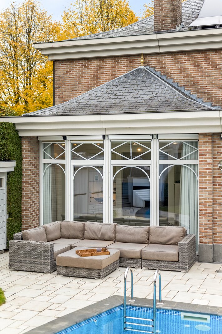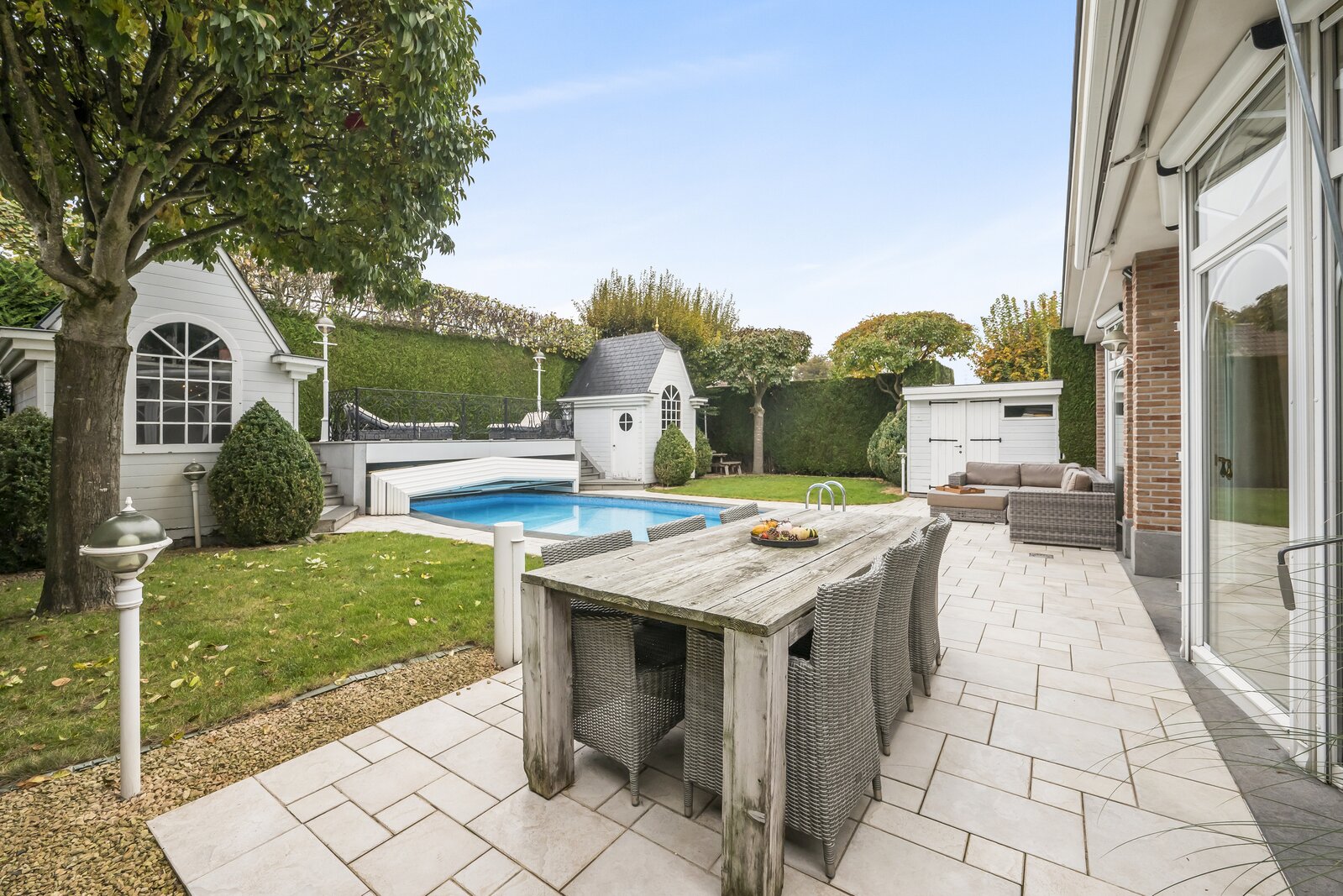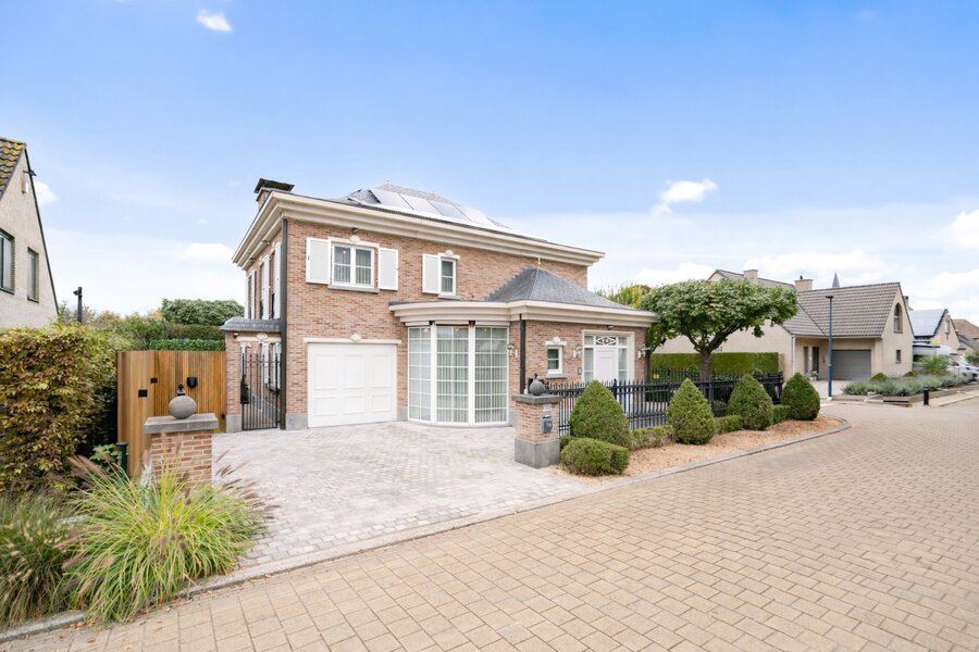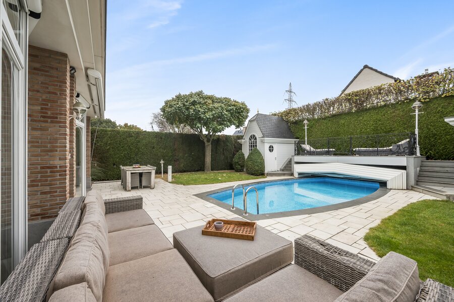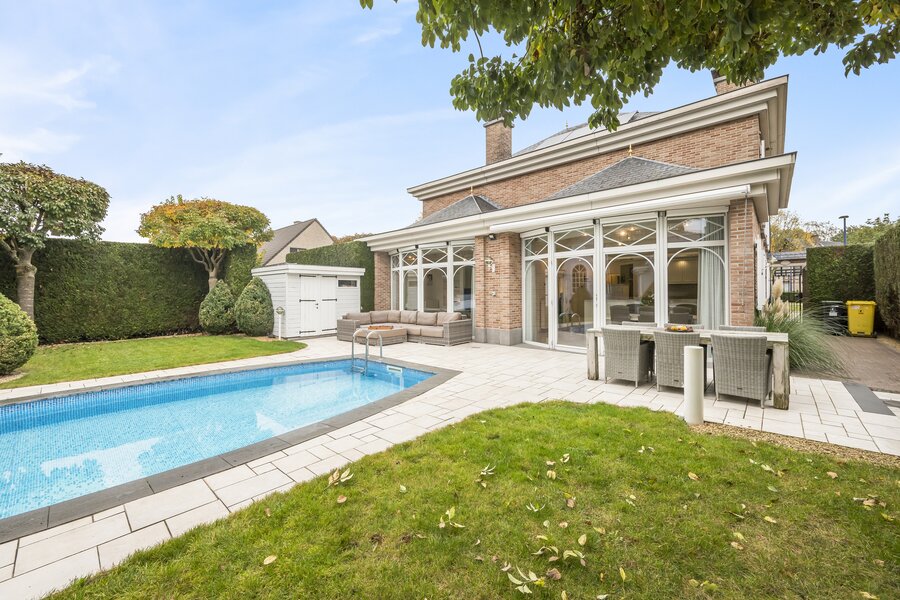Deze open bebouwing uit 1998 in Franse Pastoriestijl biedt tijdloze charme en modern comfort. Volledig omheind met sierhekwerk en hoge hagen voor maximale privacy. De zonnige tuin beschikt over een verwarmd zwembad met poolhouse en vier tuinhuizen.