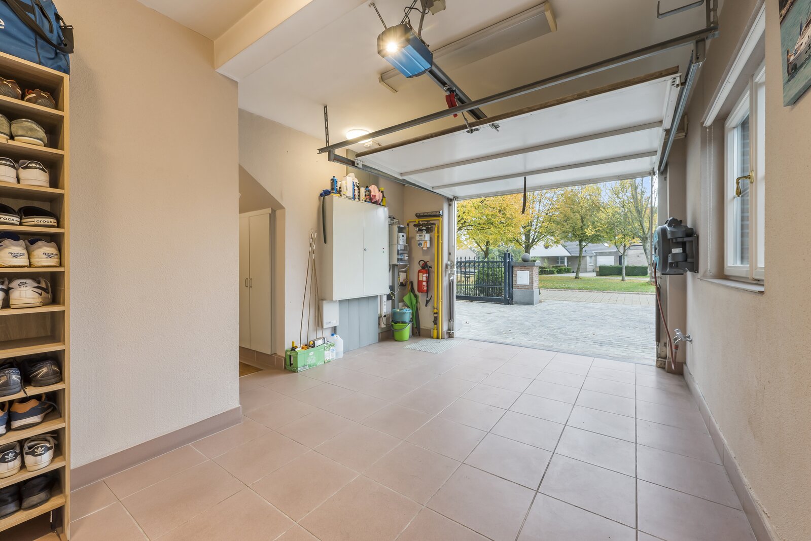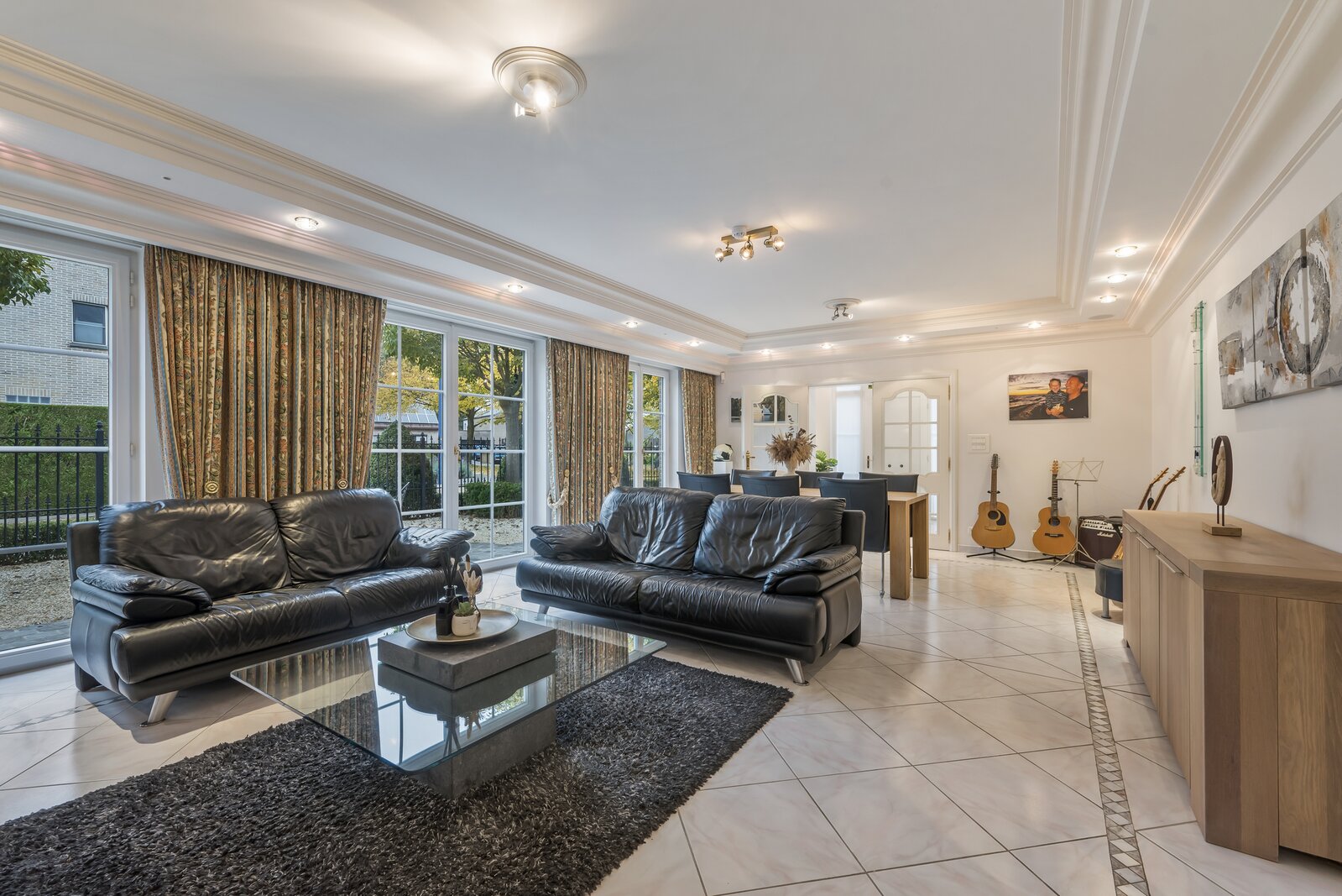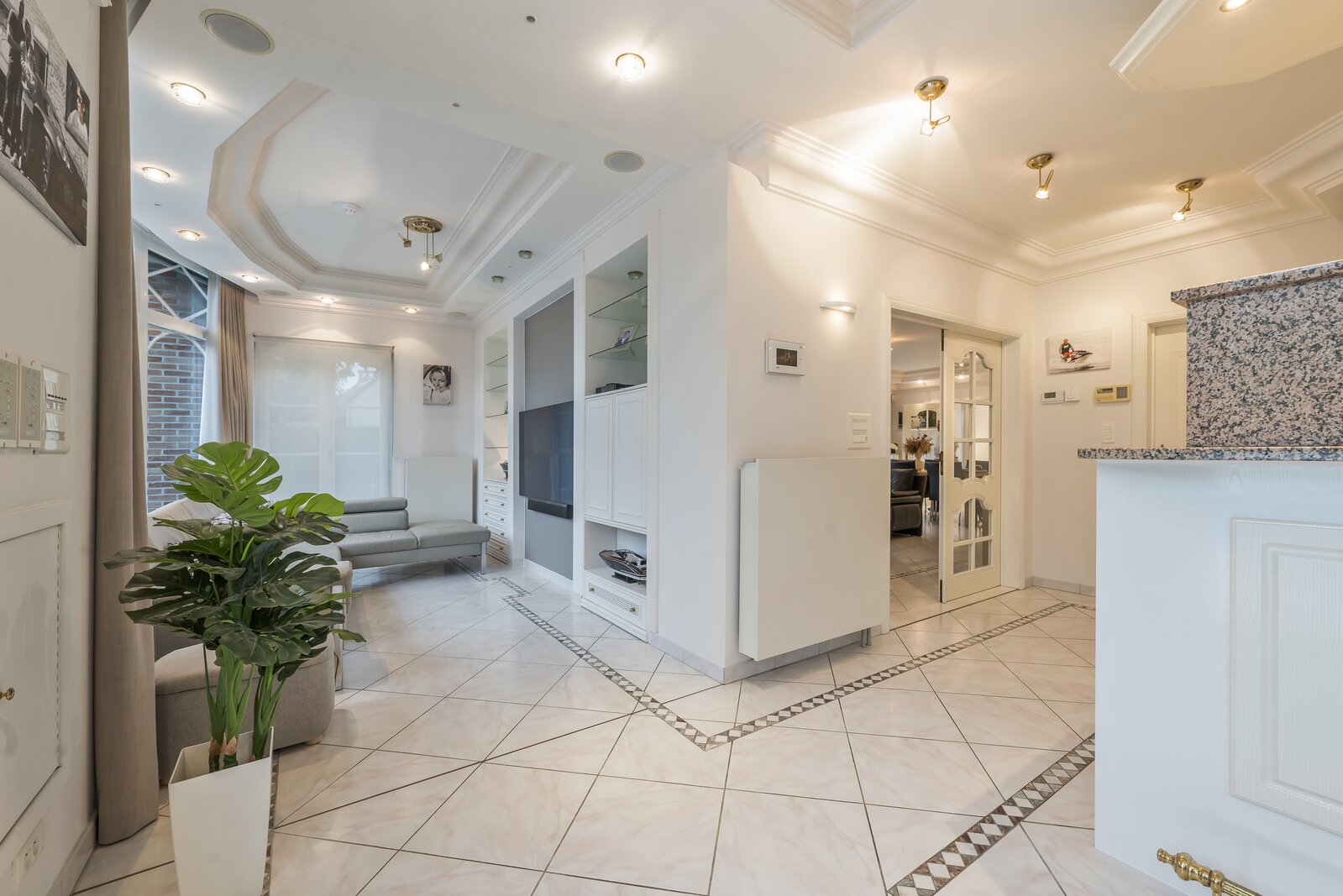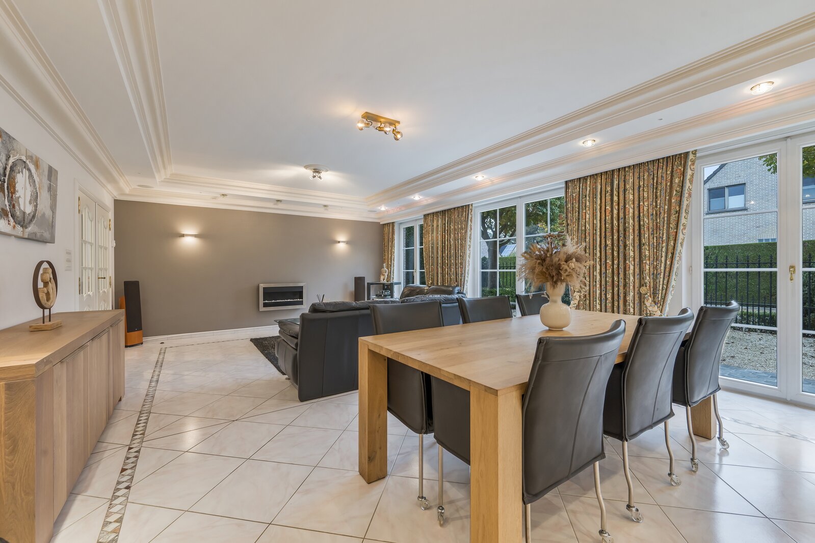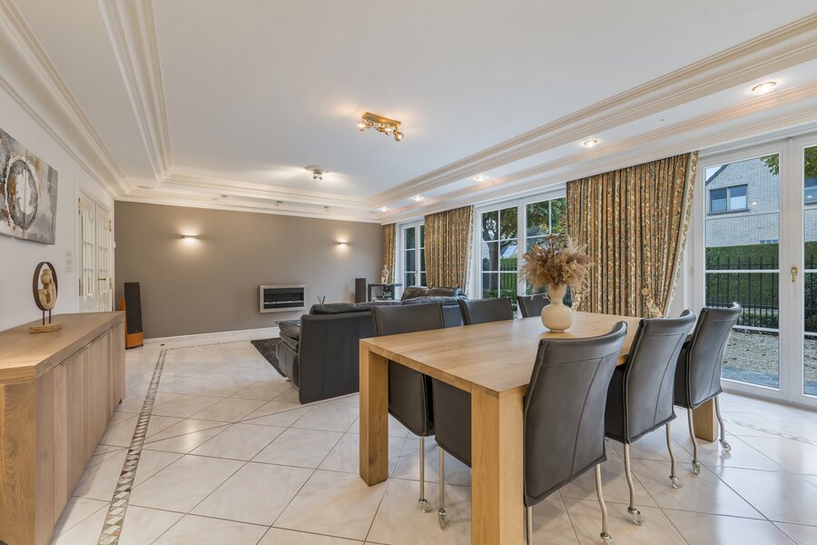 De woning verwelkomt met een imposante inkomhal, hoog plafond, gastentoilet en een natuurstenen trap. Dubbele deuren openen naar een lichtrijke leefruimte met handgemaakte mouluren. Aansluitend ligt de volledig uitgeruste keuken met kwartsgranieten werkblad en zicht op de tuin. Verder is er een wasplaats en inpandige garage met elektrische poort.