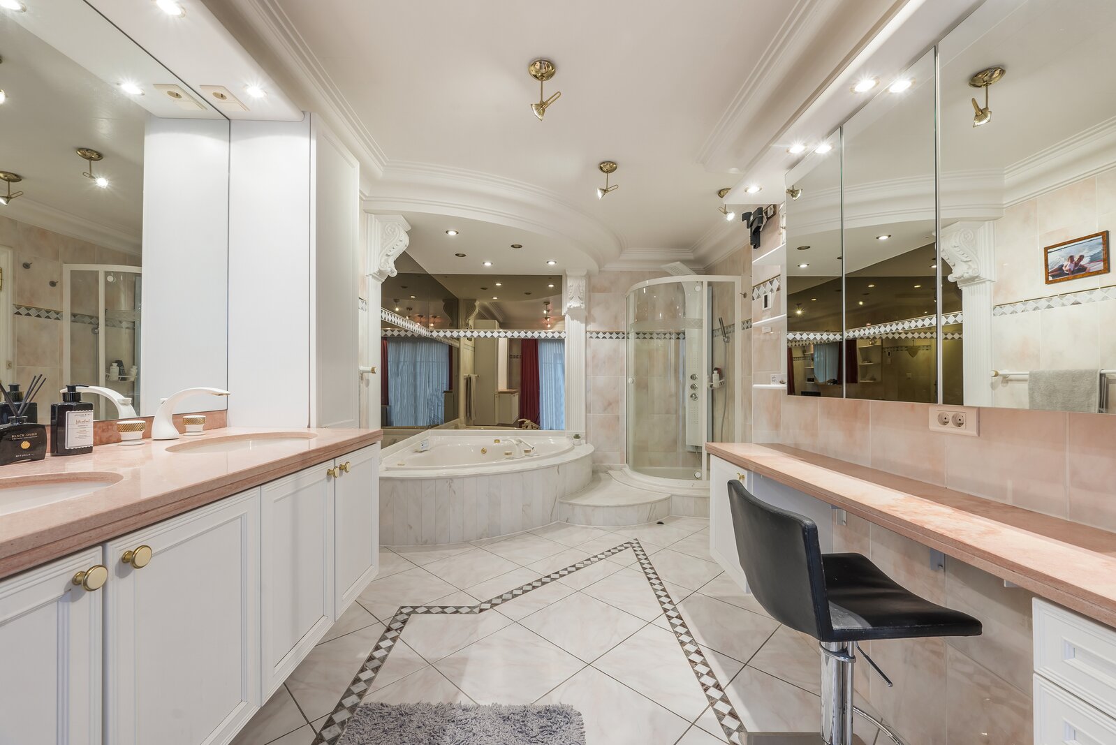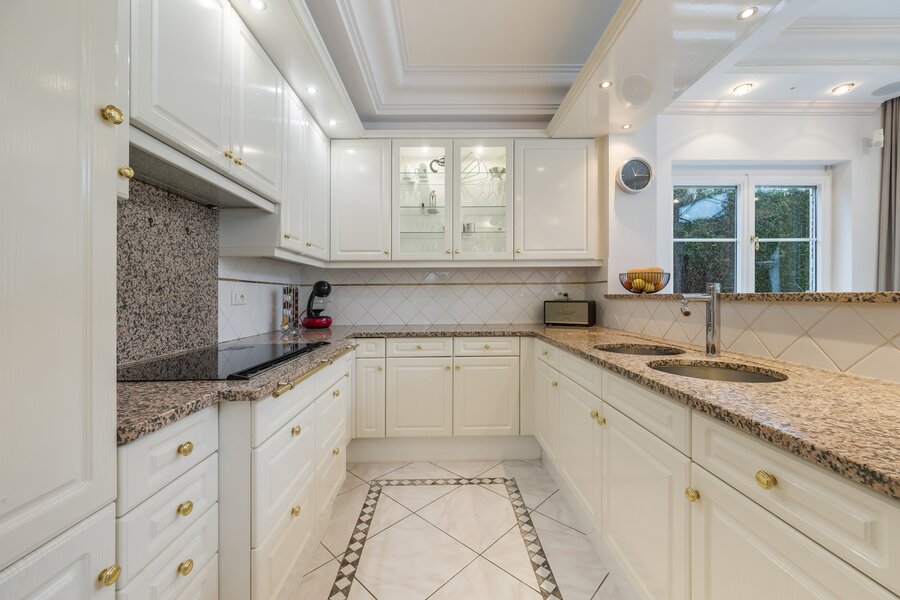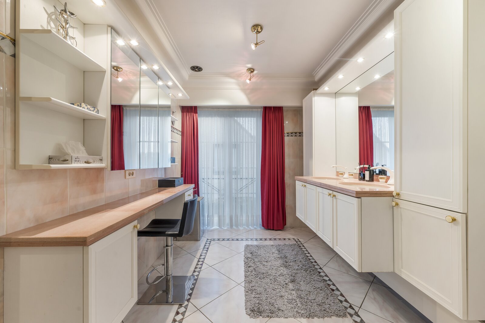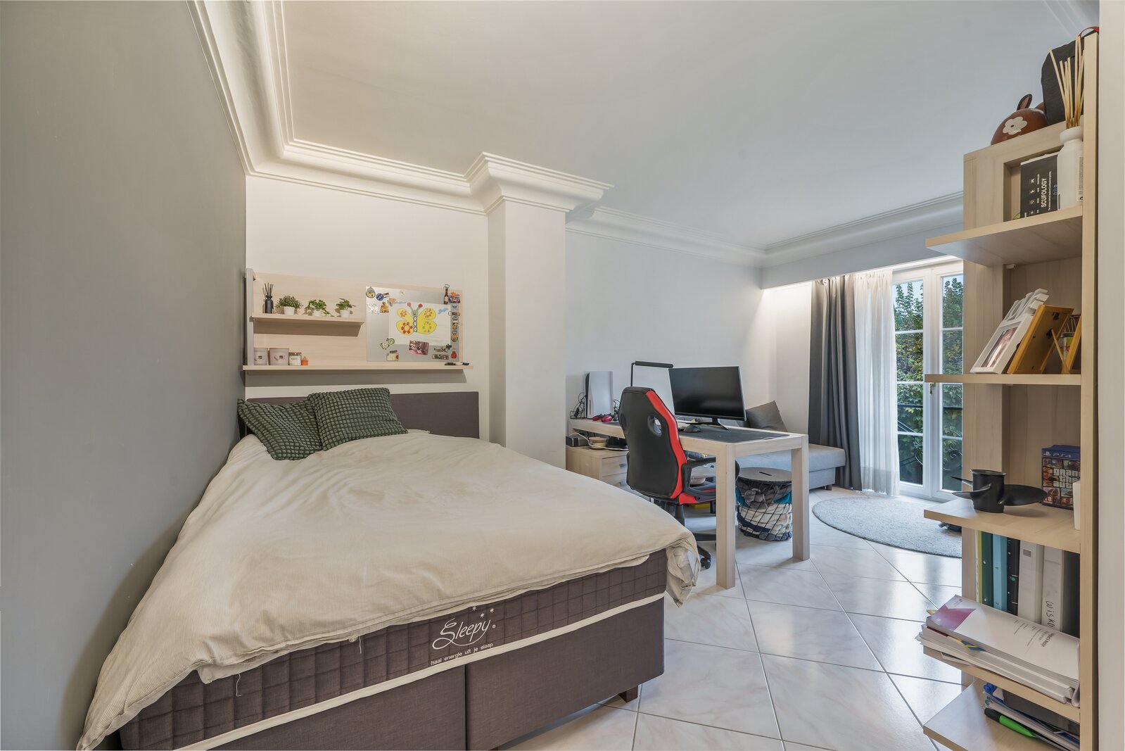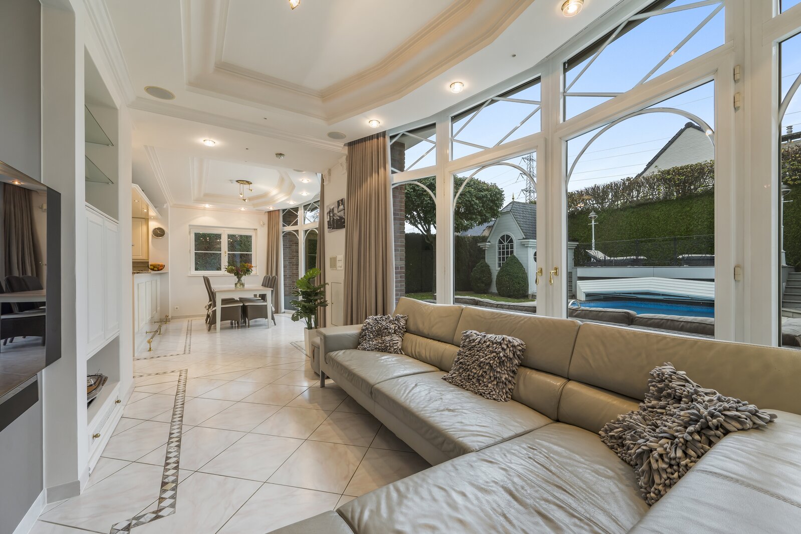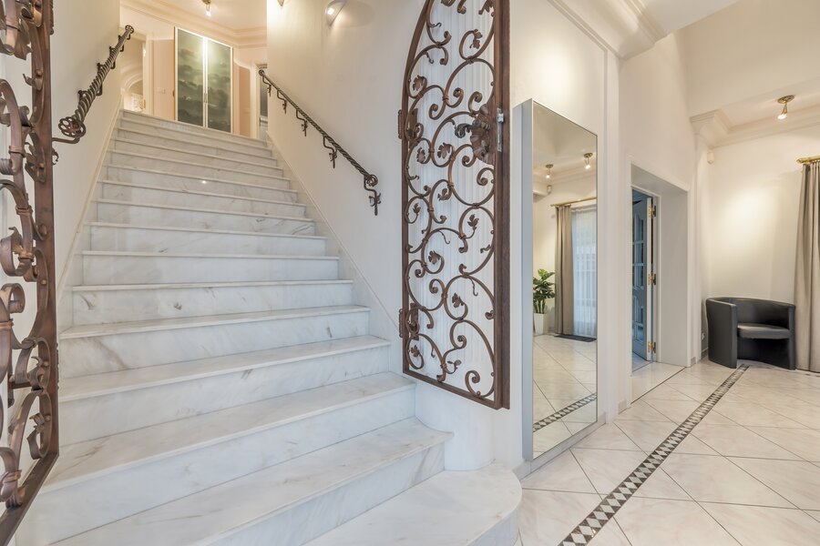 De woning verwelkomt met een imposante inkomhal, hoog plafond, gastentoilet en een natuurstenen trap. Dubbele deuren openen naar een lichtrijke leefruimte met handgemaakte mouluren. Aansluitend ligt de volledig uitgeruste keuken met kwartsgranieten werkblad en zicht op de tuin. Verder is er een wasplaats en inpandige garage met elektrische poort.
