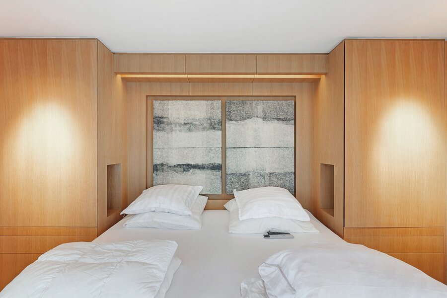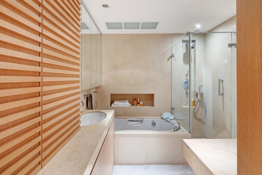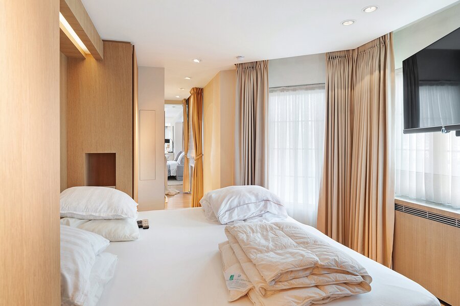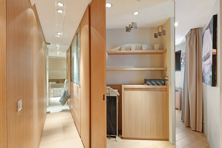 Slaapkamer, met aansluitend een zeer ruime dressing. De fraai ingerichte badkamer in natuursteen is uitgerust met een dubbele lavabo, toilet, douche en ligbad.