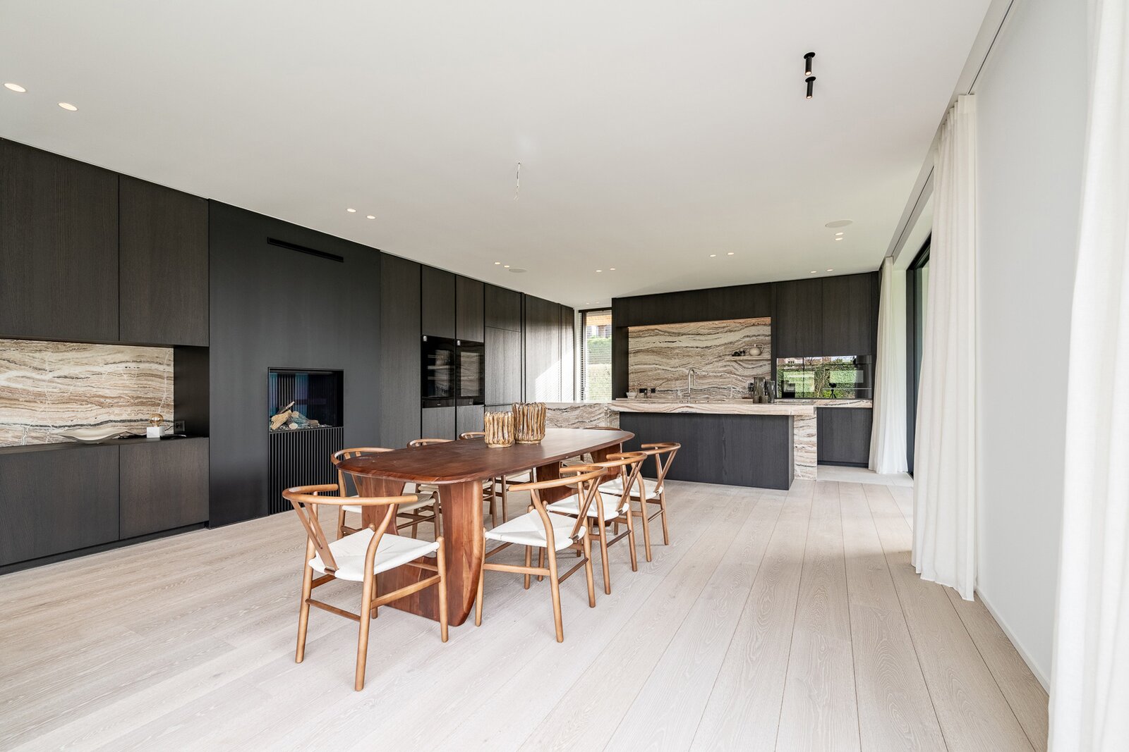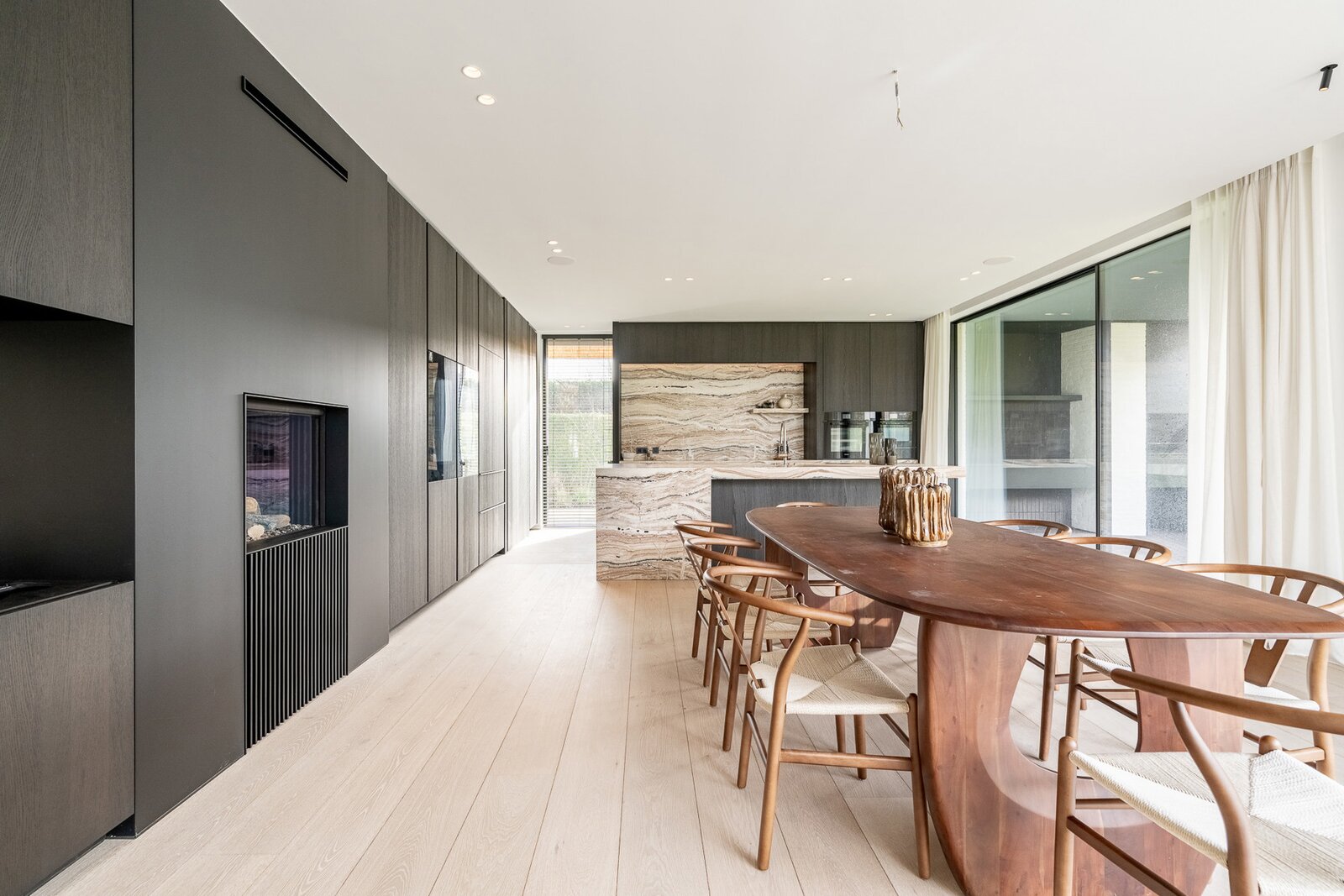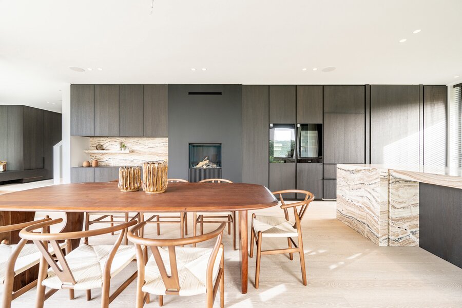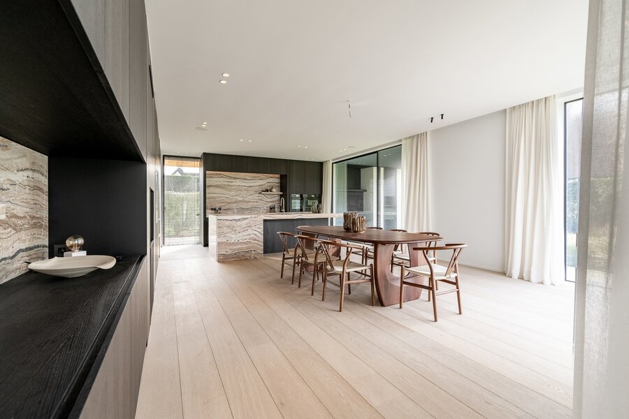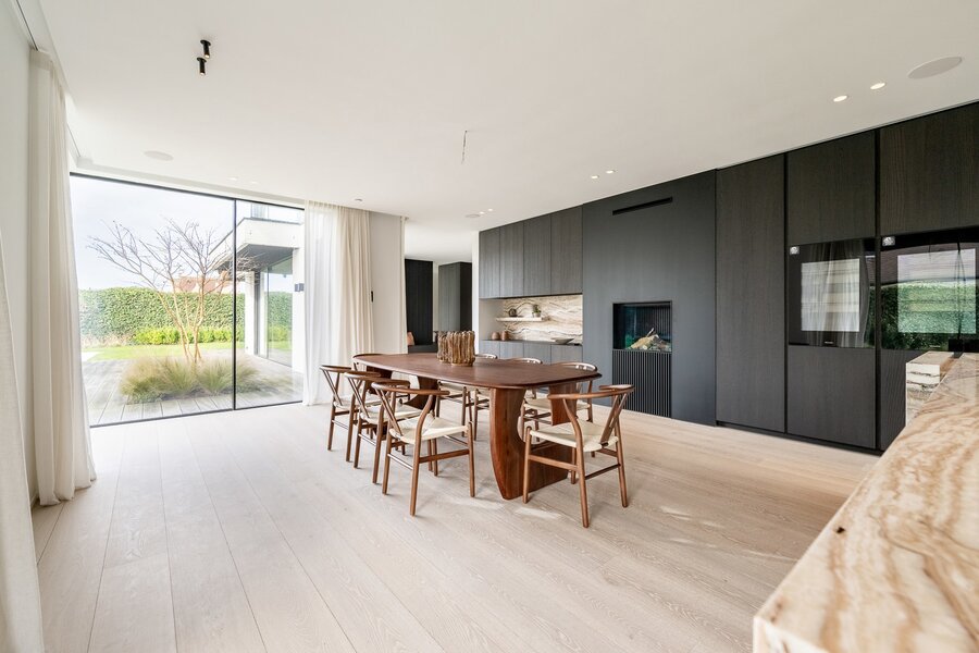 De uitzonderlijk ruime leefkeuken met eetplaats is afgewerkt met hoogwaardige materialen en uitgerust met luxueuze, kwalitatieve toestellen. Grote schuiframen geven toegang tot het overdekt terras met geïntegreerde BBQ, perfect voor lange zomeravonden.