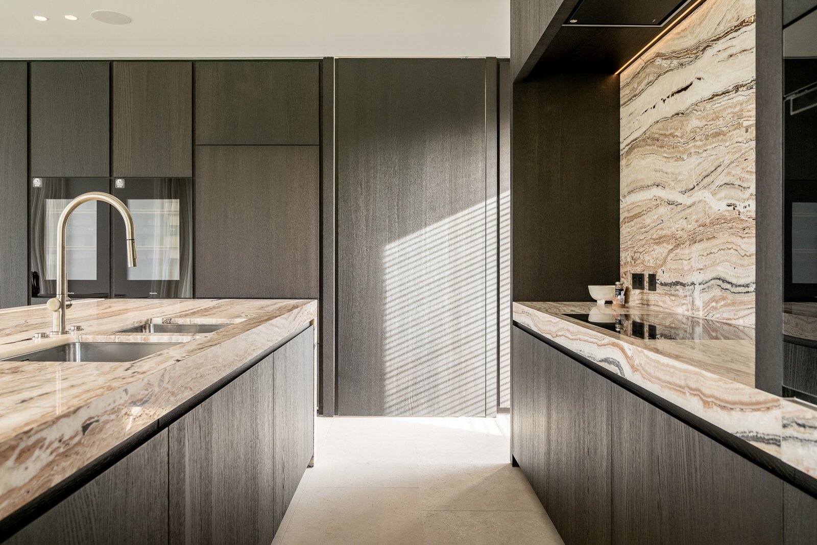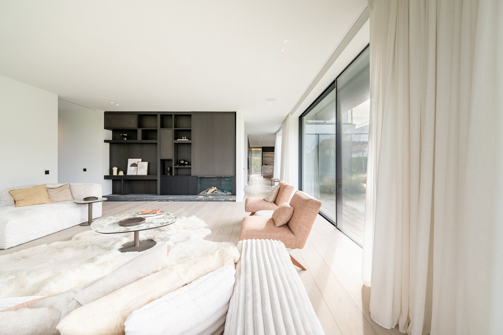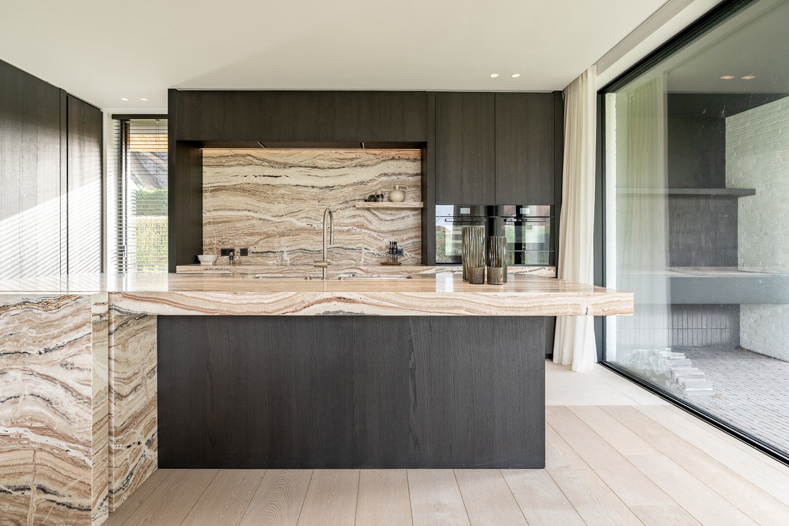 De uitzonderlijk ruime leefkeuken met eetplaats is afgewerkt met hoogwaardige materialen en uitgerust met luxueuze, kwalitatieve toestellen. Grote schuiframen geven toegang tot het overdekt terras met geïntegreerde BBQ, perfect voor lange zomeravonden.