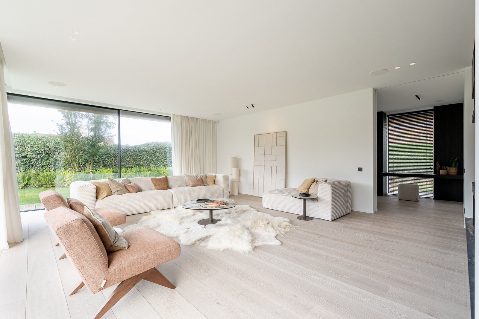 Via de imposante inkomdeur betreedt u de ruime inkomhal met op maat gemaakte vestiairekasten. Dankzij de grote raampartijen baadt de leefruimte in natuurlijk licht en geniet u van een prachtig zicht op de aangelegde tuin.