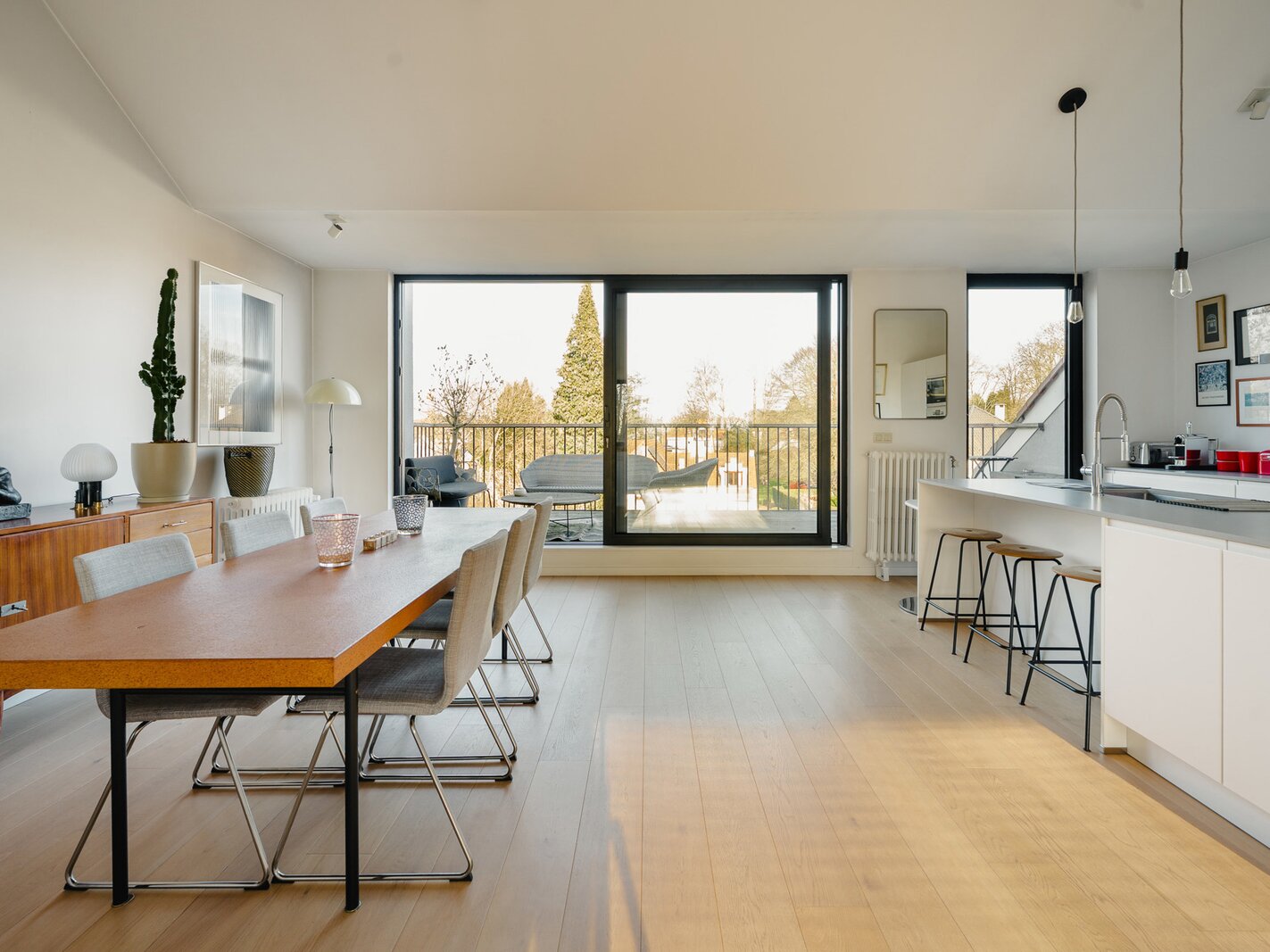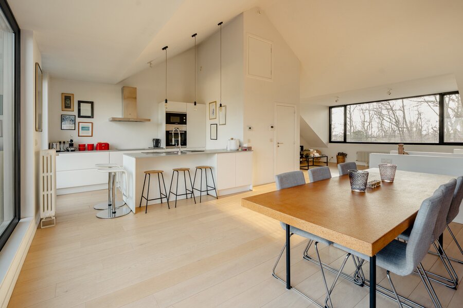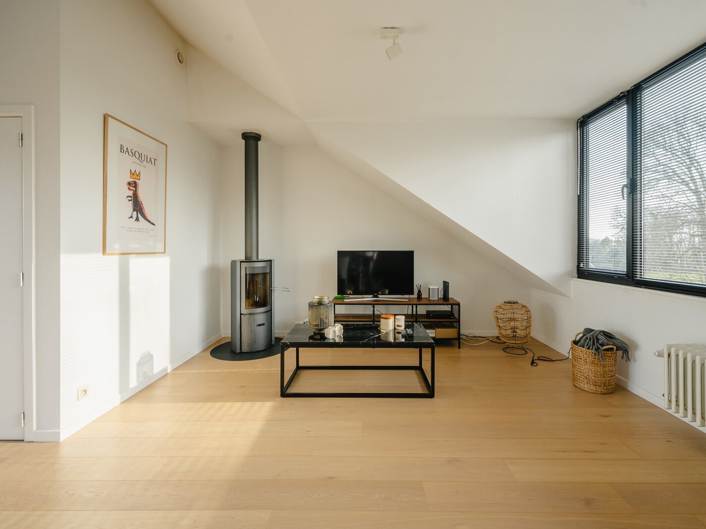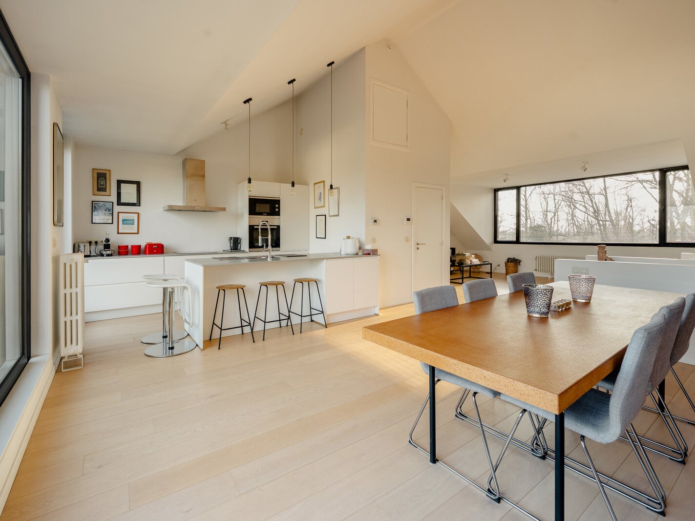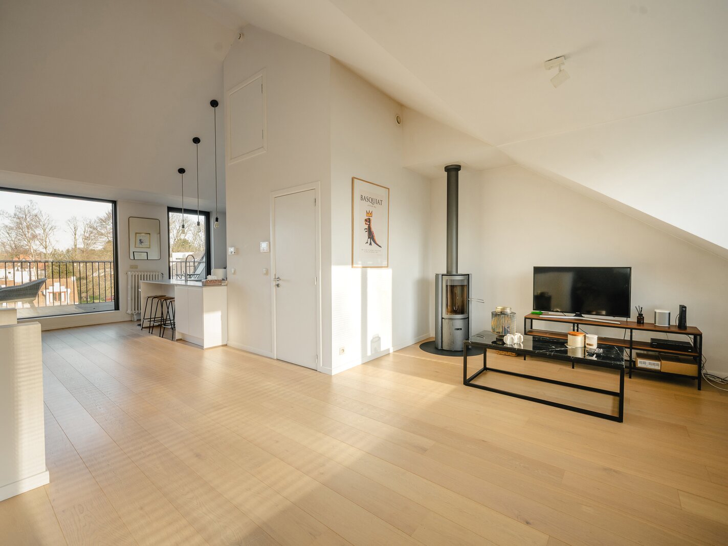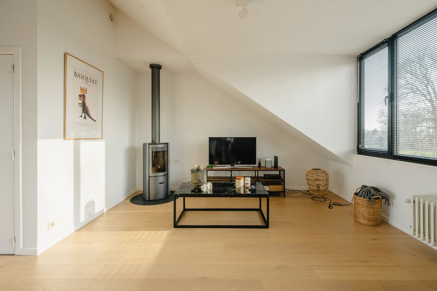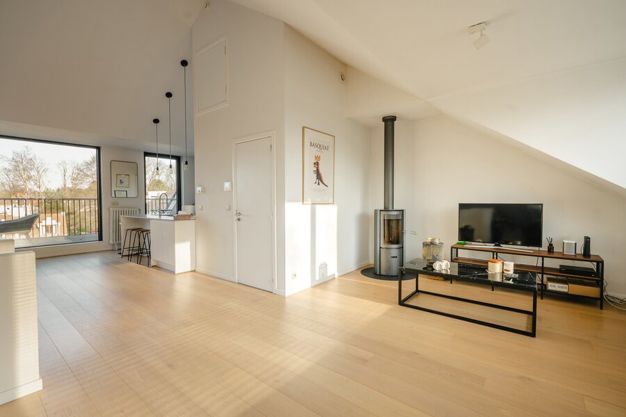 Het duplexappartement grenst aan het Wolvendaelpark en biedt op de bovenverdieping woonruimtes, waaronder een woonkamer met een Stuv-haard, een eetkamer en een volledig uitgeruste open keuken met kookeiland. Grote ramen zorgen voor veel natuurlijk licht en geven toegang tot een prachtig terras met vrij uitzicht en groen. Op de benedenverdieping delen twee slaapkamers met inbouwkasten een badkamer met douche.
