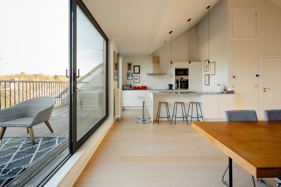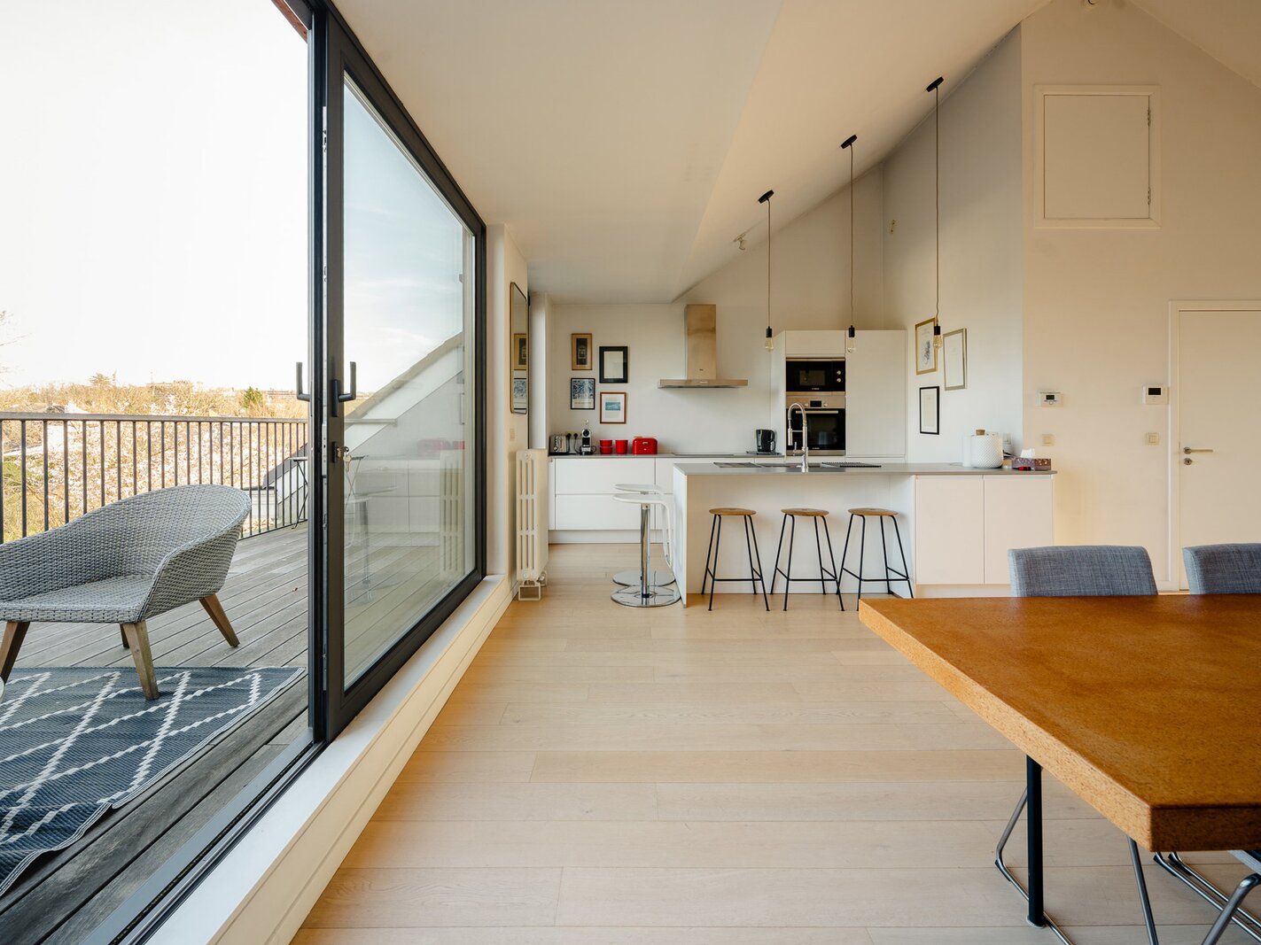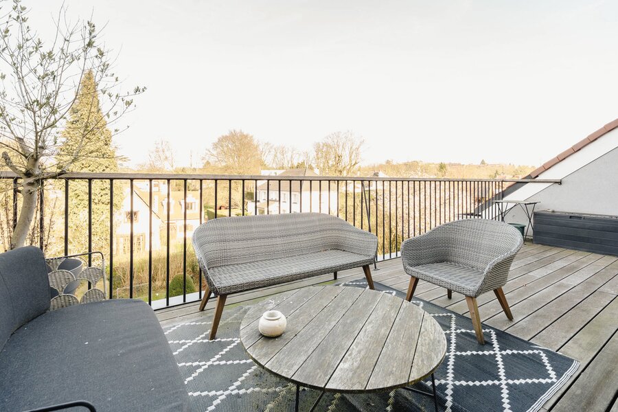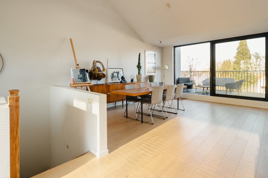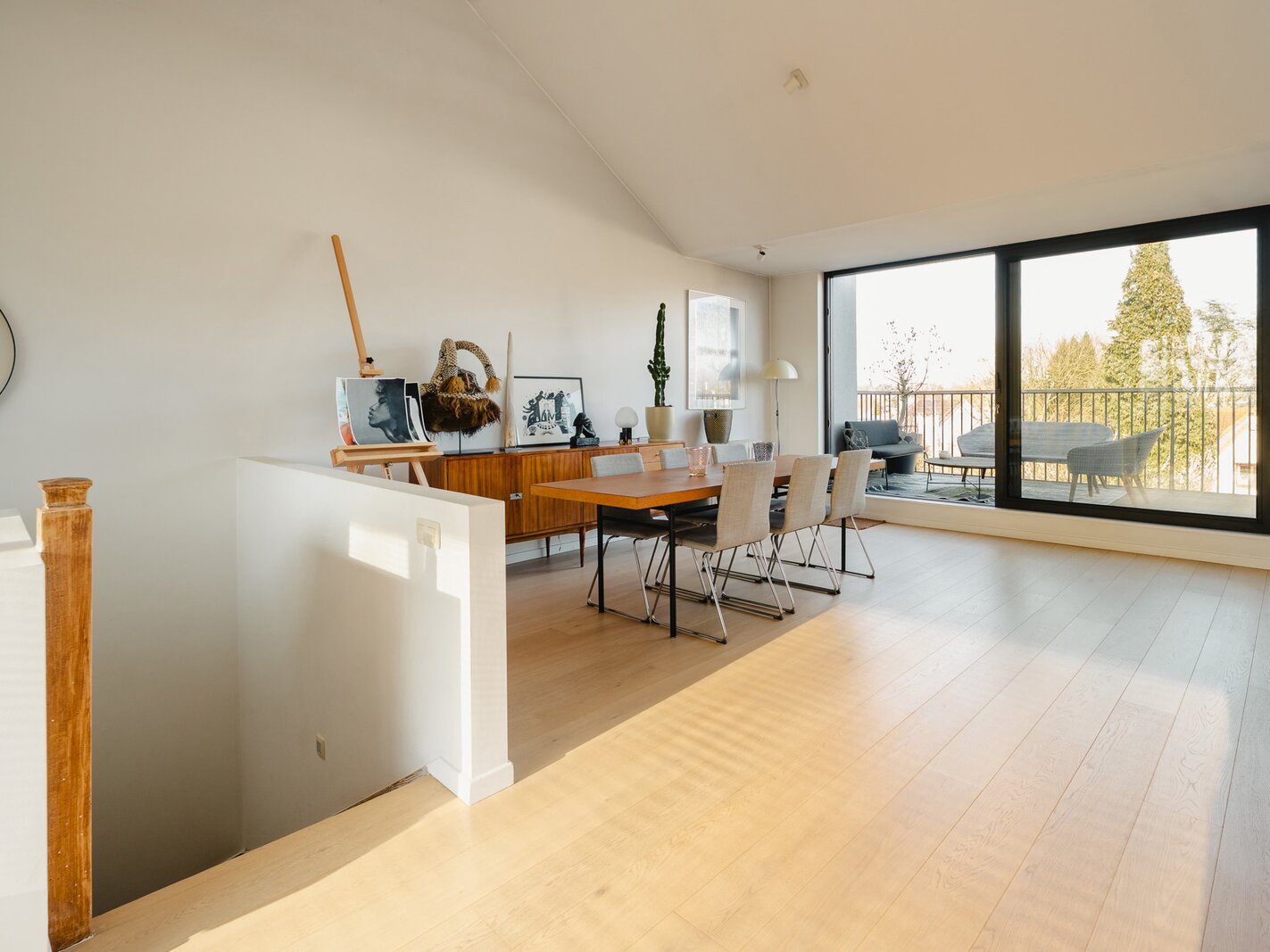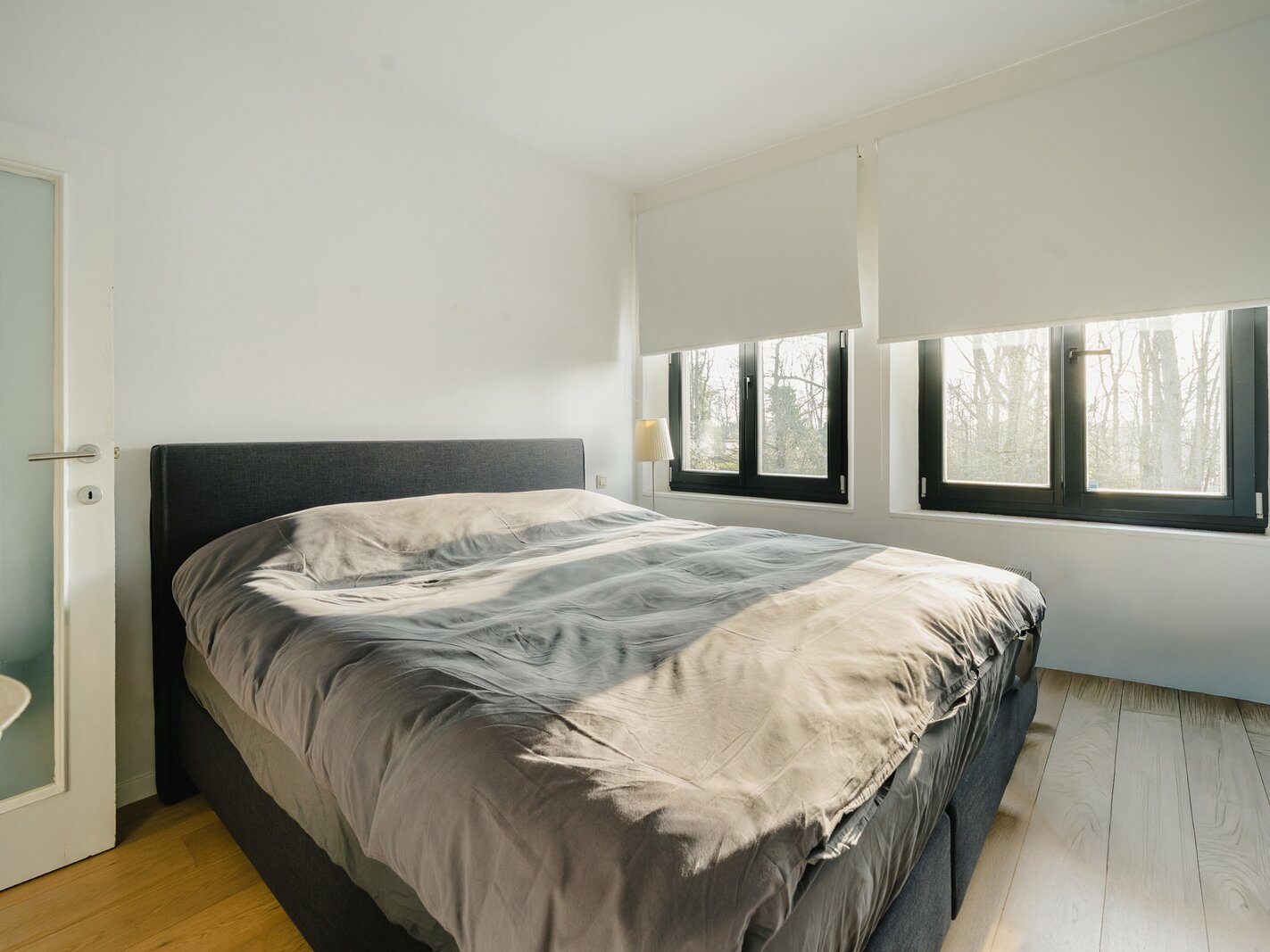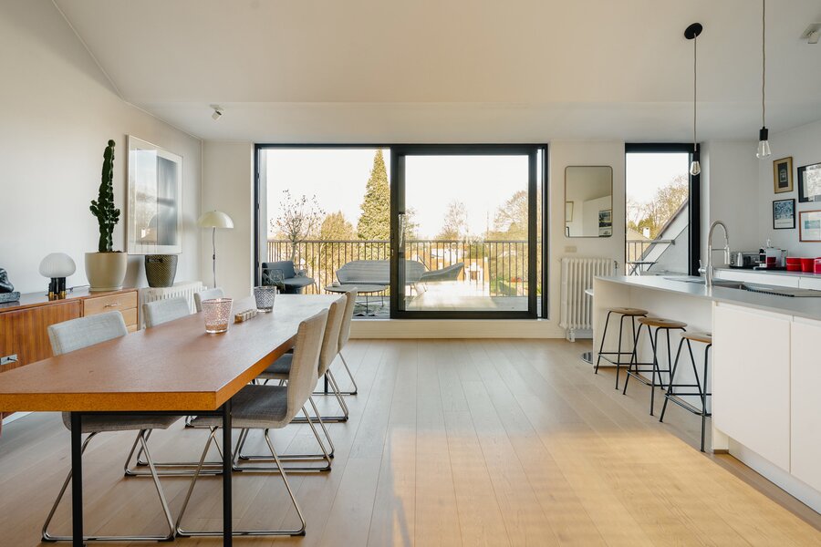Het duplexappartement grenst aan het Wolvendaelpark en biedt op de bovenverdieping woonruimtes, waaronder een woonkamer met een Stuv-haard, een eetkamer en een volledig uitgeruste open keuken met kookeiland. Grote ramen zorgen voor veel natuurlijk licht en geven toegang tot een prachtig terras met vrij uitzicht en groen. Op de benedenverdieping delen twee slaapkamers met inbouwkasten een badkamer met douche.