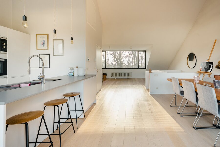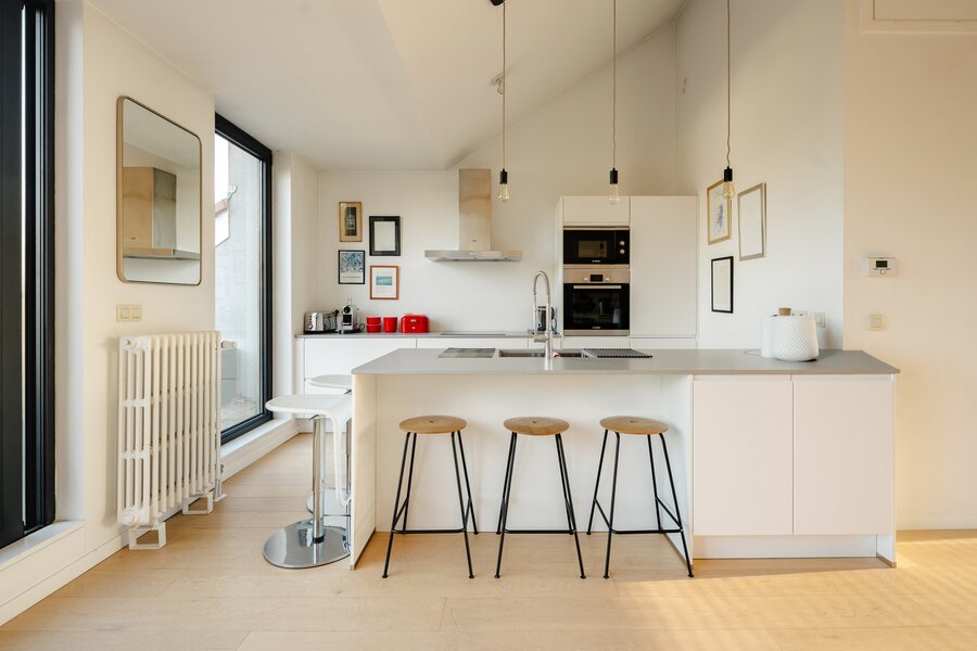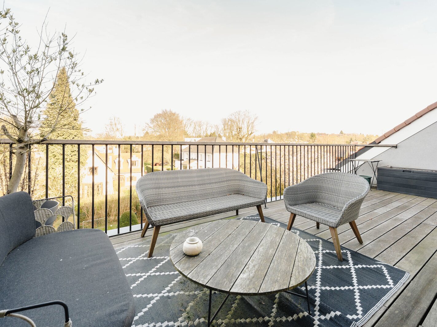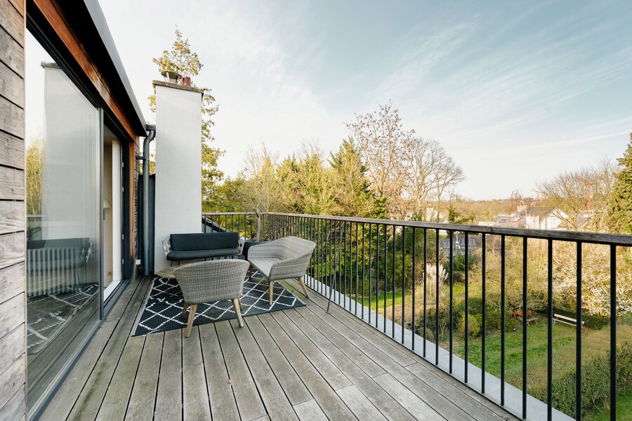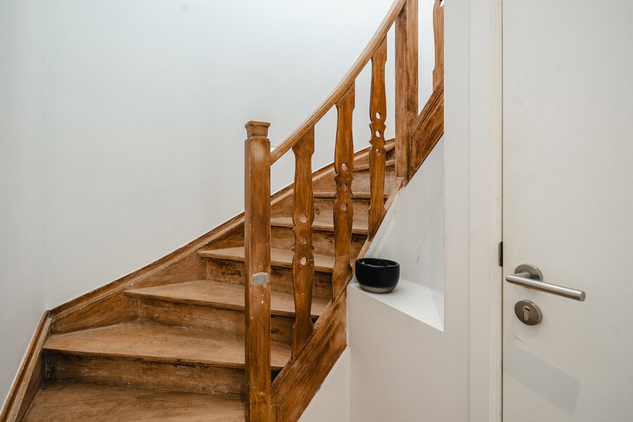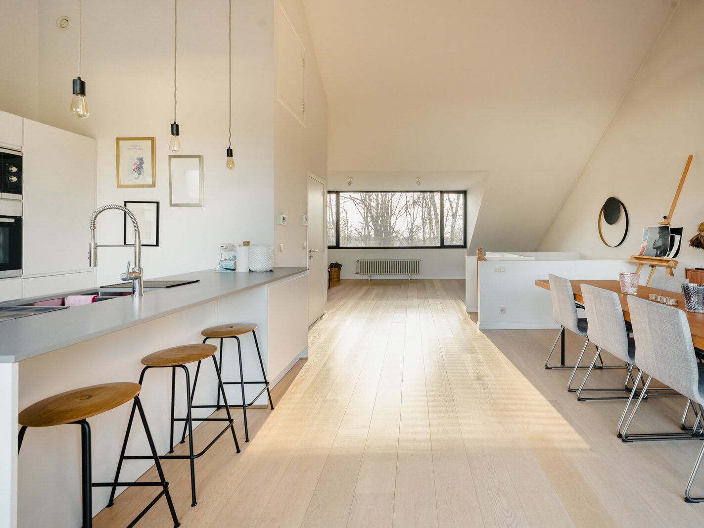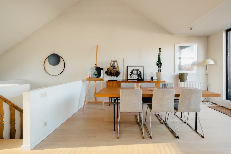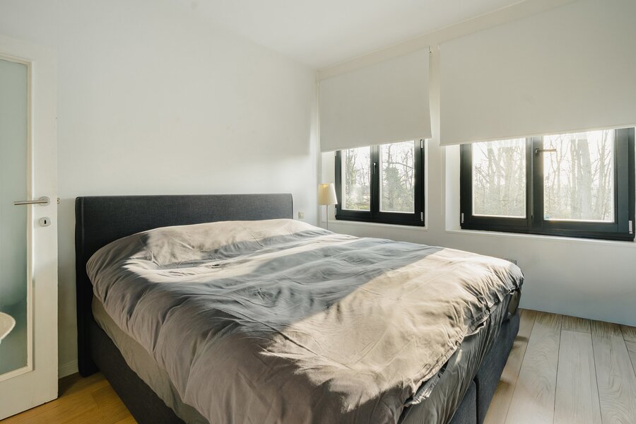 Het duplexappartement grenst aan het Wolvendaelpark en biedt op de bovenverdieping woonruimtes, waaronder een woonkamer met een Stuv-haard, een eetkamer en een volledig uitgeruste open keuken met kookeiland. Grote ramen zorgen voor veel natuurlijk licht en geven toegang tot een prachtig terras met vrij uitzicht en groen. Op de benedenverdieping delen twee slaapkamers met inbouwkasten een badkamer met douche.