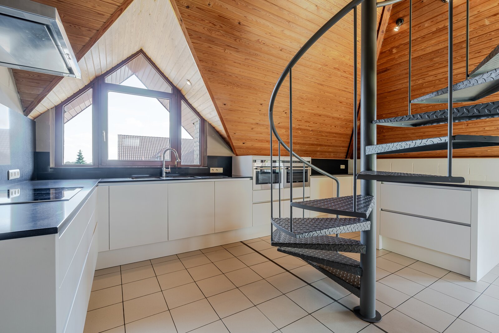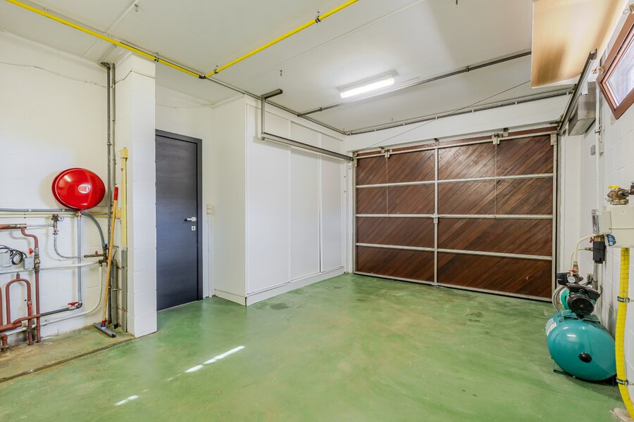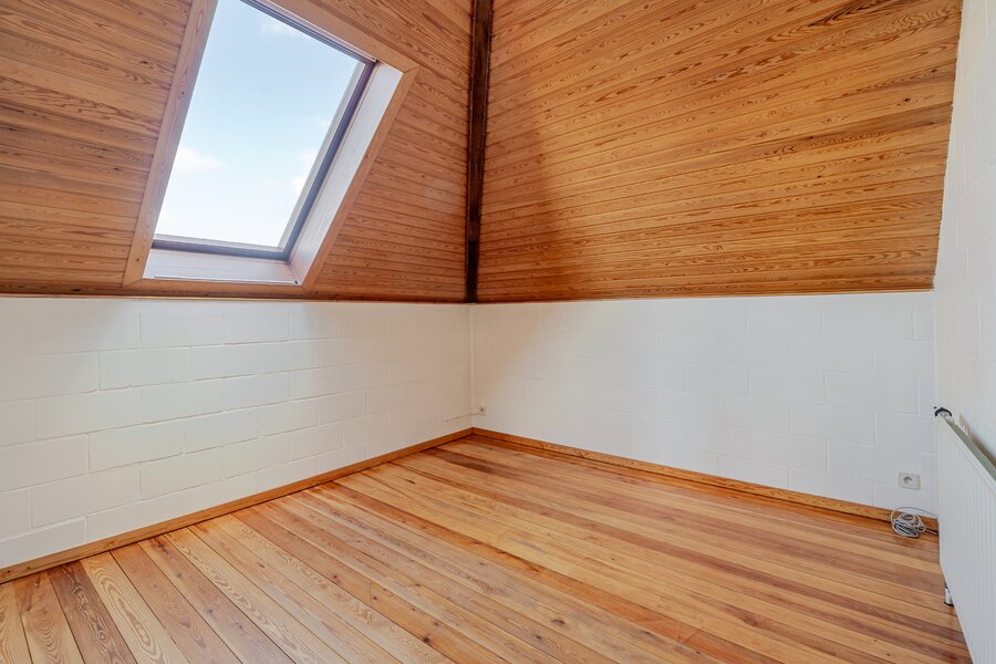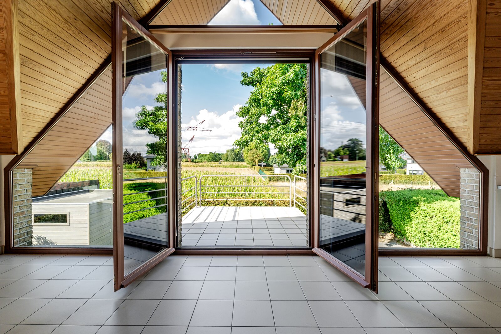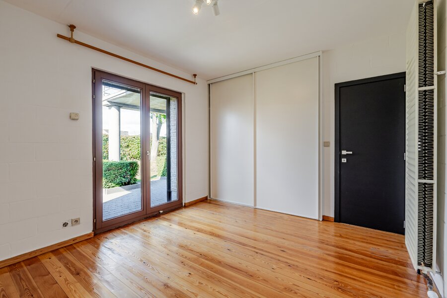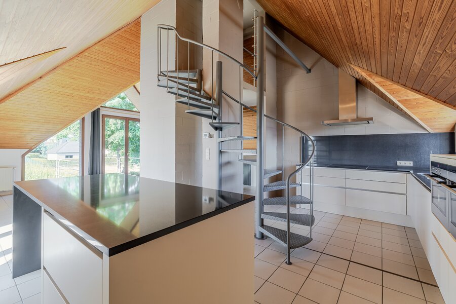 De woning is voorzien van een ruime inpandige garage, 2 ruime slaapkamers met ingemaakte kasten met toegang tot de tuin, een ruime badkamer én een aparte douchekamer. Nemen we de trap naar boven, vinden we een ruime slaapkamer en een hele mooie en hoge open ruimte terug als woonkamer, eetkamer en keuken. De woonkamer verschaft een prachtig zicht op de tuin en de achterliggende velden. In alle rust. De mezzanine doet dienst als bureauruimte, ideaal voor thuiswerkers.