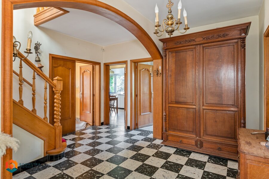 We betreden de woning via de inkomhal met apart gastentoilet en toegang tot de kelder. De authentieke leefruimte kan worden ingericht met een gezellige zithoek en aparte eetplaats. Aanpalend bevindt zich de keuken die mooi werd geïntegreerd in het geheel en is voorzien van de voornaamste toestellen. Via de keuken heeft u daarnaast ook toegang tot het goed georiënteerde terras en de ruime tuin. Naast de keuken betreden we de eerste slaapkamer die ook uitstekend kan dienen als bureauruimte. Via de nachthal op de eerste verdieping bereiken we 4 ruime slaapkamers en de badkamer, voorzien van een ligbad, een toilet en een lavabo. Tot slot beschikt deze woning nog over een zeer ruime zolder, die indien gewenst omgevormd kan worden tot extra slaapkamers, en een ruime, inpandige garage. In de ruime tuin met twee bijgebouwen en terras kan u steeds in alle rust en privacy genieten van het mooie weer.