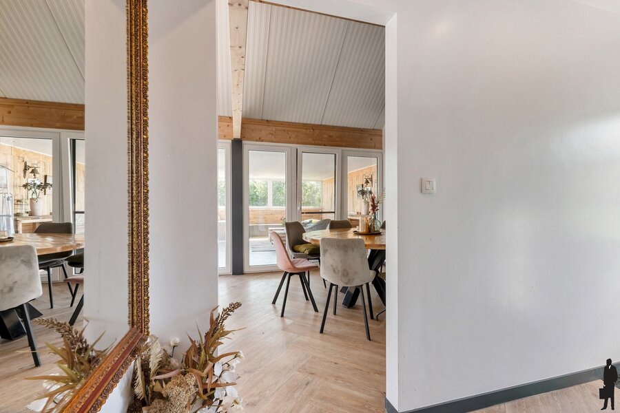 Gelijkvloer: Via de inkomhal met overvloedig daglicht kom je in de gezellige eethoek die naadloos aansluit op een overdekt terras — perfect voor lange avonden buiten. De open keuken is smaakvol ingericht en voorzien van de nodige toestellen en vormt samen met de ruime zithoek een warm en uitnodigend geheel, met zicht op de omliggende tuin.