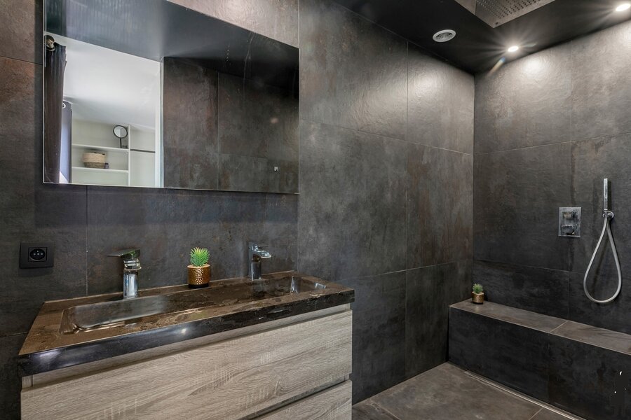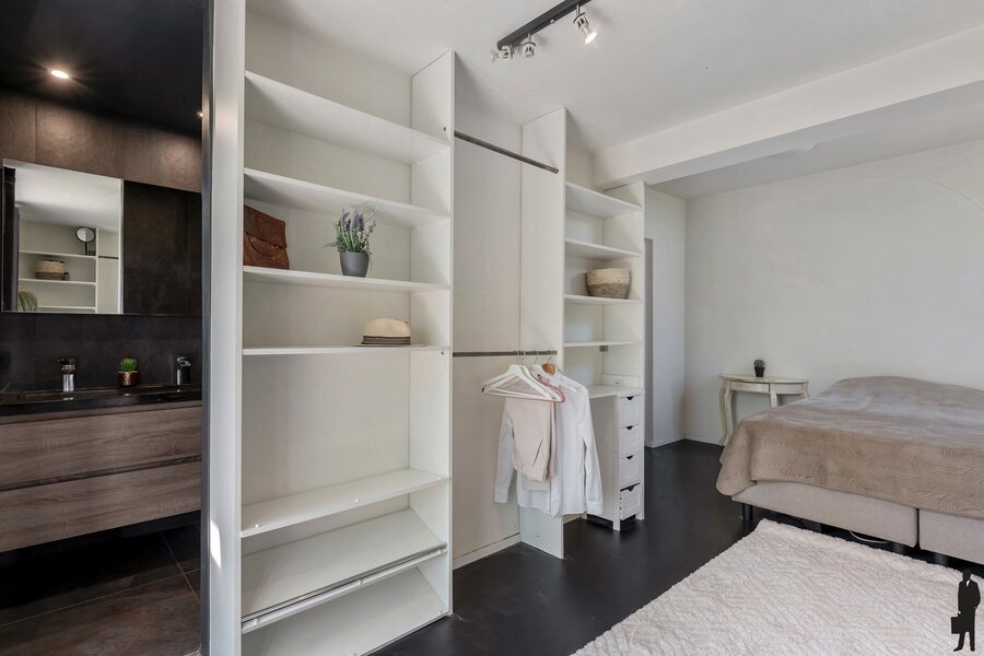 De gelijkvloerse verdieping biedt twee slaapkamers allebei met dressing en waarvan één met ensuite badkamer met inloopdouche. Daarnaast is er een aparte badkamer met ligbad, ideaal voor een gezin of gasten. Een praktische wasplaats vervolledigt het gelijkvloers.