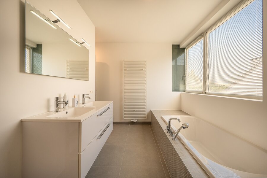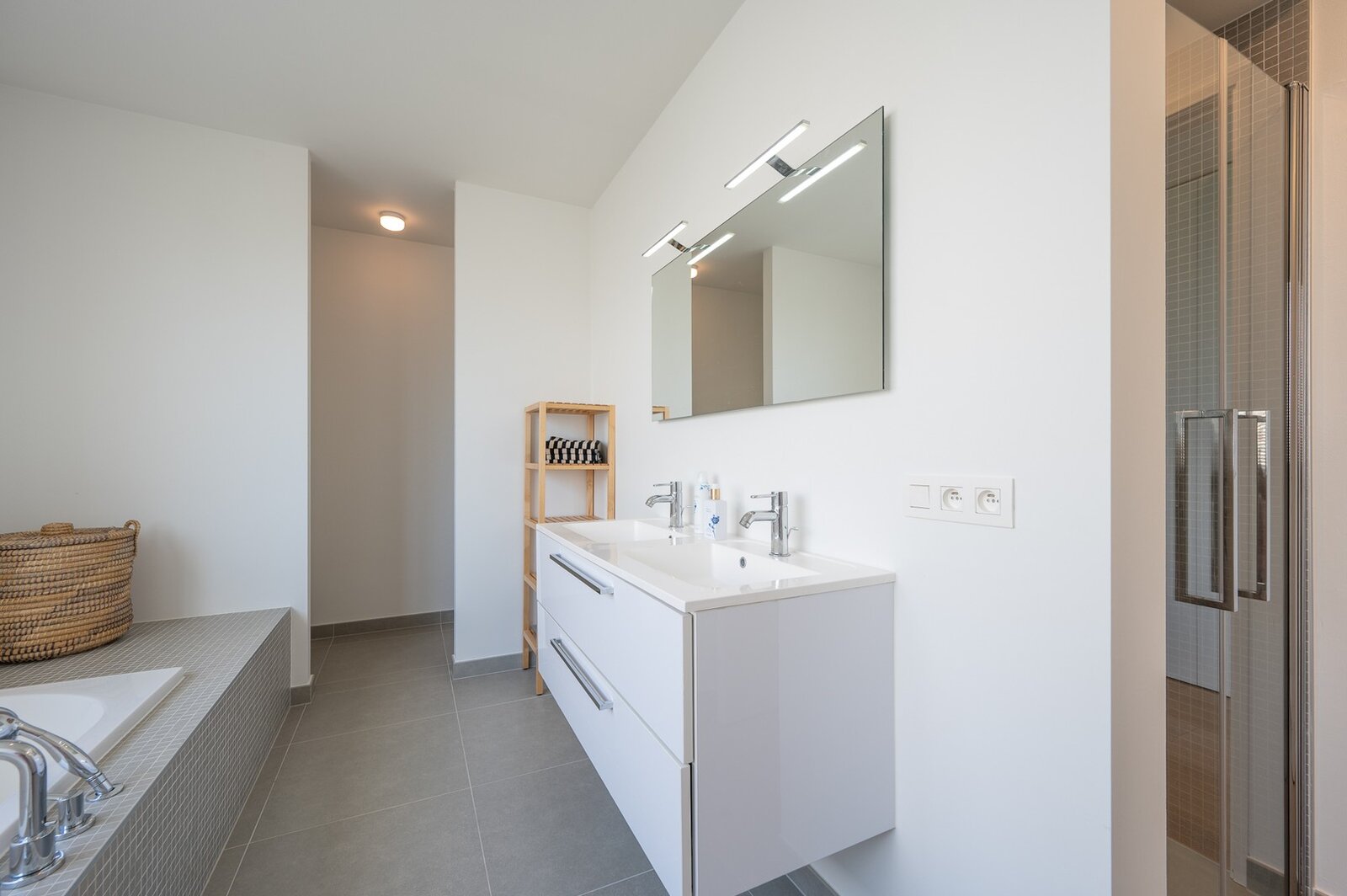 Eerste verdieping: royale master bedroom met inloopdressing en badkamer voorzien van inloopdouche, ligbad, dubbele lavabo en toilet. Twee volwaardige slaapkamers, aparte douchekamer en een afzonderlijk toilet op de nachthal.