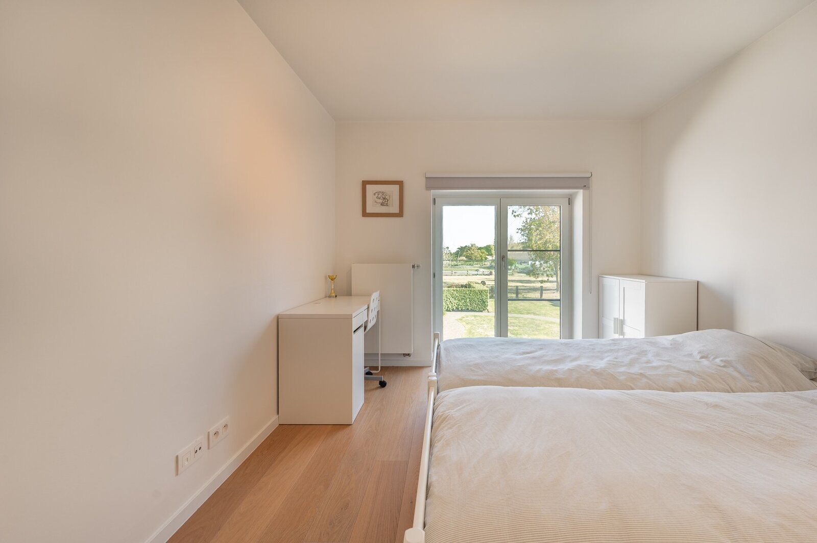 Indeling: Gelijkvloers: inkomhal met vestiaire en gastentoilet, ruime en lichte woonkamer met hoge plafonds, open keuken met eetruimte die uitgeeft op de zonnige tuin en het terras. Praktische bijkeuken/wasplaats. Bureel of gastenkamer met uitzicht op tuin en velden, eveneens met toegang tot een terras.