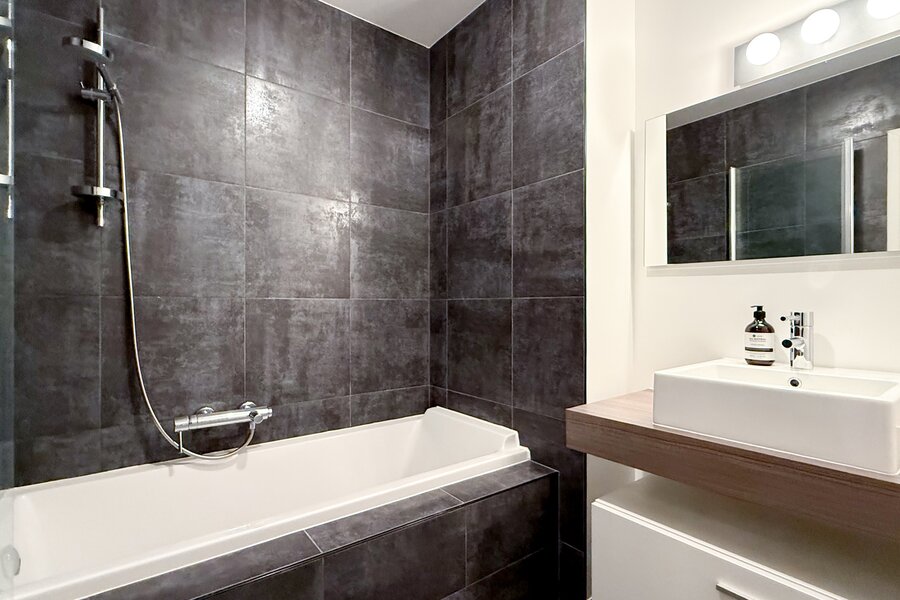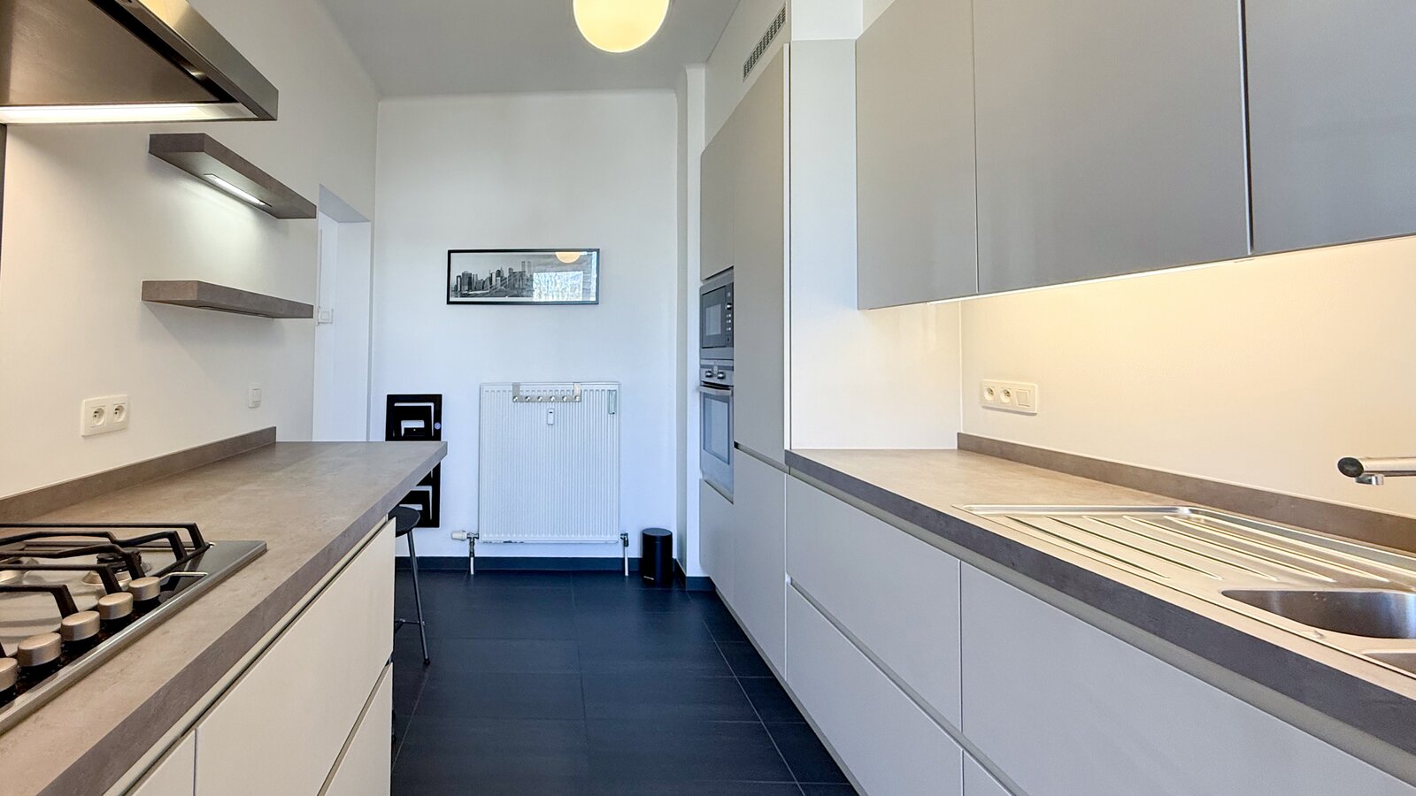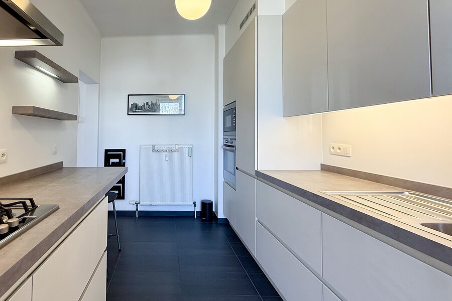 Bij binnenkomst word je verwelkomd in een ruime inkomhal met een praktische vestiairekast. De leefruimte, voorzien van blokjes parket, baadt in het licht dankzij de grote ramen aan de voorzijde, waar je kan genieten van de ochtendzon. De aparte keuken aan de achterzijde is hyper-geïnstalleerd en uitgerust met moderne, witte greeploze kasten. Met een ruim werkblad en zitruimte voor krukjes is deze keuken een waar paradijs voor de kookliefhebber. De aanwezige toestellen, waaronder een koelkast, diepvries, kookfornuis op gas, heteluchtoven, microgolfoven en vaatwasser, maken het plaatje compleet. Bovendien heeft de keuken toegang tot een gezellig balkon, perfect voor een kopje koffie in de buitenlucht.