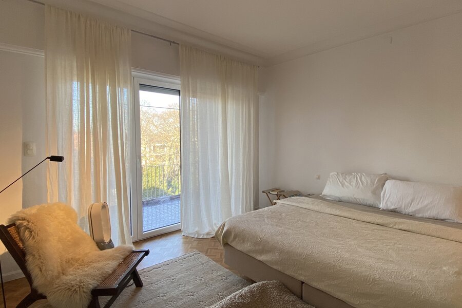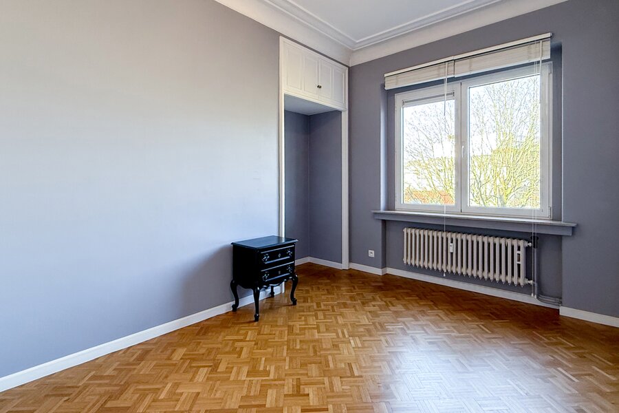 Het appartement beschikt over drie kamers, waaronder een sfeervolle slaapkamer aan de voorzijde en een masterbedroom aan de achterzijde, die toegang biedt tot een zonnig terras met een prachtig uitzicht op het groene binnengebied. De badkamer, bereikbaar via de masterbedroom, is uitgerust met een ligbad/douche en een stijlvol lavabomeubel. De derde kamer, ook aan de achterzijde gelegen, is ideaal als dressing en biedt bovendien voorzieningen voor de aansluiting van een wasmachine. Een apart toilet vervolledigt het geheel.