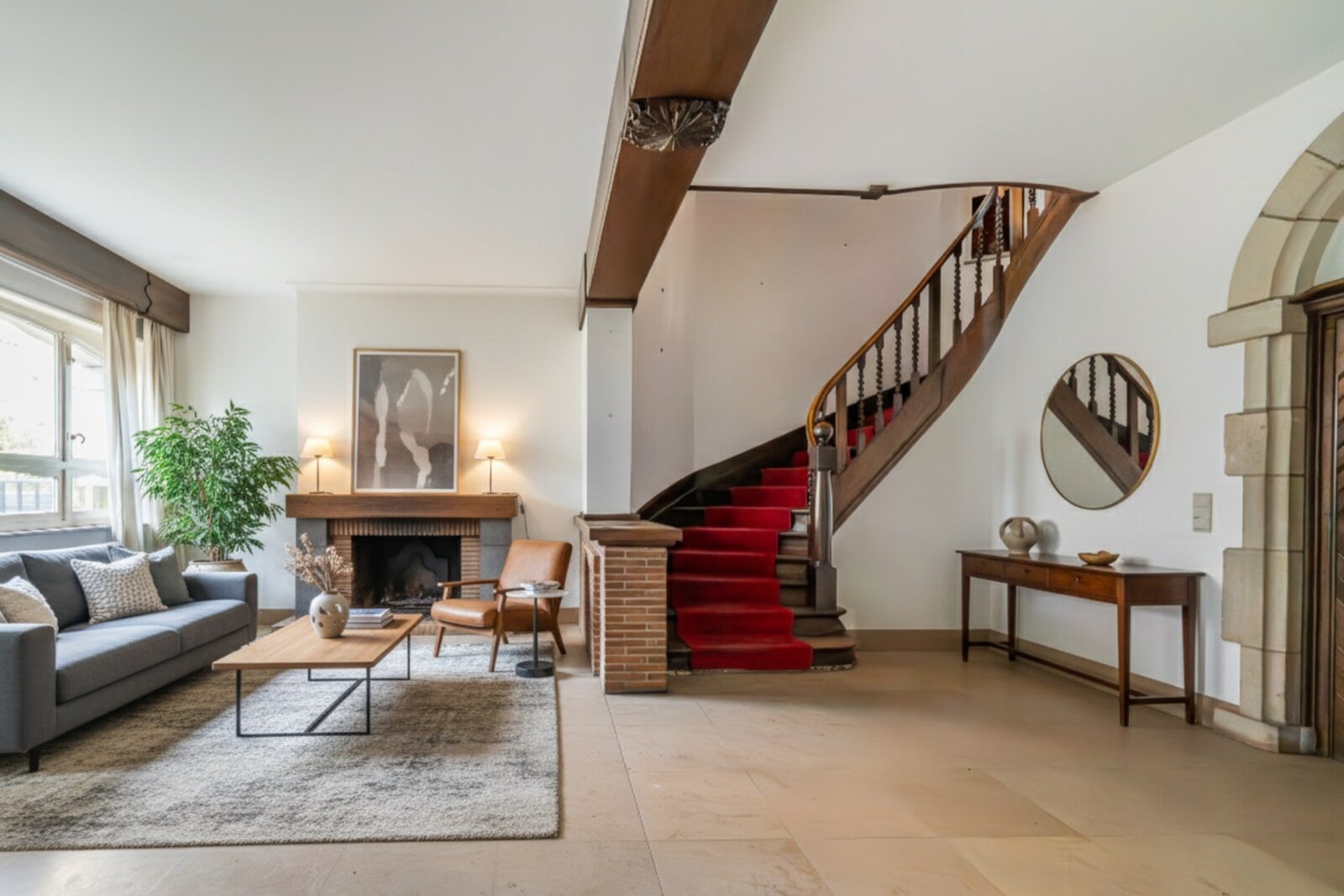 De gelijkvloerse verdieping opent op een ruime inkomhal die leidt naar een woonkamer met open haard en een mooie trap. Aan de achterzijde bevindt zich een leefruimte met open keuken, eetkamer en salon dat uitloopt op de tuin van ± 80 m².