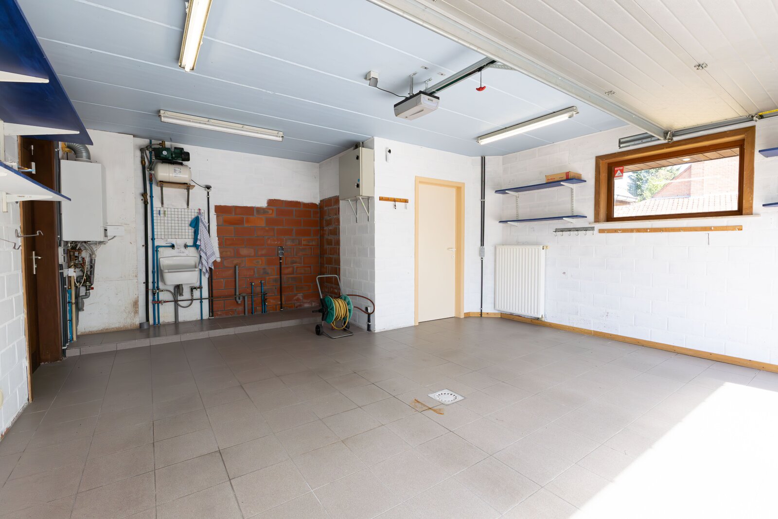Gelijkvloers: inkomhal, polyvalente ruimte, open leefruimte die toegang geeft tot de zongerichte tuin , keuken met bergiing, badkamer,toilet, garage.