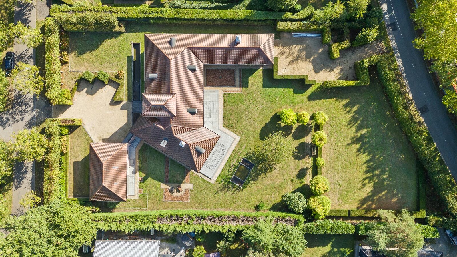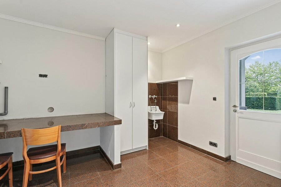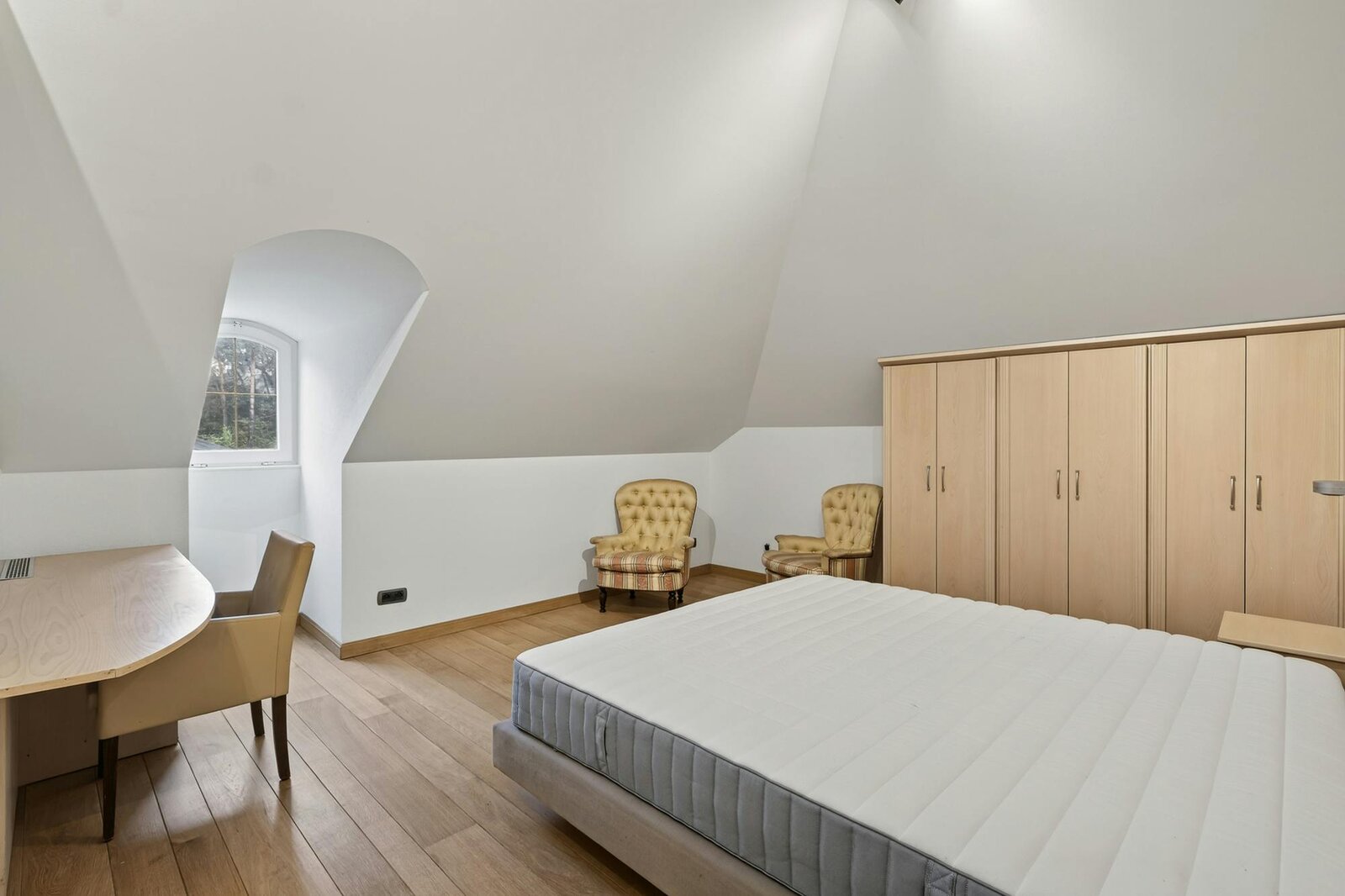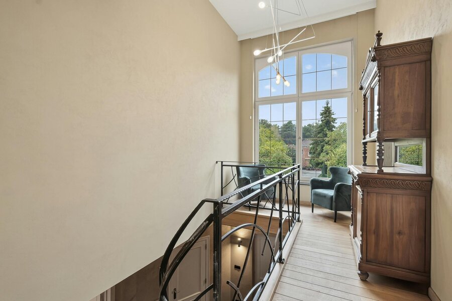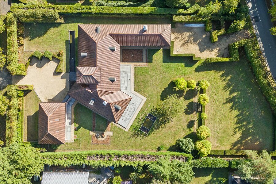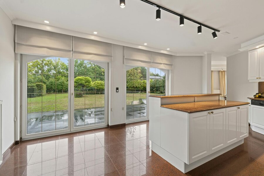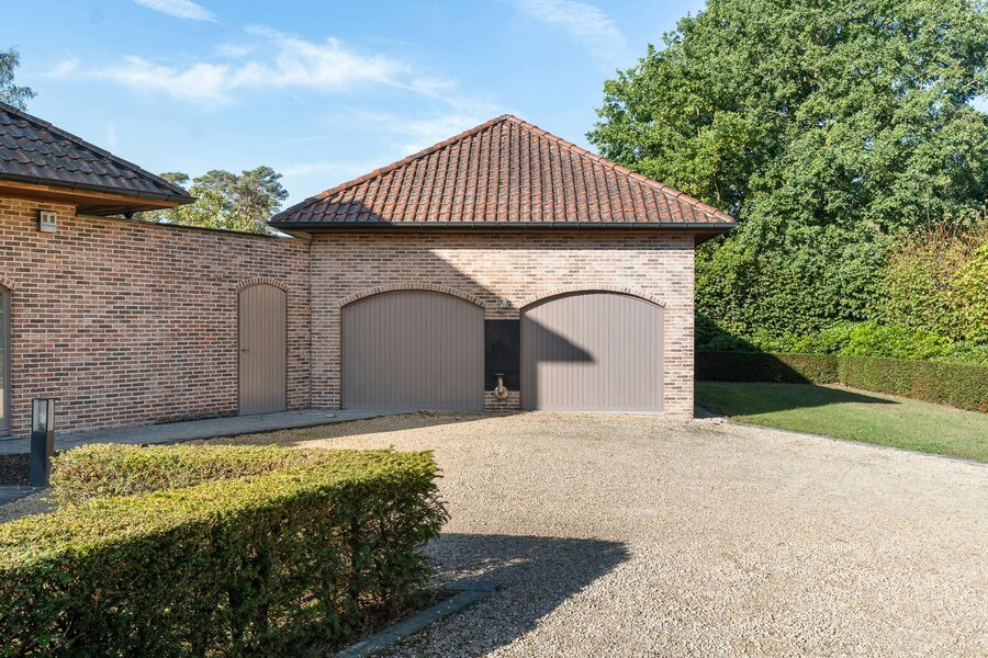 De lichtrijke woonkamer met doorkijkhaard geeft een prachtig uitzicht op de zuidgerichte tuin. De keuken is volledig uitgerust en sluit aan op het grote terras in blauwe hardsteen. De villa heeft een grote kelder met een aparte wijnkelder. Parkeren is eenvoudig dankzij een apart garagegebouw en extra parkeerplaatsen voor 4 wagens. De omheinde tuin met diverse terrassen en waterpartijen biedt volledige privacy en is eveneens toegankelijk via de Eerselingenstraat.