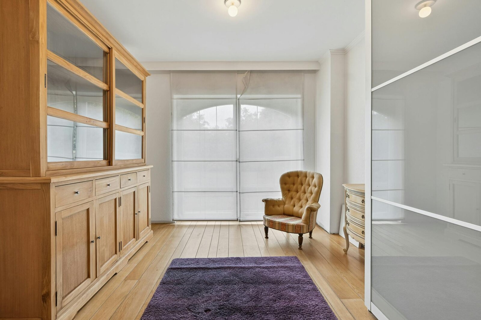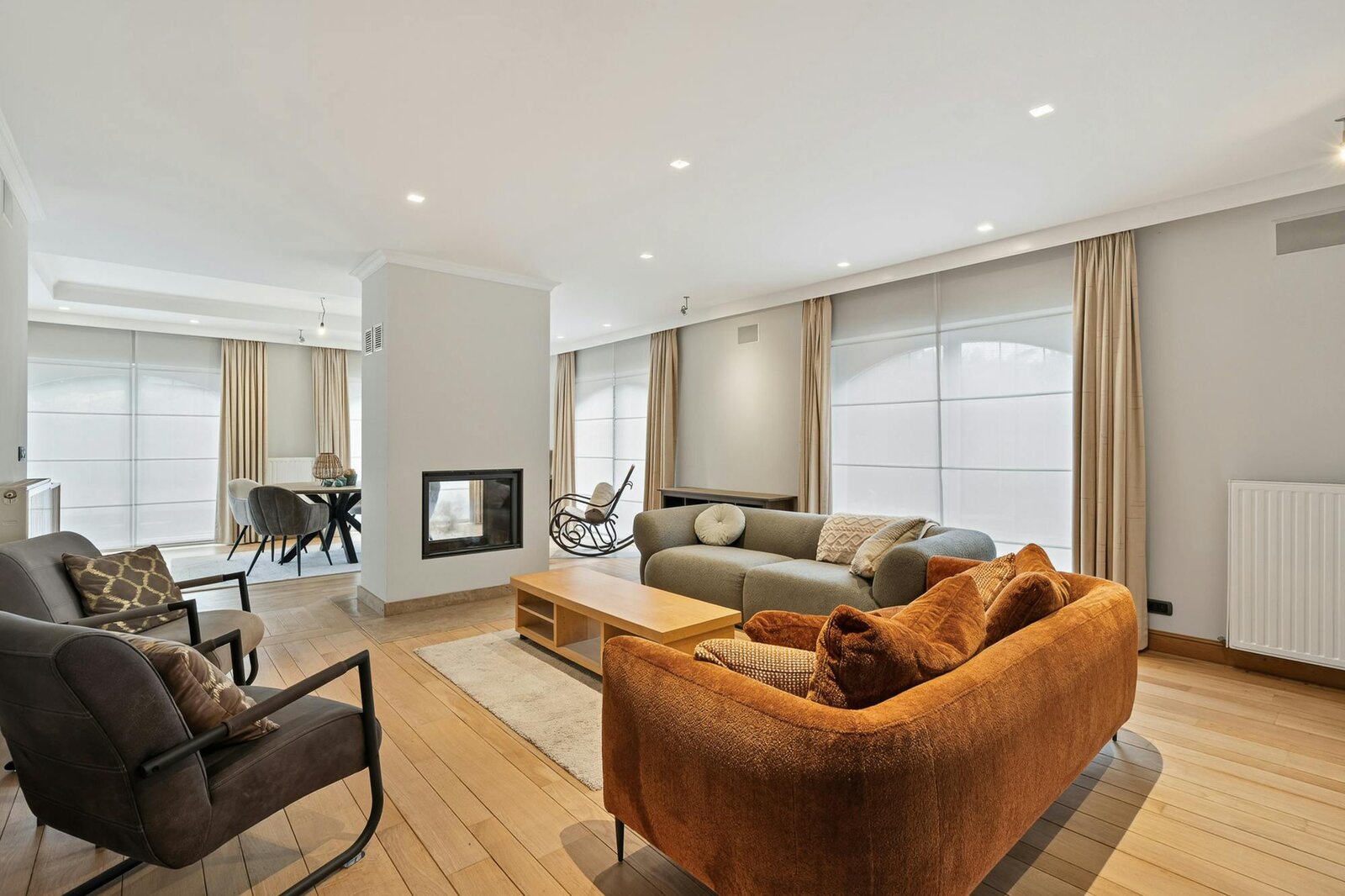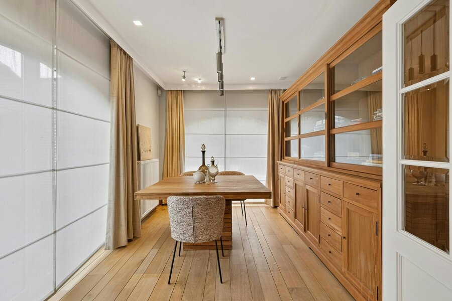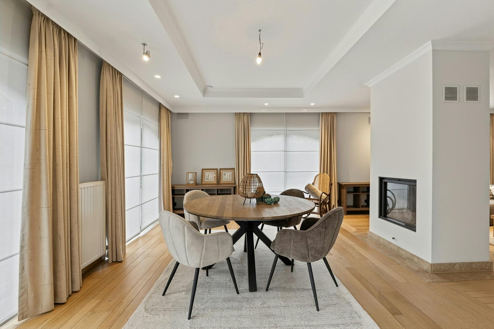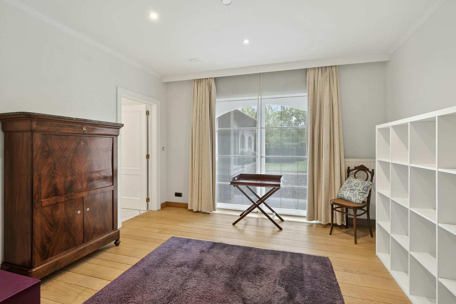 De lichtrijke woonkamer met doorkijkhaard geeft een prachtig uitzicht op de zuidgerichte tuin. De keuken is volledig uitgerust en sluit aan op het grote terras in blauwe hardsteen. De villa heeft een grote kelder met een aparte wijnkelder. Parkeren is eenvoudig dankzij een apart garagegebouw en extra parkeerplaatsen voor 4 wagens. De omheinde tuin met diverse terrassen en waterpartijen biedt volledige privacy en is eveneens toegankelijk via de Eerselingenstraat.