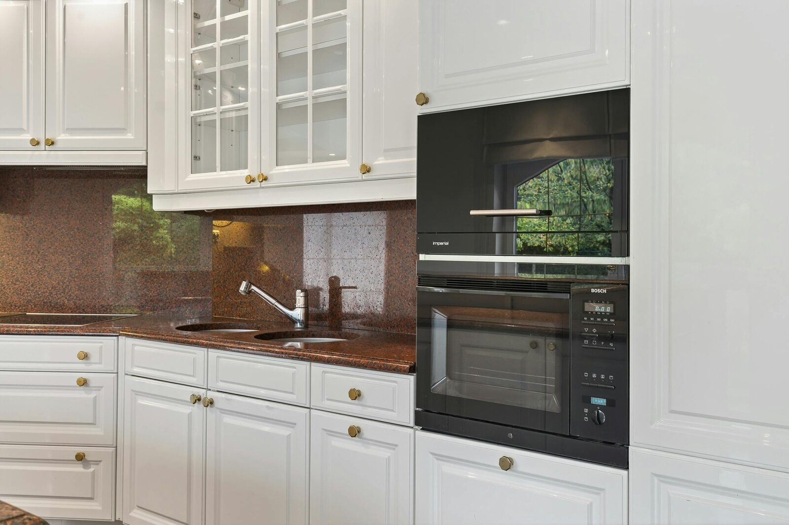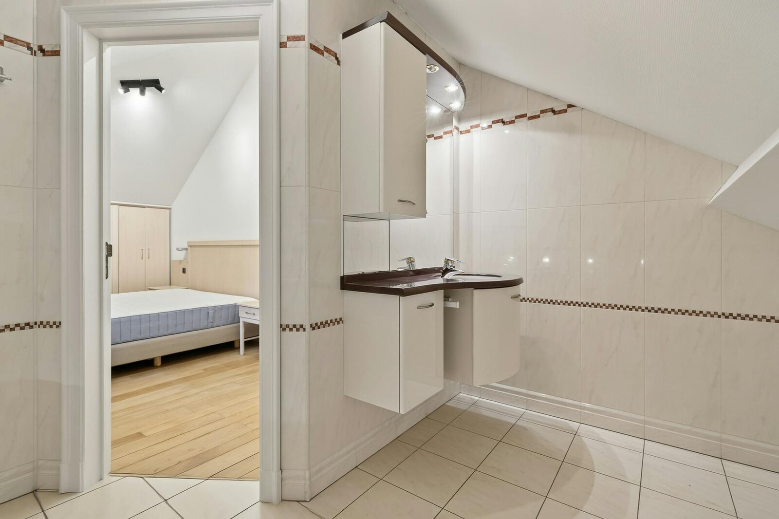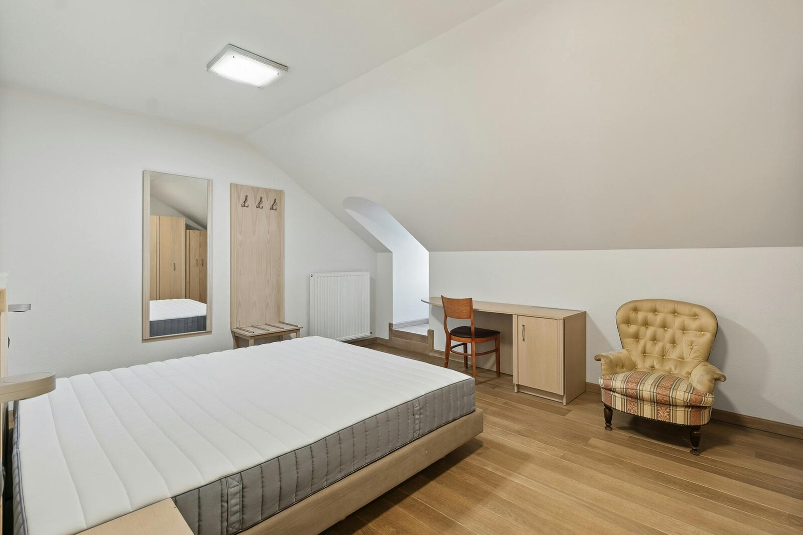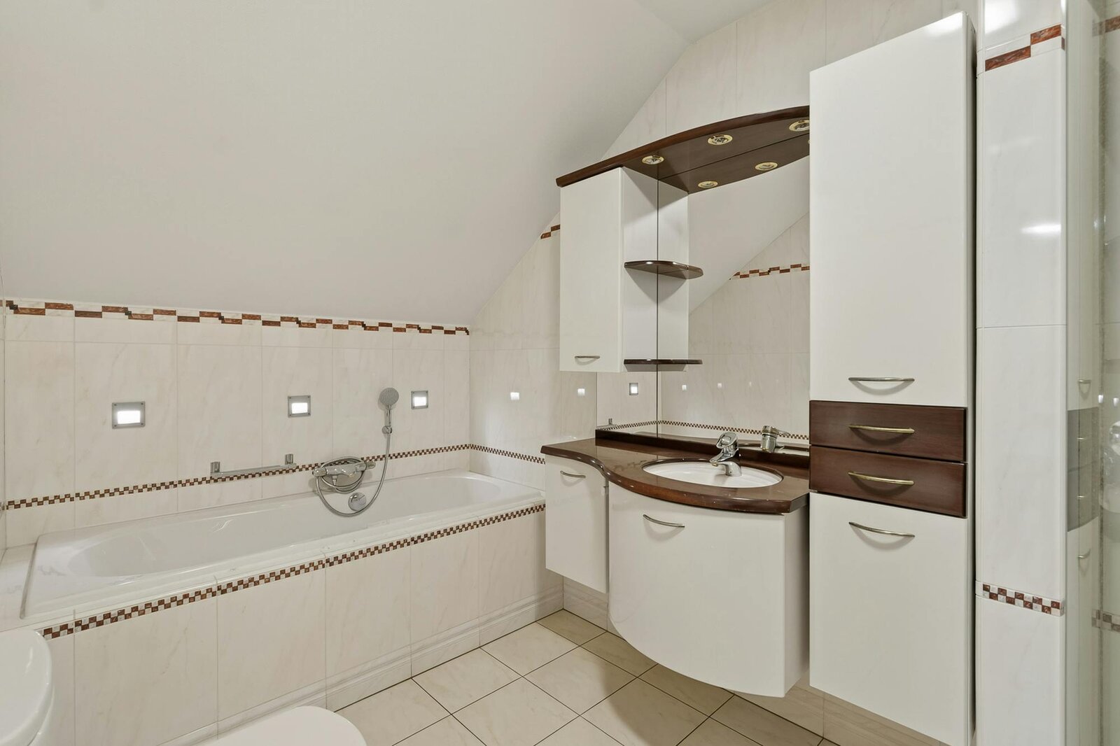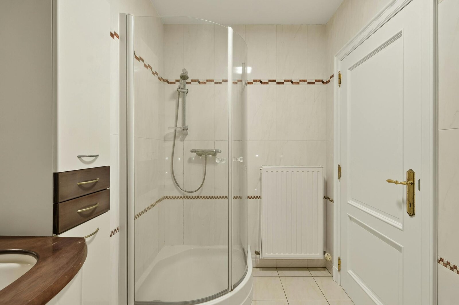 De lichtrijke woonkamer met doorkijkhaard geeft een prachtig uitzicht op de zuidgerichte tuin. De keuken is volledig uitgerust en sluit aan op het grote terras in blauwe hardsteen. De villa heeft een grote kelder met een aparte wijnkelder. Parkeren is eenvoudig dankzij een apart garagegebouw en extra parkeerplaatsen voor 4 wagens. De omheinde tuin met diverse terrassen en waterpartijen biedt volledige privacy en is eveneens toegankelijk via de Eerselingenstraat.