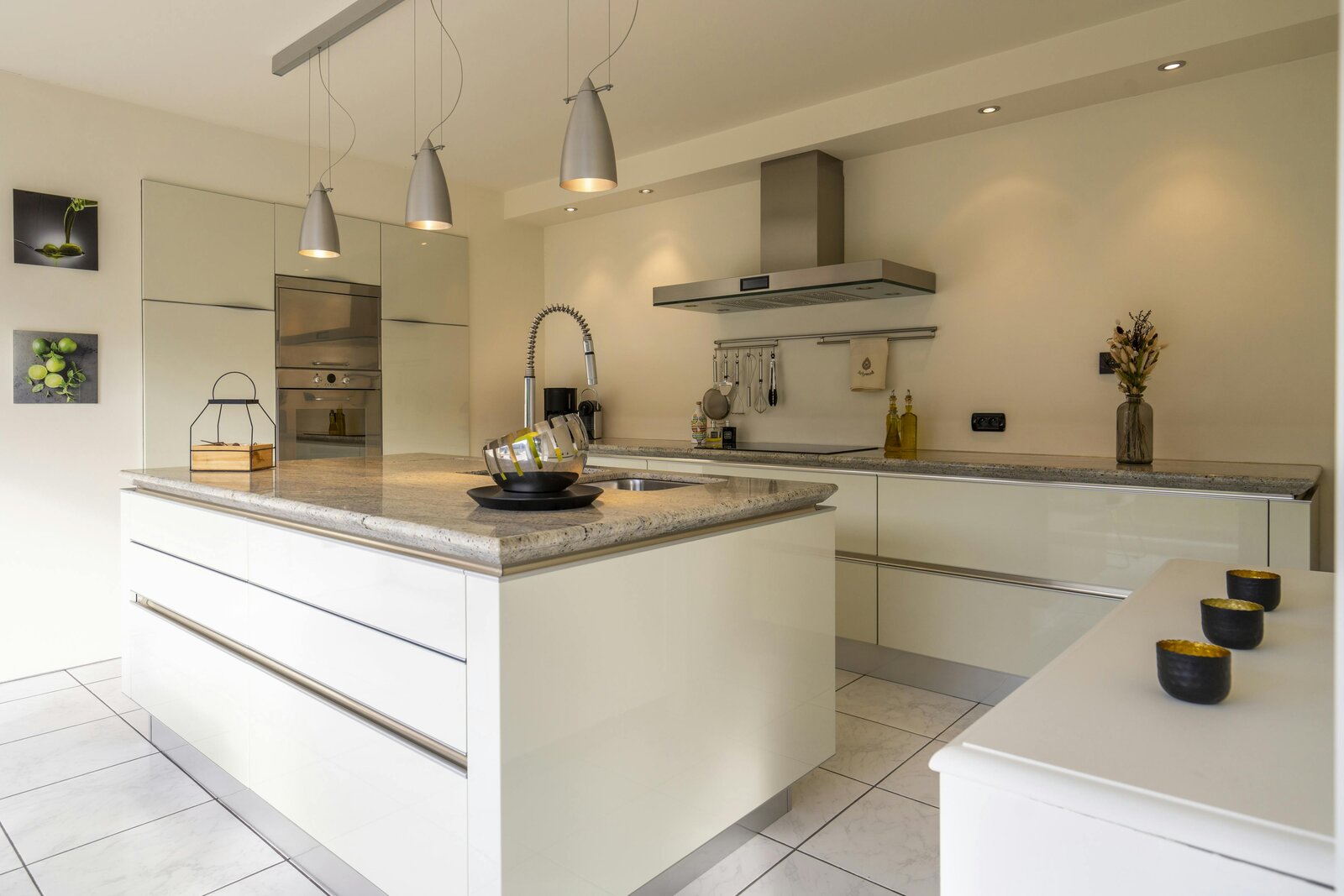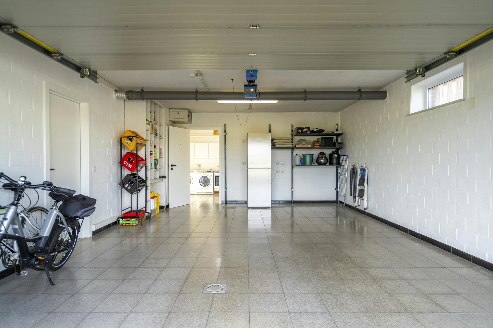 Hal - gastentoilet - bureau - leefruimte met zithoek en eetkamer - keuken - wasplaats met doucheruimte - inpandige garage
