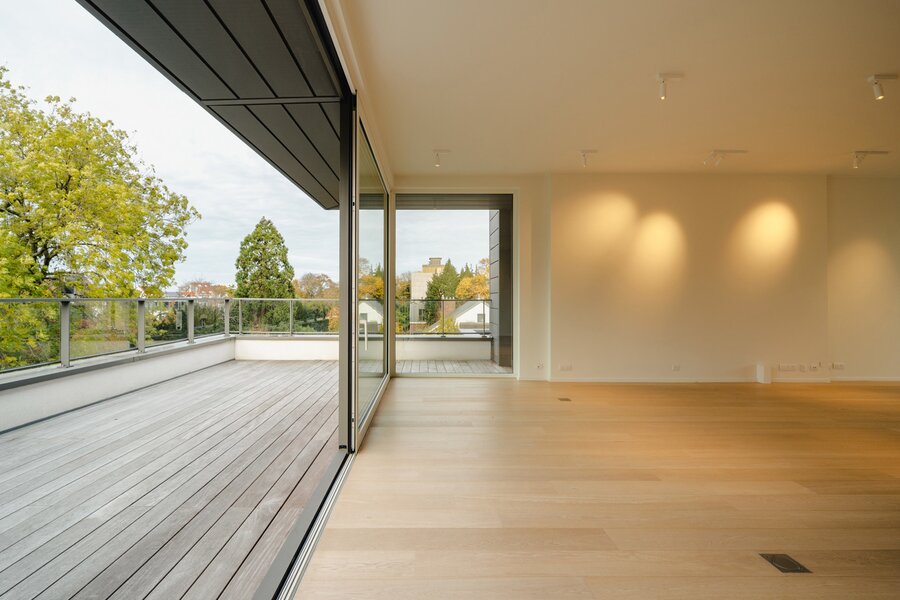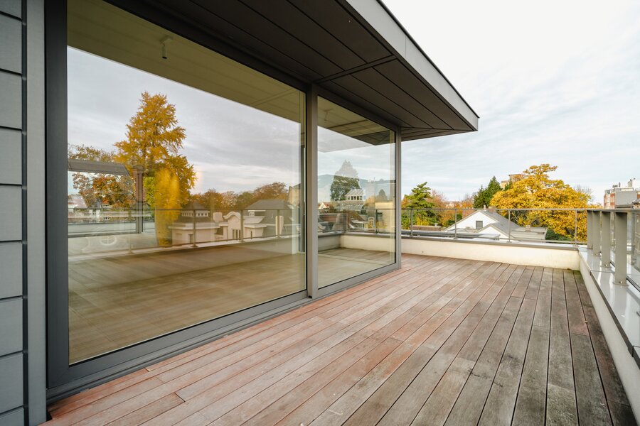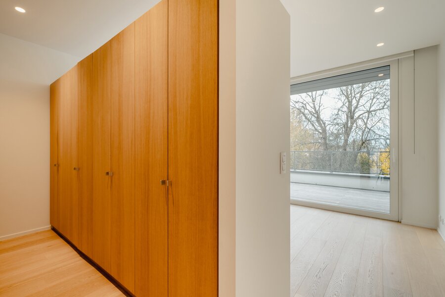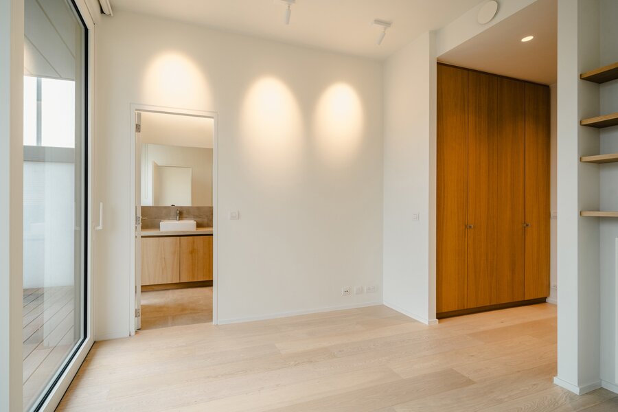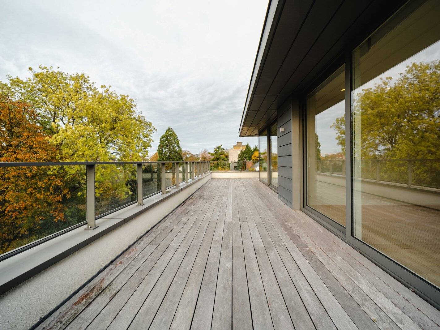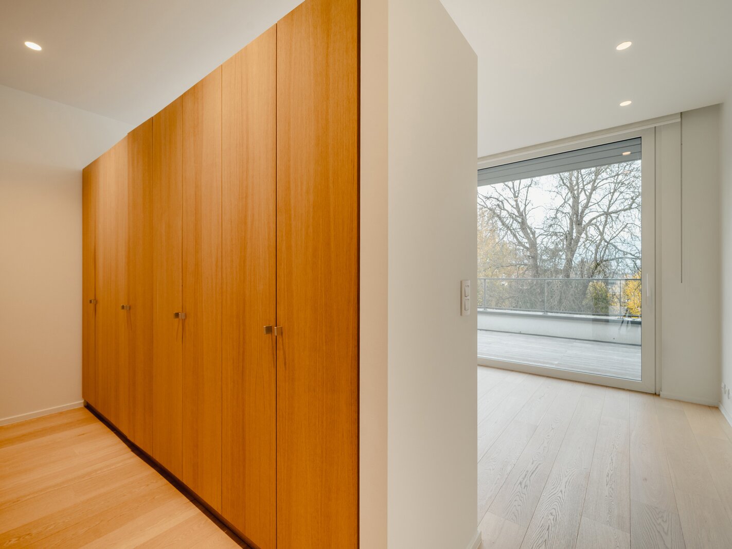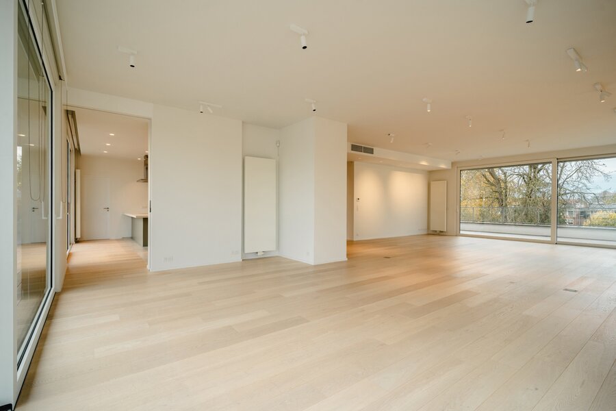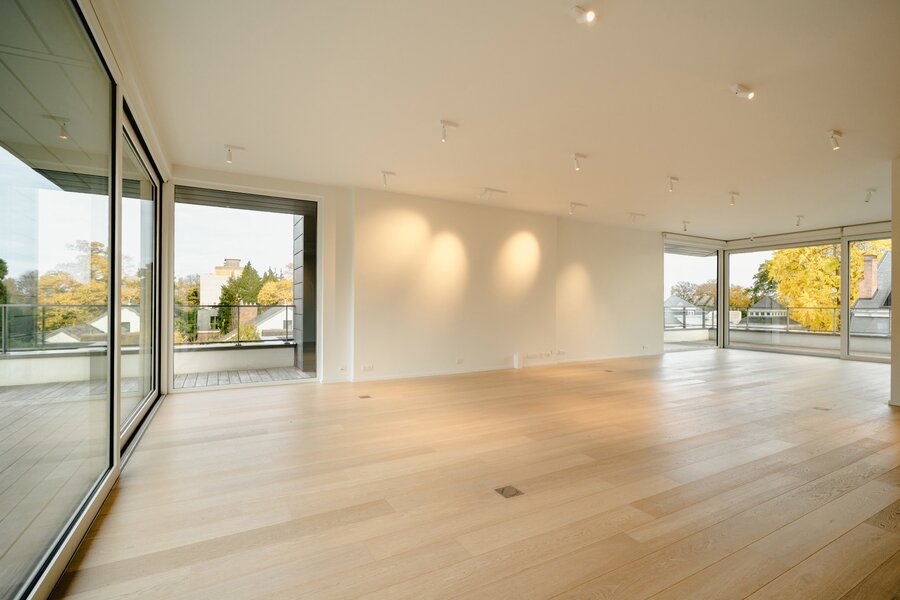 Het appartement is bereikbaar via een privélift. Het bestaat uit een hal met garderobe en gastentoilet, een ruime open woon-/eetkamer met toegang tot de terrassen aan beide zijden, en een aparte, volledig uitgeruste keuken met bijkeuken en wasruimte. De drie slaapkamers hebben elk een eigen kleedkamer en een eigen badkamer/douche, evenals toegang tot de terrassen.