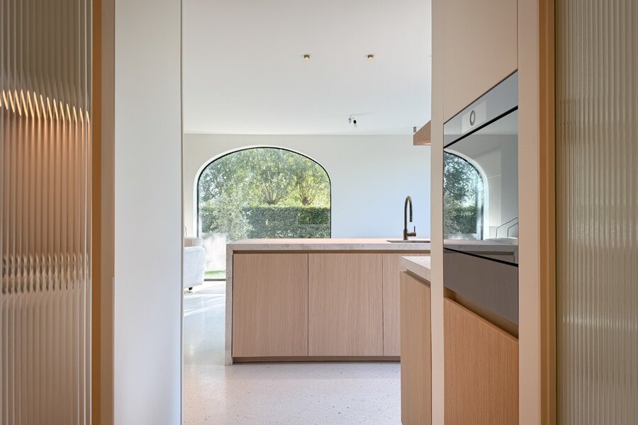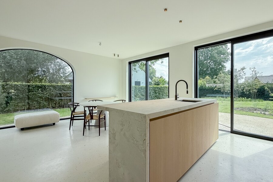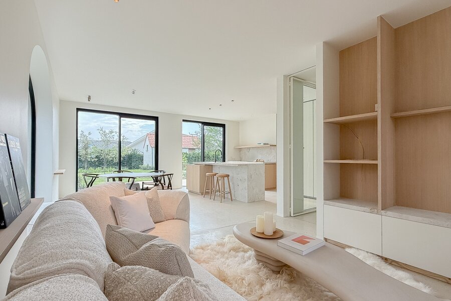 Via de elegante inkomhal bereikt u de lichte leefruimte met gezellige zithoek, eetgedeelte en toegang tot het zonnige terras en de fraai aangelegde tuin. De open keuken met kookeiland is uitgerust met kwalitatieve toestellen en beschikt over een handige bijkeuken.