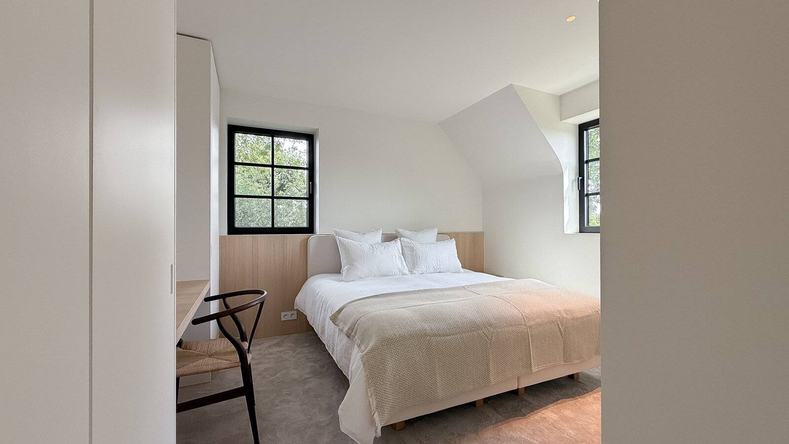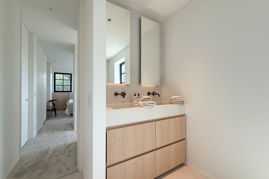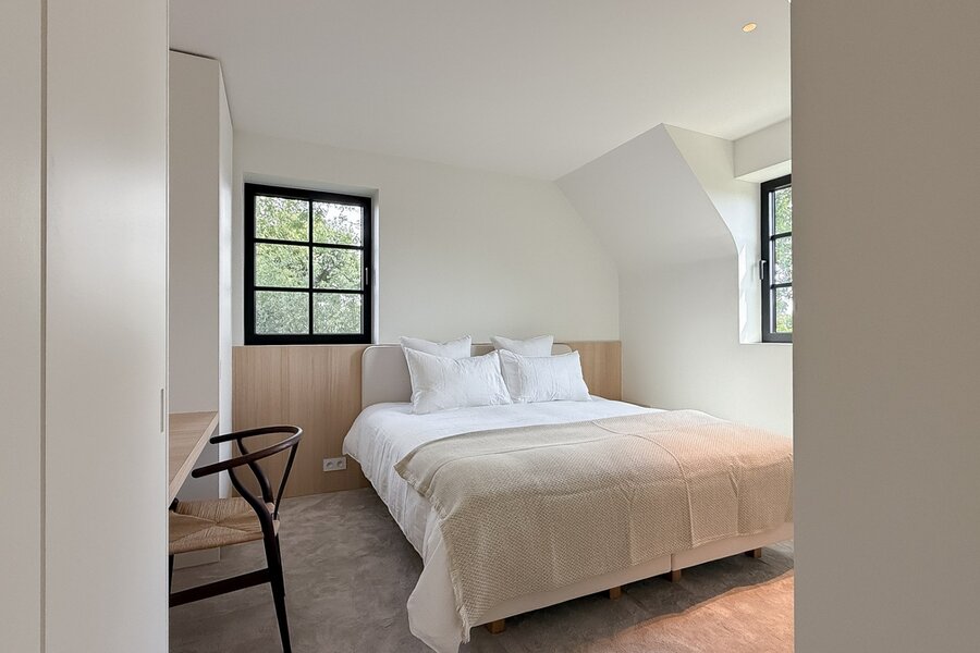 Op de eerste verdieping bevinden zich drie comfortabele slaapkamers met elk een eigen badkamer. De master suite biedt extra luxe met dressing en ensuite badkamer. De bovenverdieping omvat een ruime vierde slaapkamer met douchekamer en een vijfde polyvalente kamer.