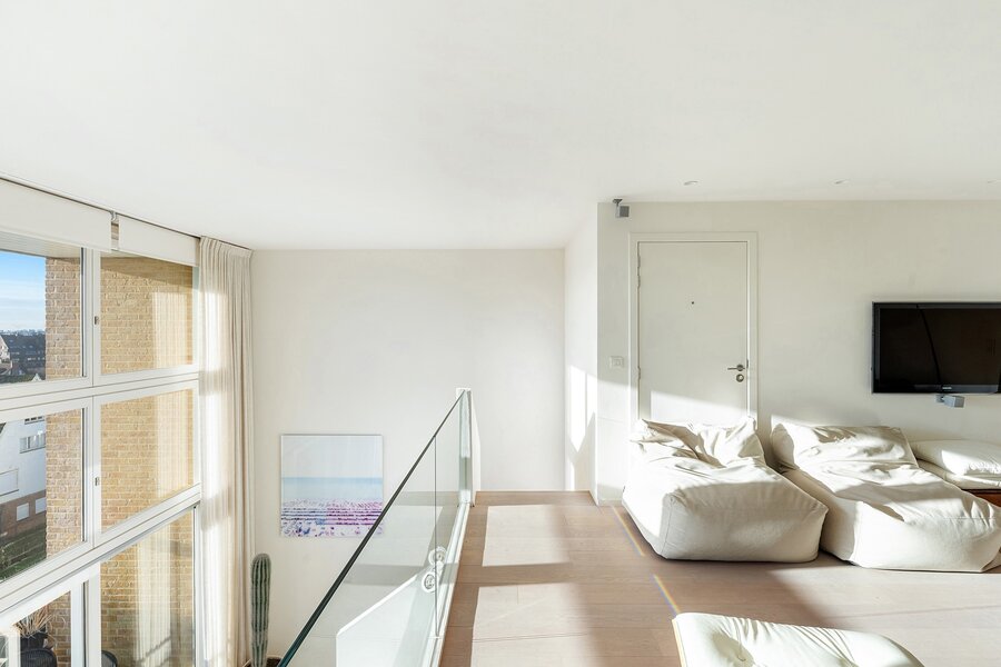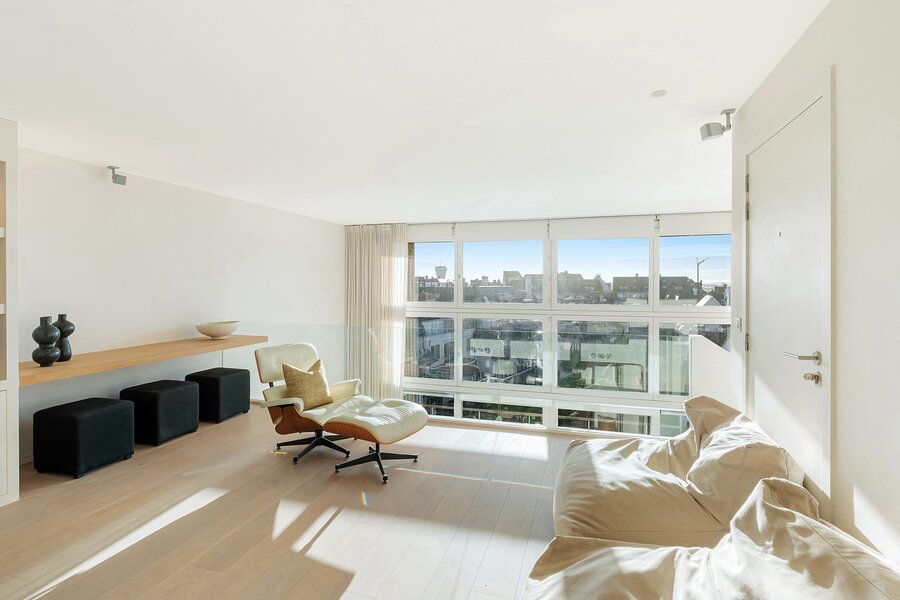 Zesde verdieping: inkom, brede en lichtrijke leefruimte met grote raampartijen en toegang tot het brede zuidgerichte terras ( 2 meter breed) met open zicht over de villawijk, quasi geen inkijk, moderne open keuken voorzien van alle Miele toestellen. Achteraan op het leefniveau bevinden zich twee ruime slaapkamers uitgevend op een achterterras, een grote badkamer met inloopdouche en een dressing (welke ook kan dienst doen als voorraadkamer of extra berging). Gastentoilet apart.