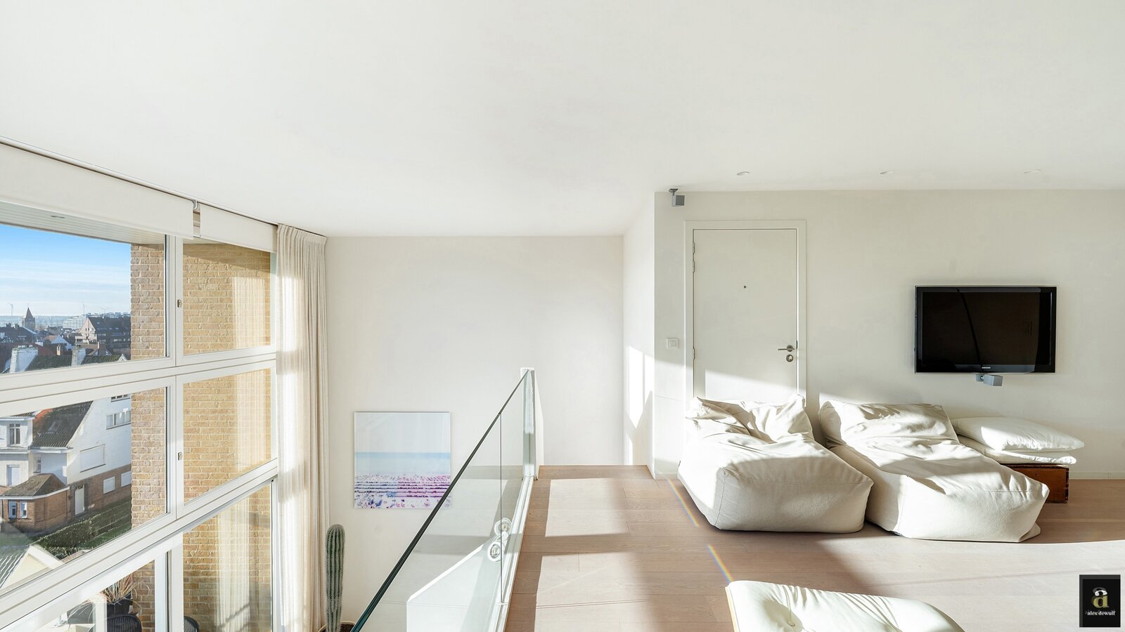Op de boven verdieping (niv 7): een comfortabele zitruimte/televisiekamer op de mezzanine met zicht over de villa’s van Duinbergen, twee grote slaapkamers voor dubbele bedden. De master bedroom met en-suite douchekamer, een gastenkamer met plaats voor dubbel bed en een eigen douchekamer, een berging met aansluitingen voor wasmachine en droogkast. De verdieping is ook bereikbaar via de gemeenschappelijke lift.