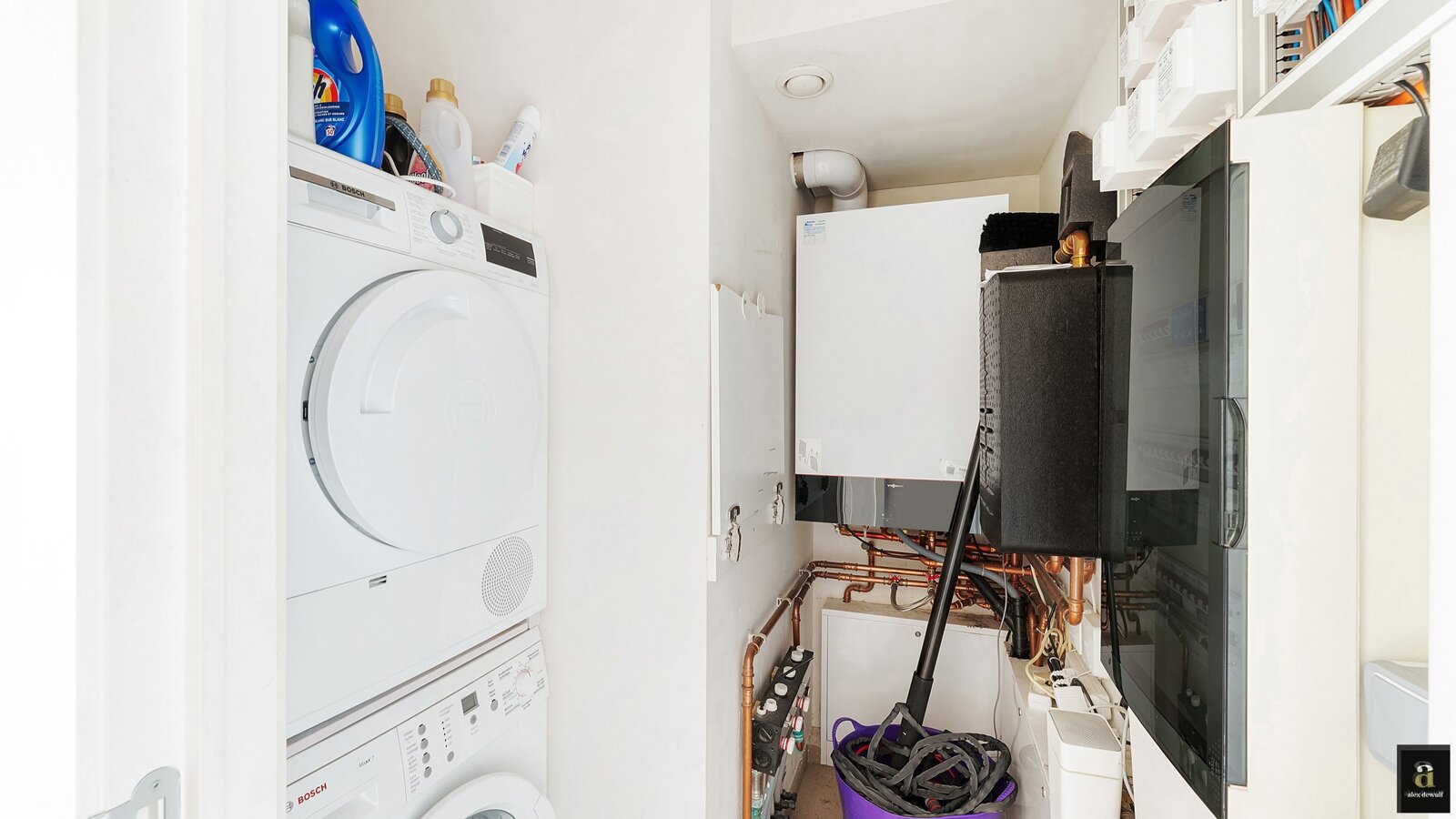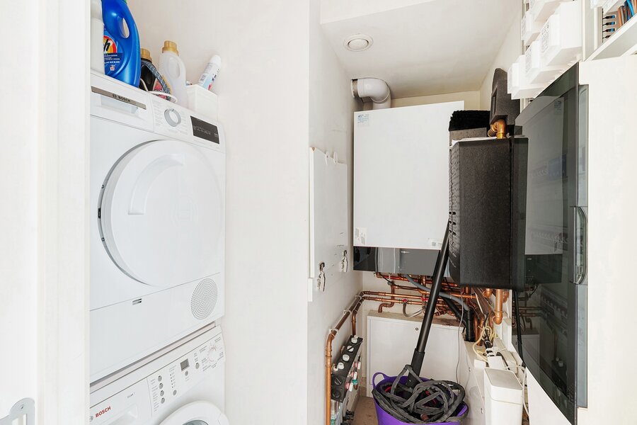 Individuele nutsvoorzieningen (water, gas, elektriciteit), ventilatiesysteem type C, condenserende ketel en vloerverwarming in de leefruimtes.