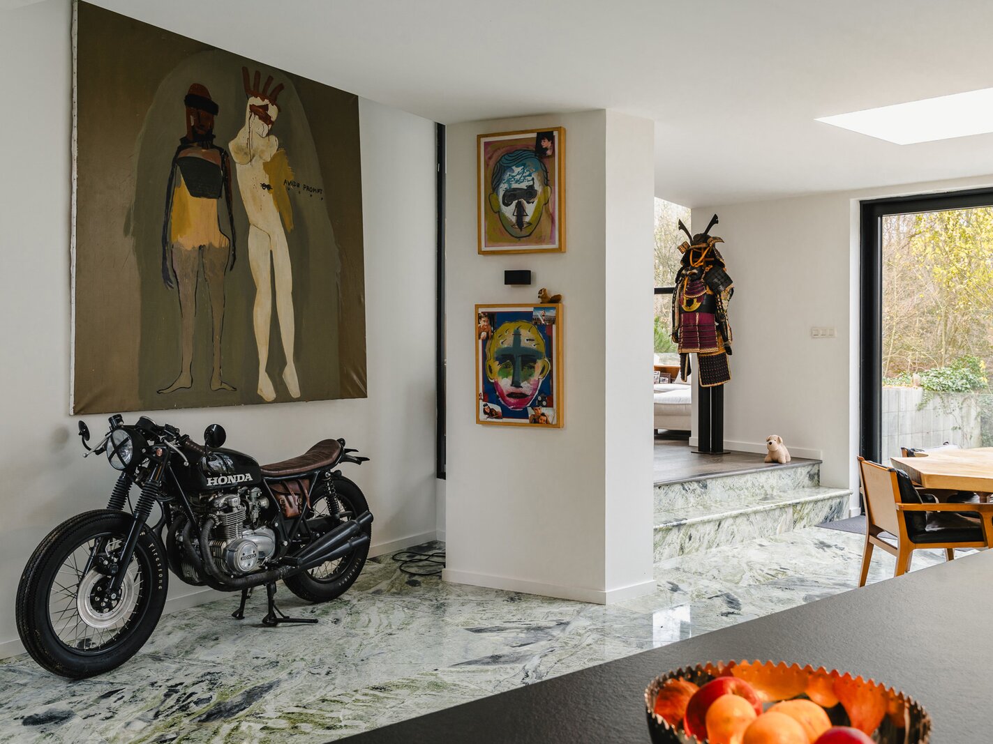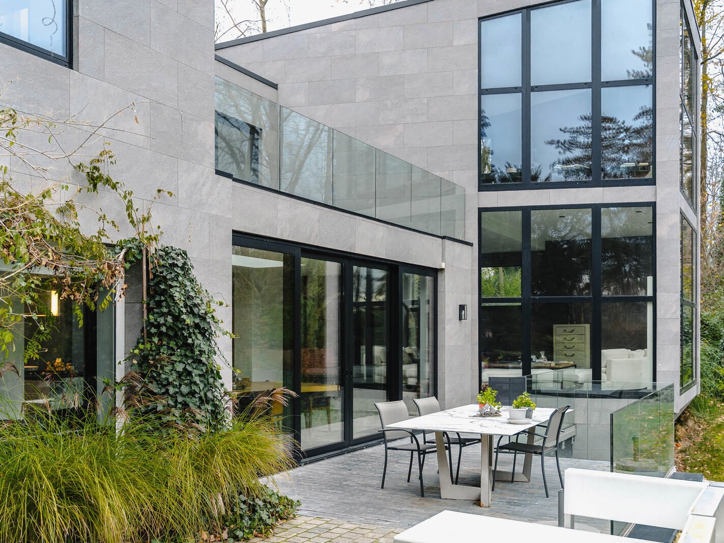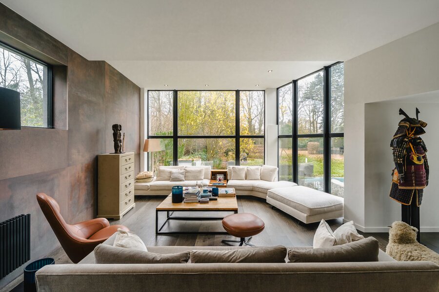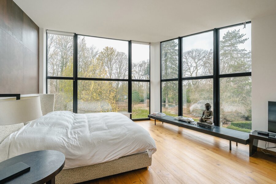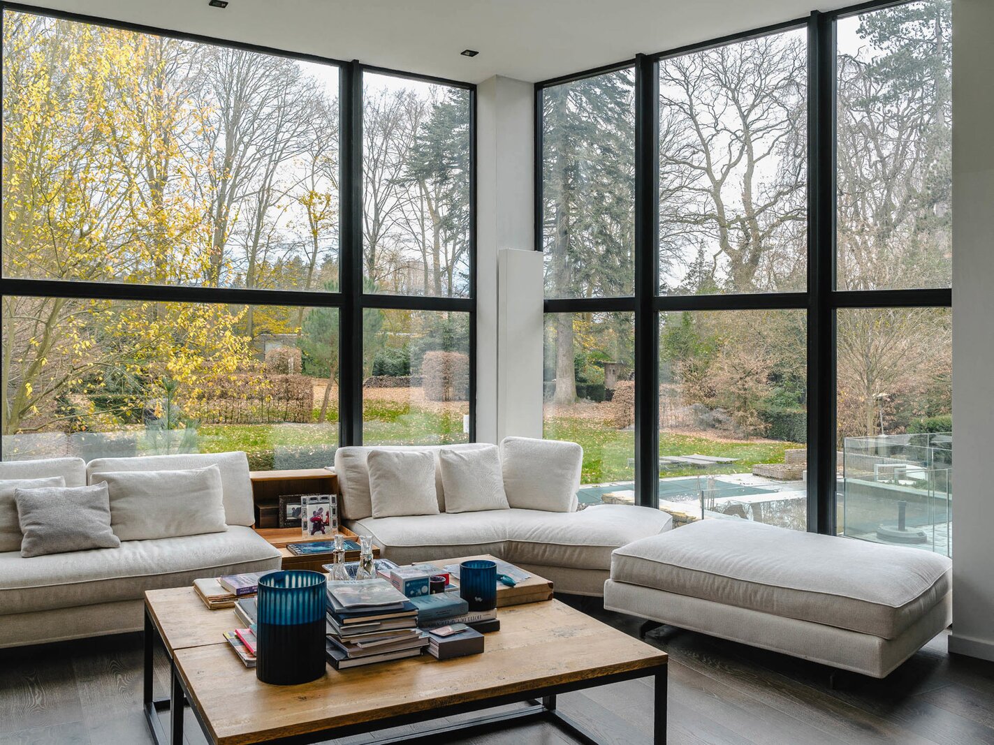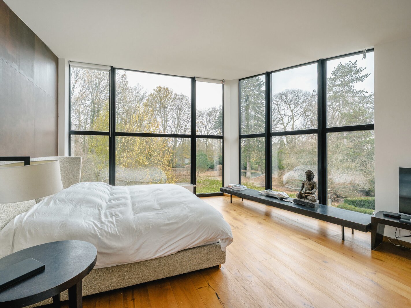 De villa is zeer licht en horizontaal ingedeeld en bestaat op de begane grond uit een inkomhal, een eerste woonkamer met open haard, een bureau, een grote eetkamer, een open keuken en een tweede woonkamer met een groot bureau, die allemaal uitkomen op het terras en de tuin, en een volledig uitgeruste halfopen keuken met ontbijthoek. Aan de slaapzijde bevinden zich 4 slaapkamers met elk een eigen badkamer/douche, waarvan twee echte master suites met kleedkamer.