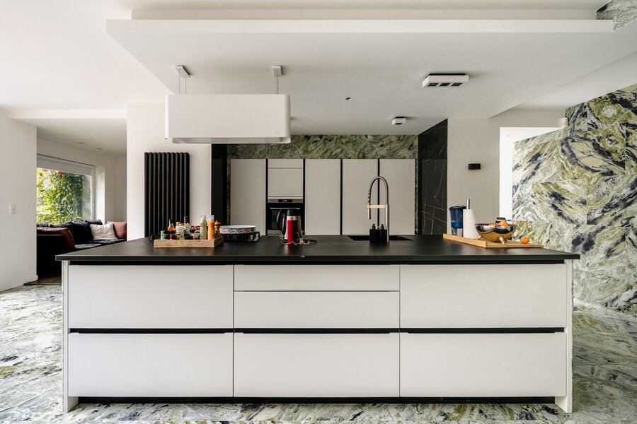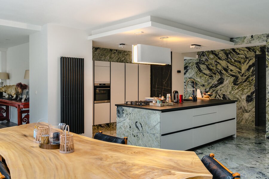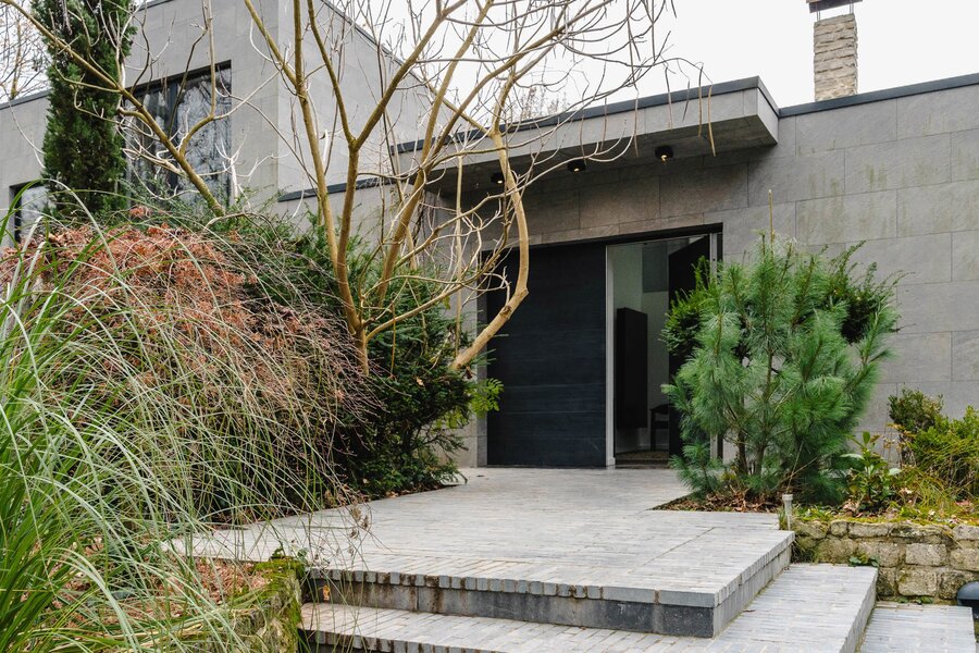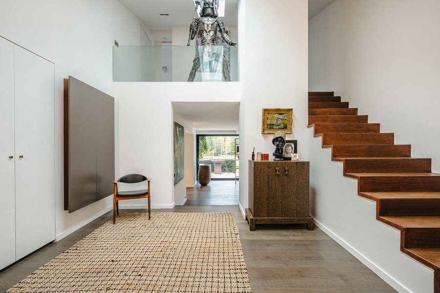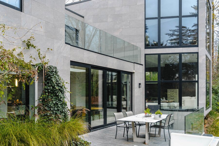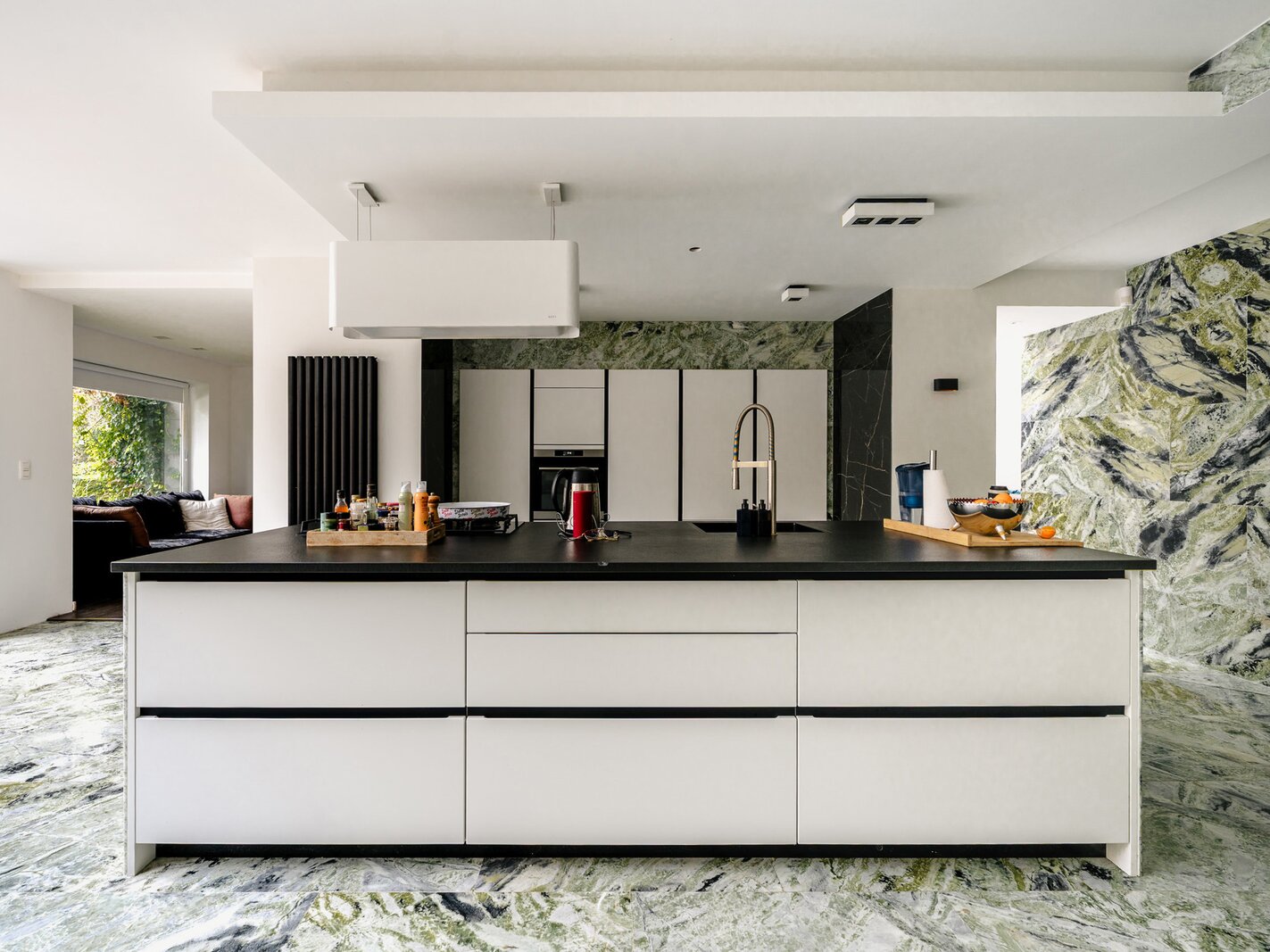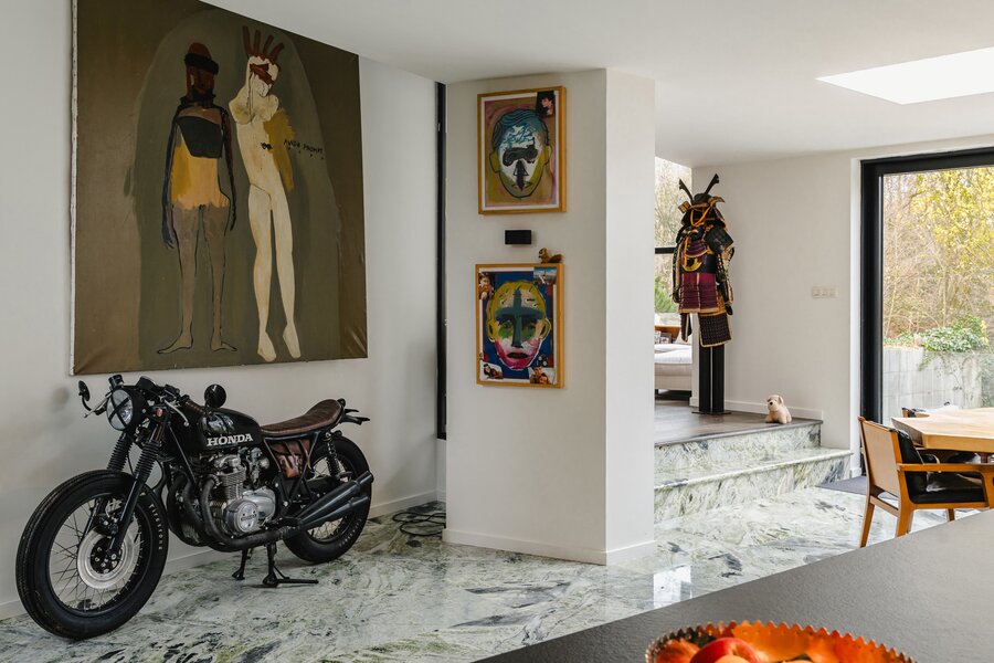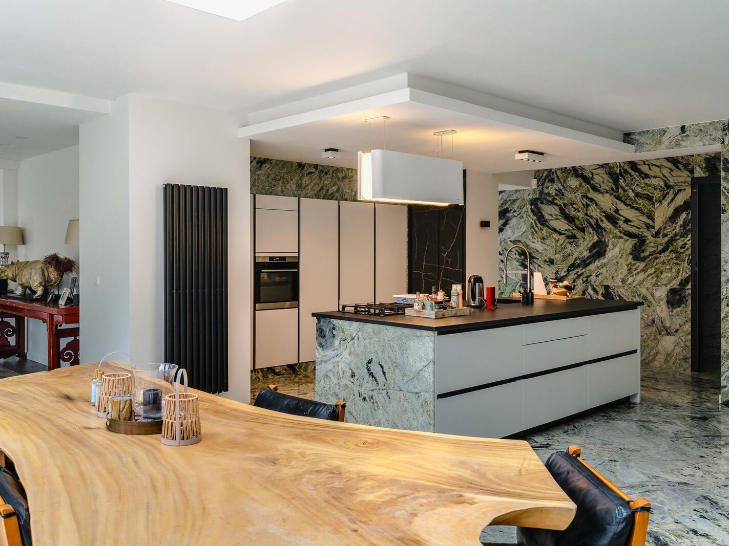 De villa is zeer licht en horizontaal ingedeeld en bestaat op de begane grond uit een inkomhal, een eerste woonkamer met open haard, een bureau, een grote eetkamer, een open keuken en een tweede woonkamer met een groot bureau, die allemaal uitkomen op het terras en de tuin, en een volledig uitgeruste halfopen keuken met ontbijthoek. Aan de slaapzijde bevinden zich 4 slaapkamers met elk een eigen badkamer/douche, waarvan twee echte master suites met kleedkamer.