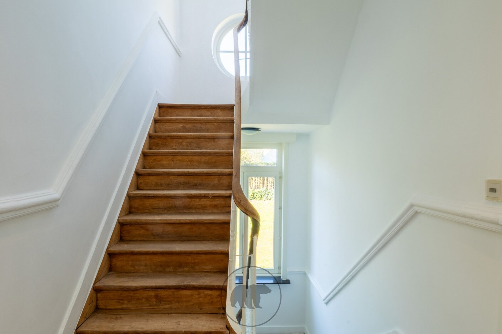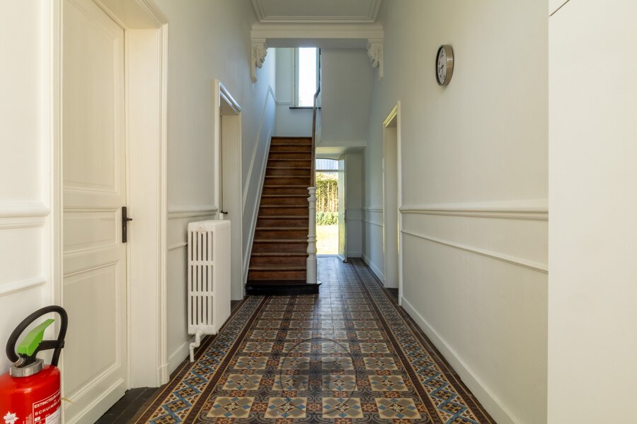 Binnenin heeft de woning een klassieke indeling. Het gelijkvloers bestaat uit een ruime lichtrijke leefruimte met marmeren schouwmantels, een bureel en een ingerichte leefkeuken. Er is een ruime kelderverdieping van 120 vierkante meter.