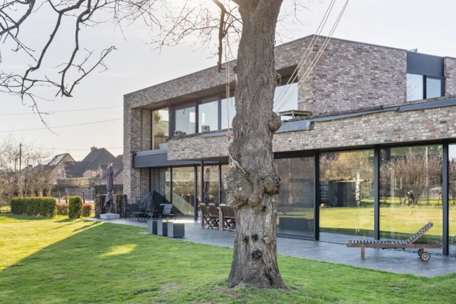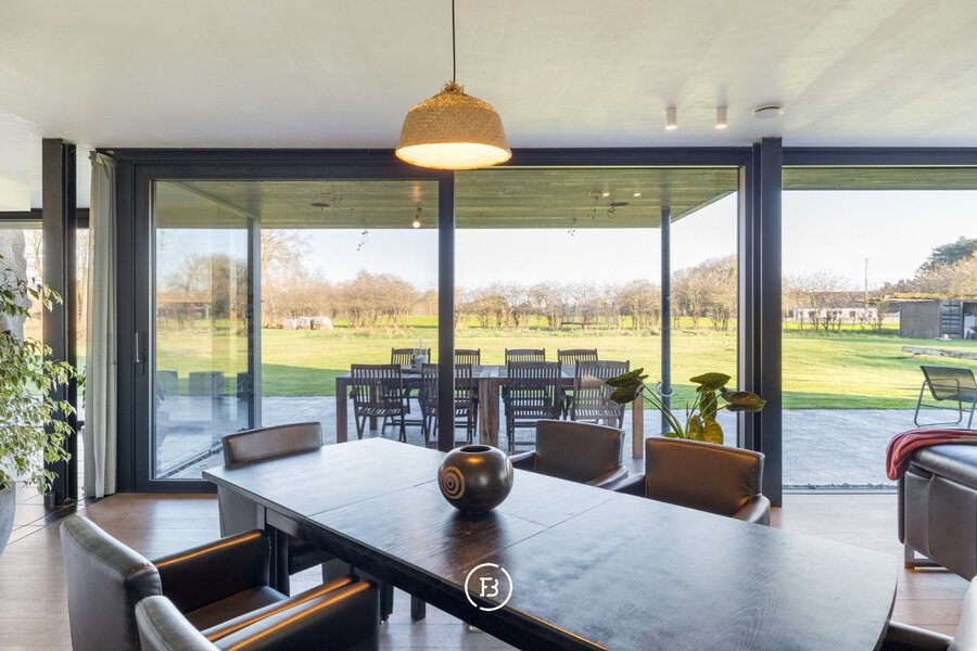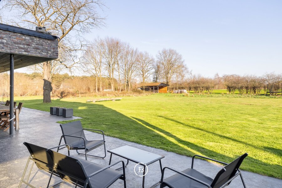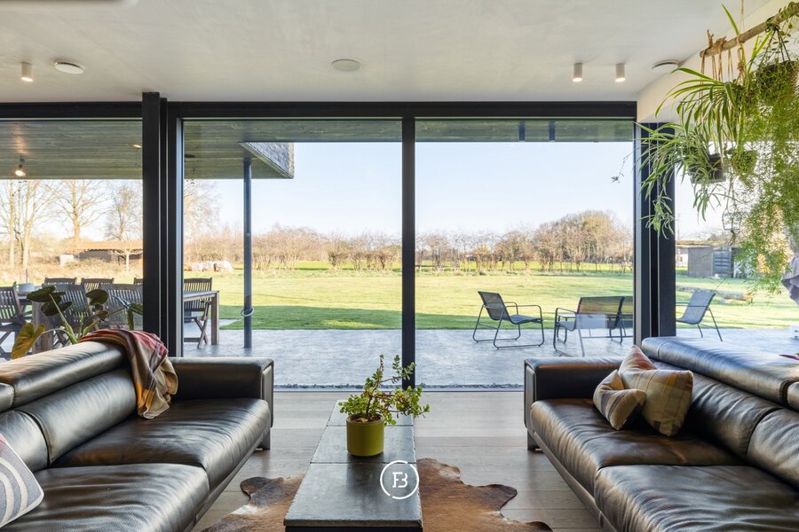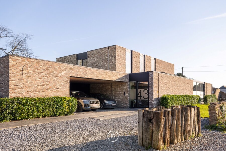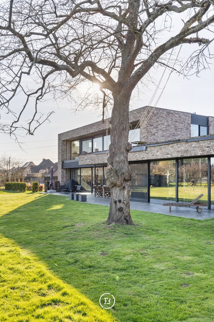 Deze moderne villa uit 2016 is gelegen op een uitzonderlijk breed perceel van ruim een halve hectare (5.016 m²) en combineert hedendaags comfort met een rustige, groene omgeving. Het ontwerp kenmerkt zich door een tijdloze architectuur, waarbij de indrukwekkende raampartijen zorgen voor een uitzonderlijke lichtinval en een naadloze overgang tussen binnen en buiten.
