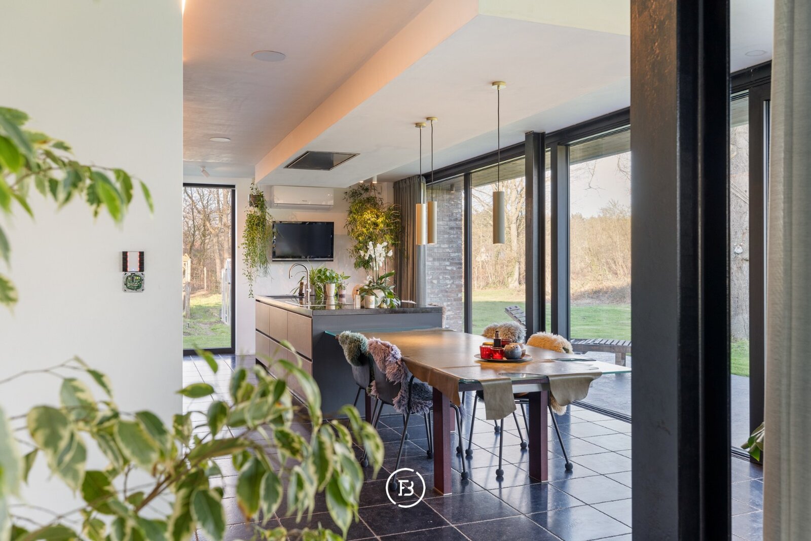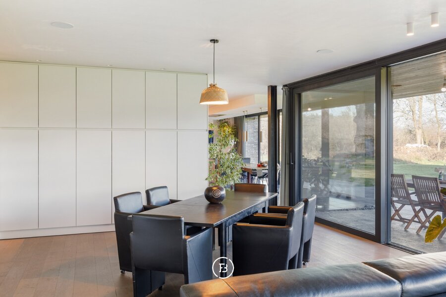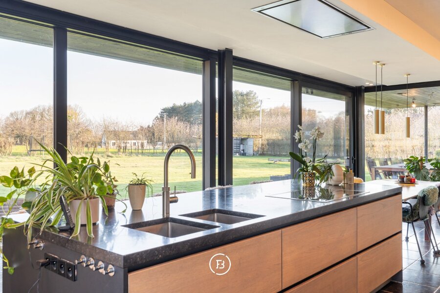 De keuken is volledig uitgerust met premium toestellen van Gaggenau en een Quooker-kraan. Van hieruit, alsook de gehele leefruimte, geniet u van een weids vergezicht over de zuidoost georiënteerde tuin en de achterliggende natuur.
